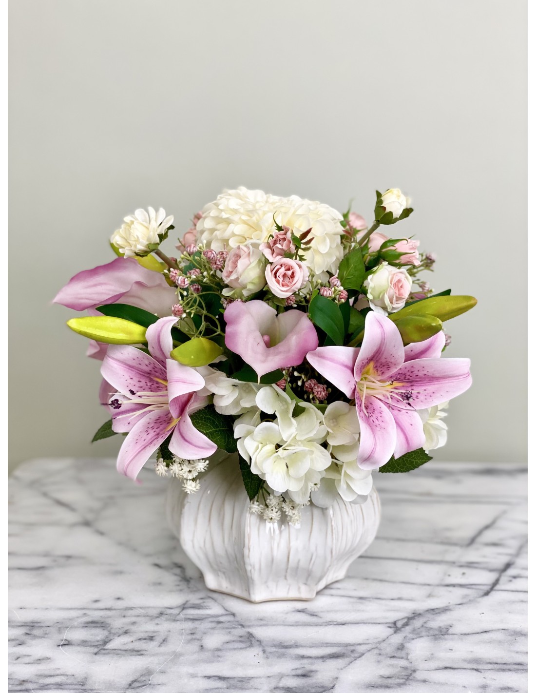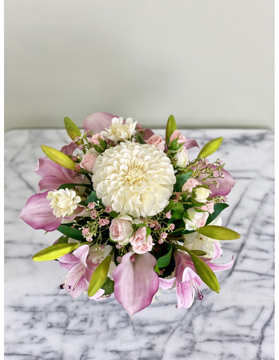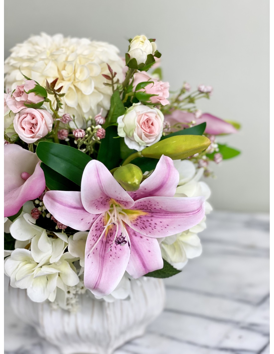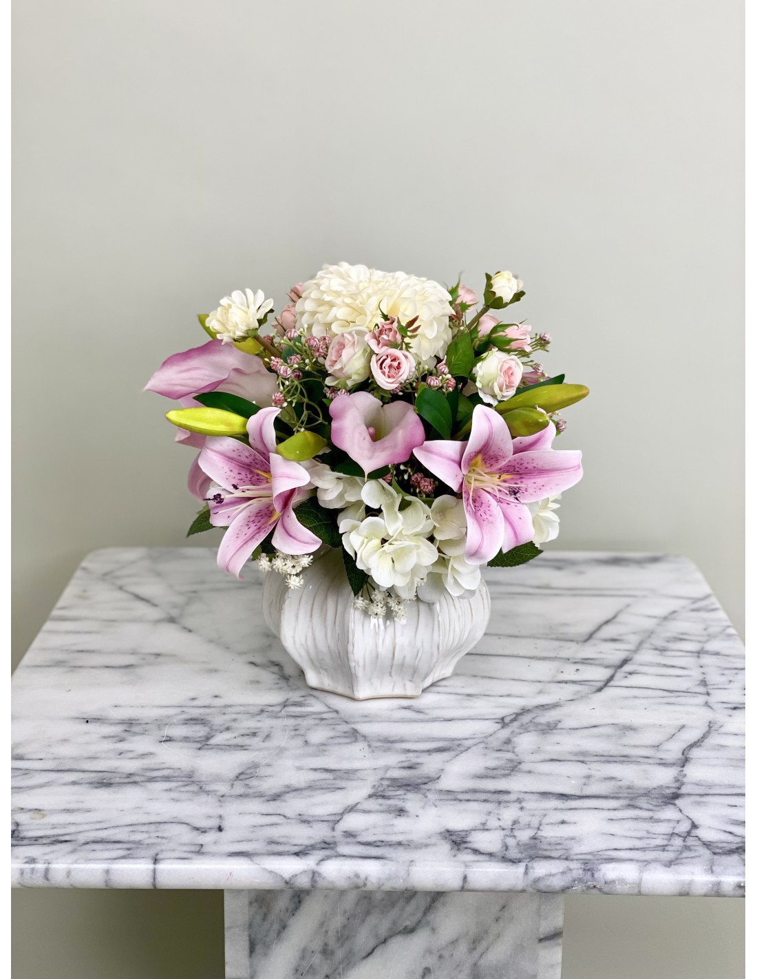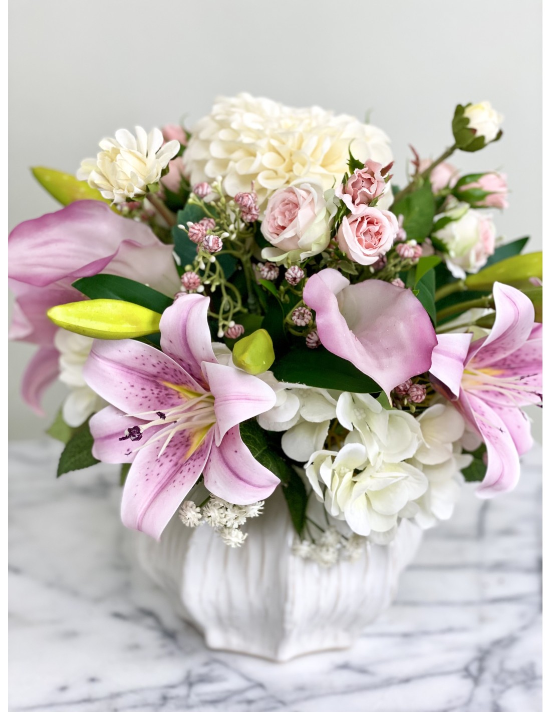 In einem runden Keramikgefäß angefertigtes Seidenblumengesteck mit verschiedenen Rosenblüten, Chrysantheme, Lilien, Callas, Beiwerk und unterschiedlichen Gräsern.