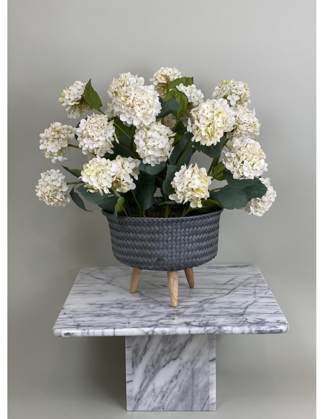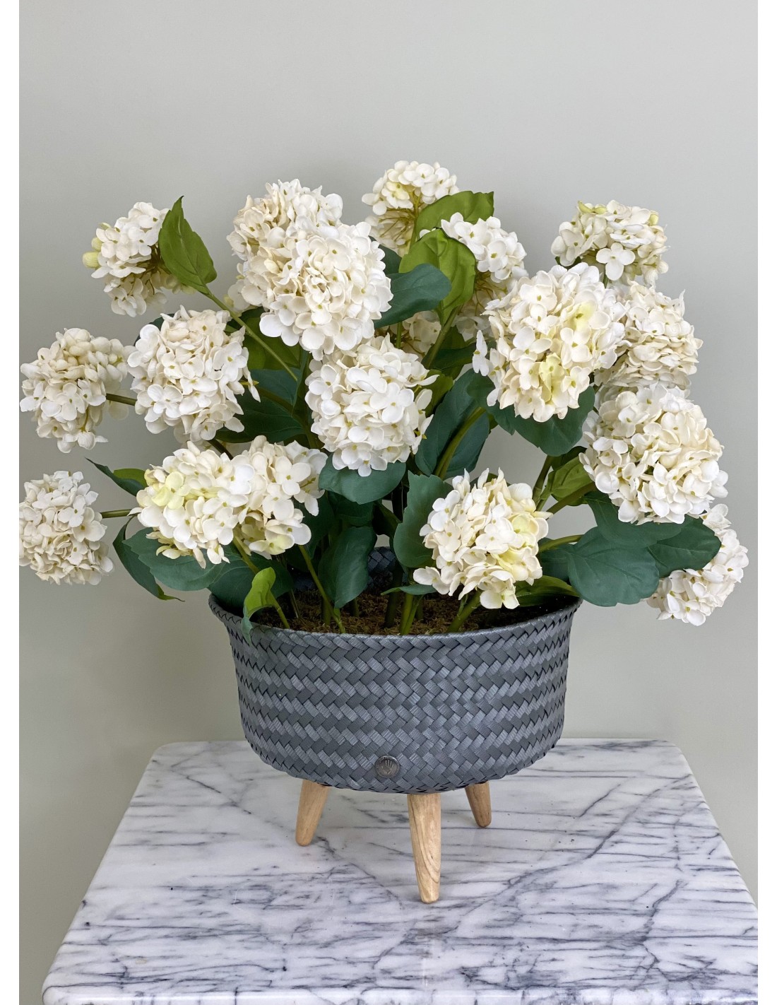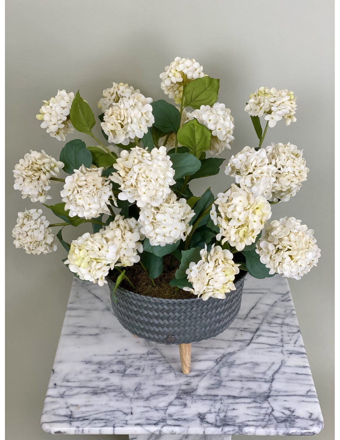 Ein hochwertiges künstliches Hortensien-Arrangement in einem Rattantopf