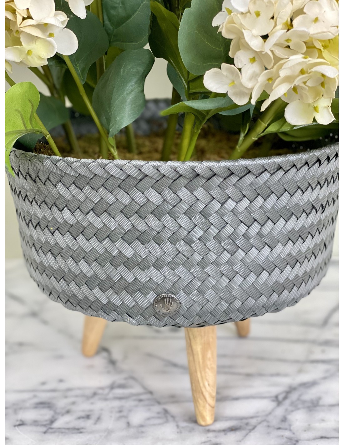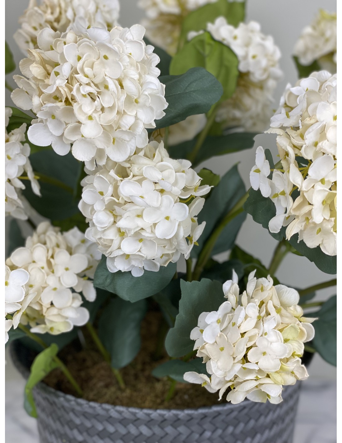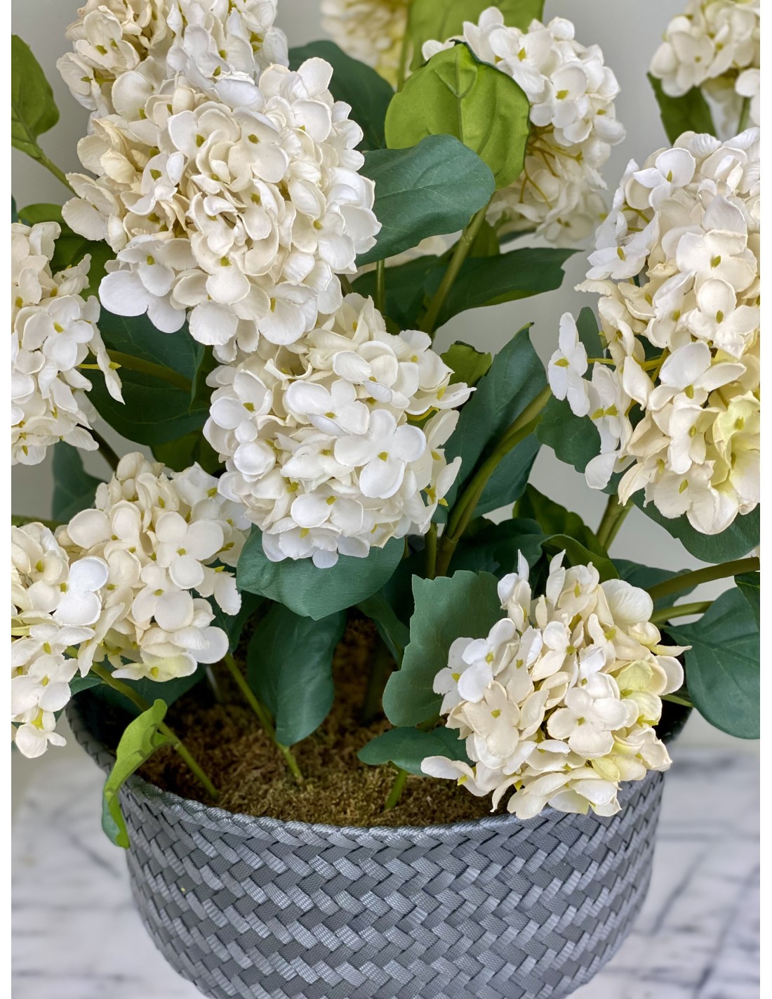 Ein hochwertiges künstliches Hortensien-Arrangement in einem Rattantopf