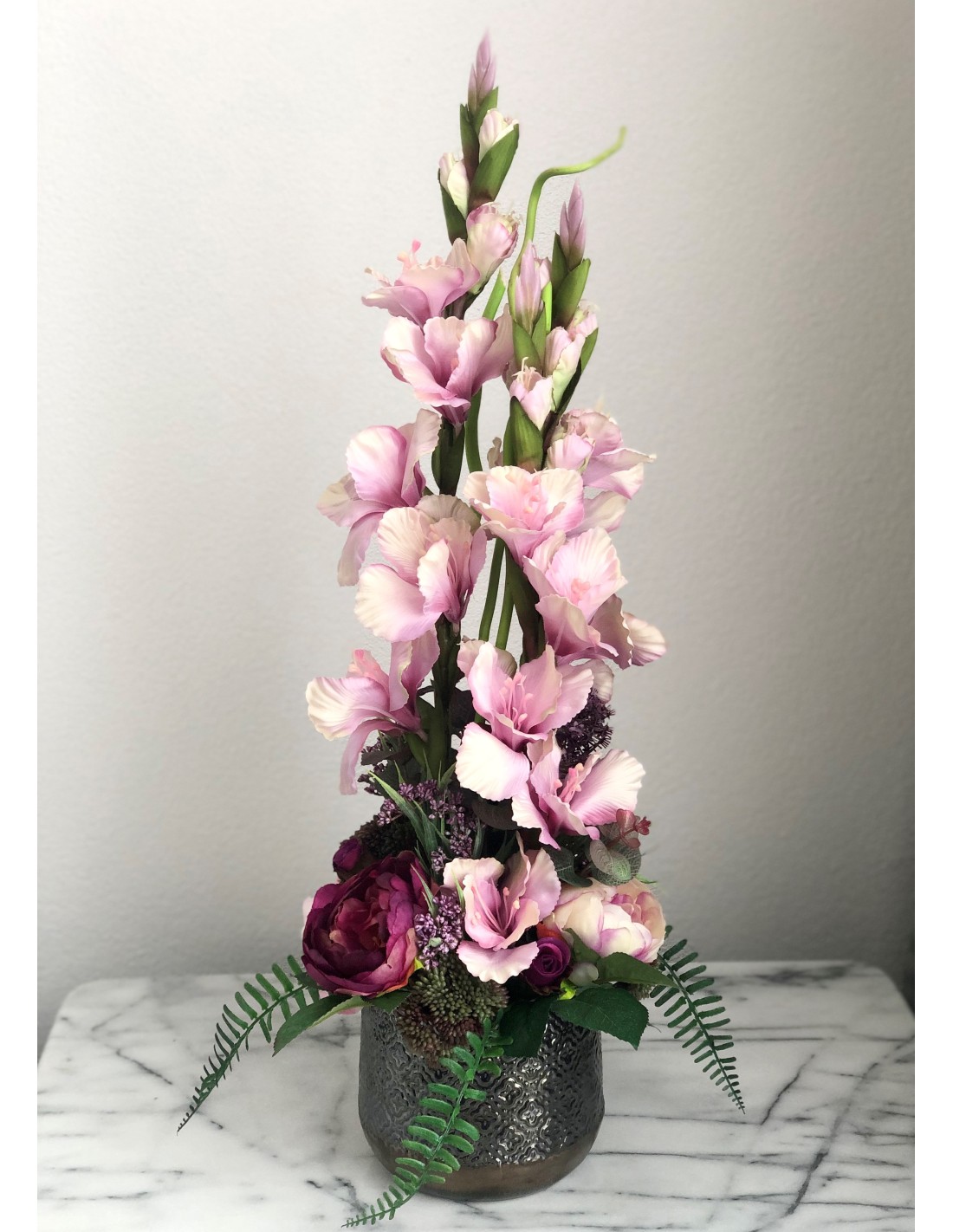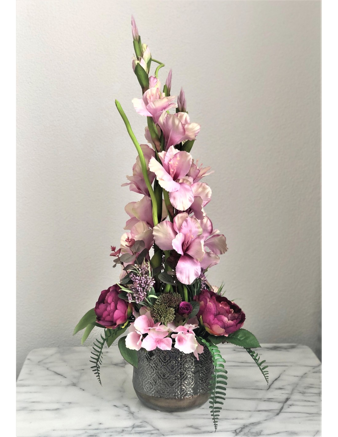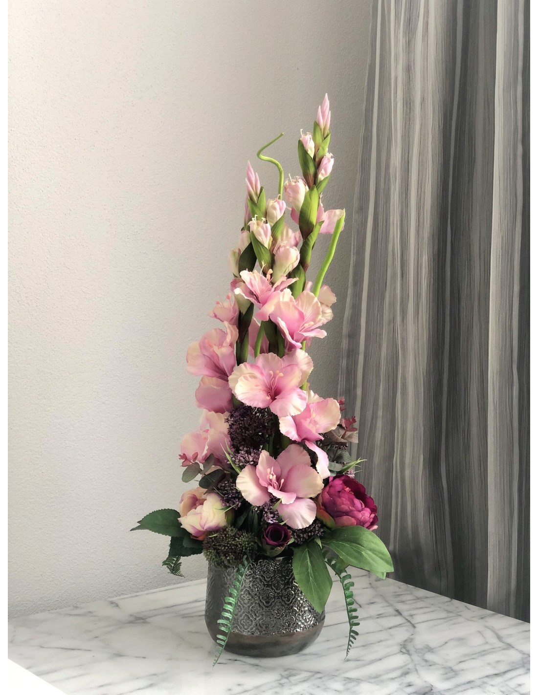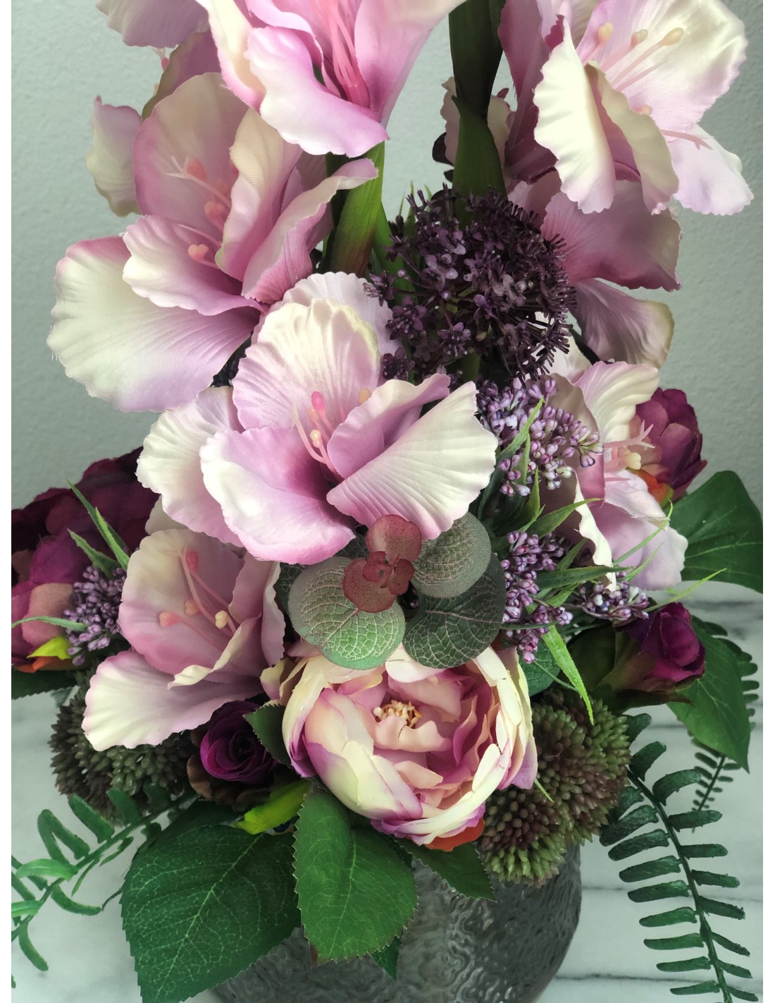 In einem runden Keramikgefäß angefertigtes Seidenblumengesteck mit verschiedenen Rosenblüten, Peonies, Gladiolen, Beiwerk und unterschiedlichen Gräsern.
