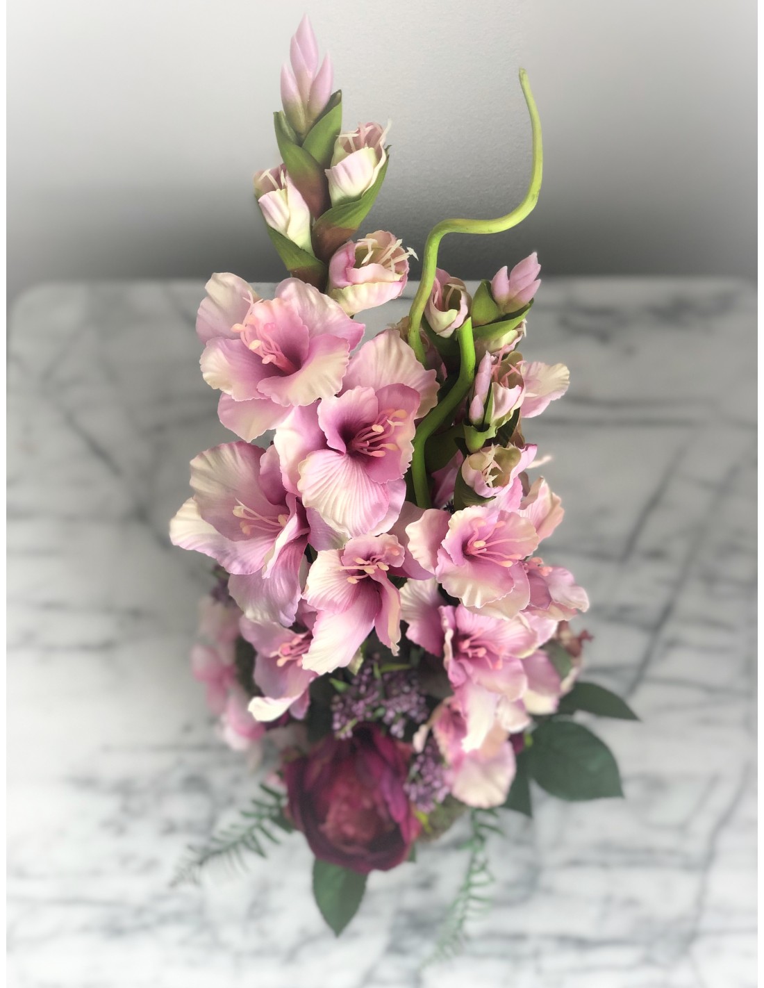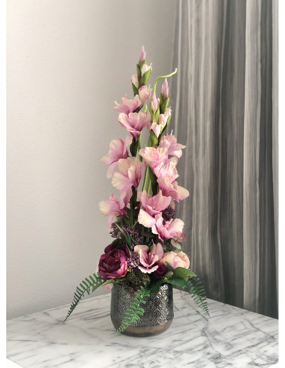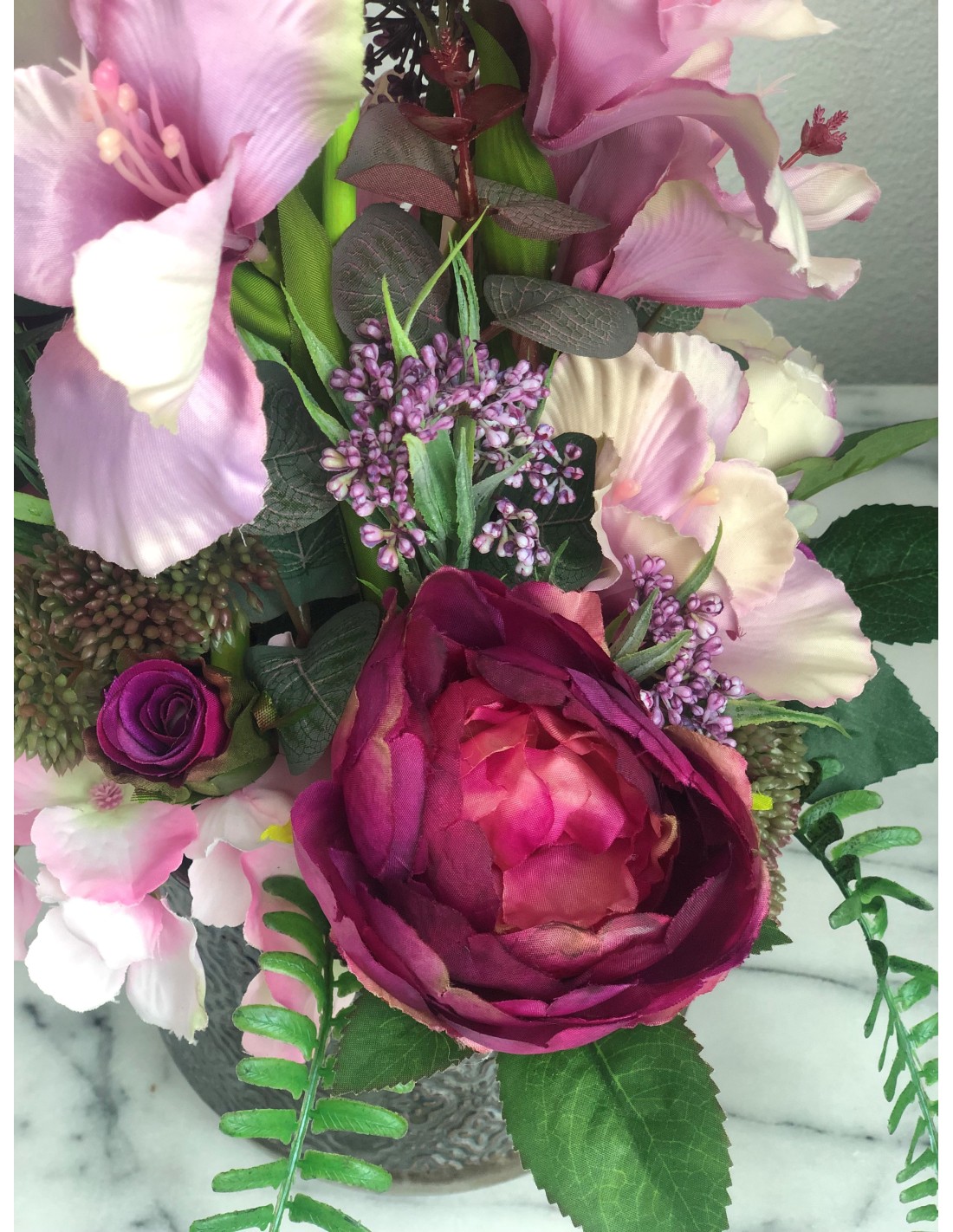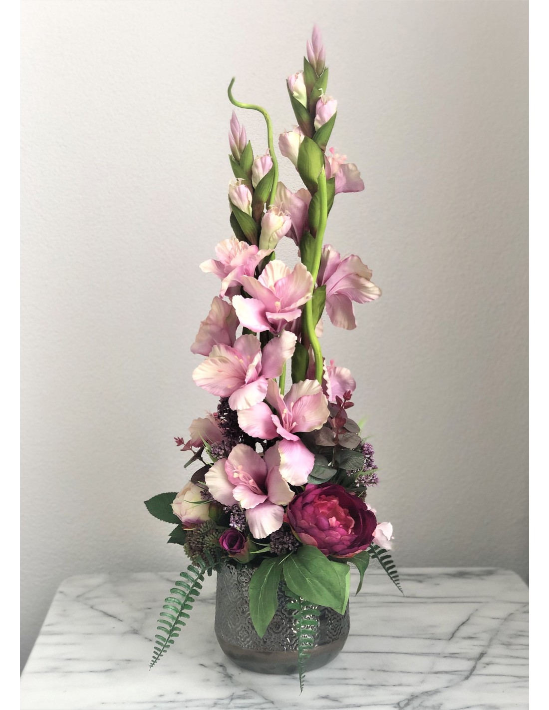 In einem runden Keramikgefäß angefertigtes Seidenblumengesteck mit verschiedenen Rosenblüten, Peonies, Gladiolen, Beiwerk und unterschiedlichen Gräsern.