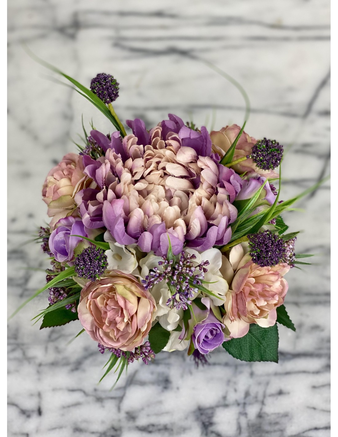 Unsere Seidenblumen-Gestecke sind individuell angefertigte Einzelstücke und können auch nur einmal genau in dieser Art zu bestellt werden. Auf Wunsch fertigen wir Ihnen auch weitere sehr ähnliche Arrangements an.