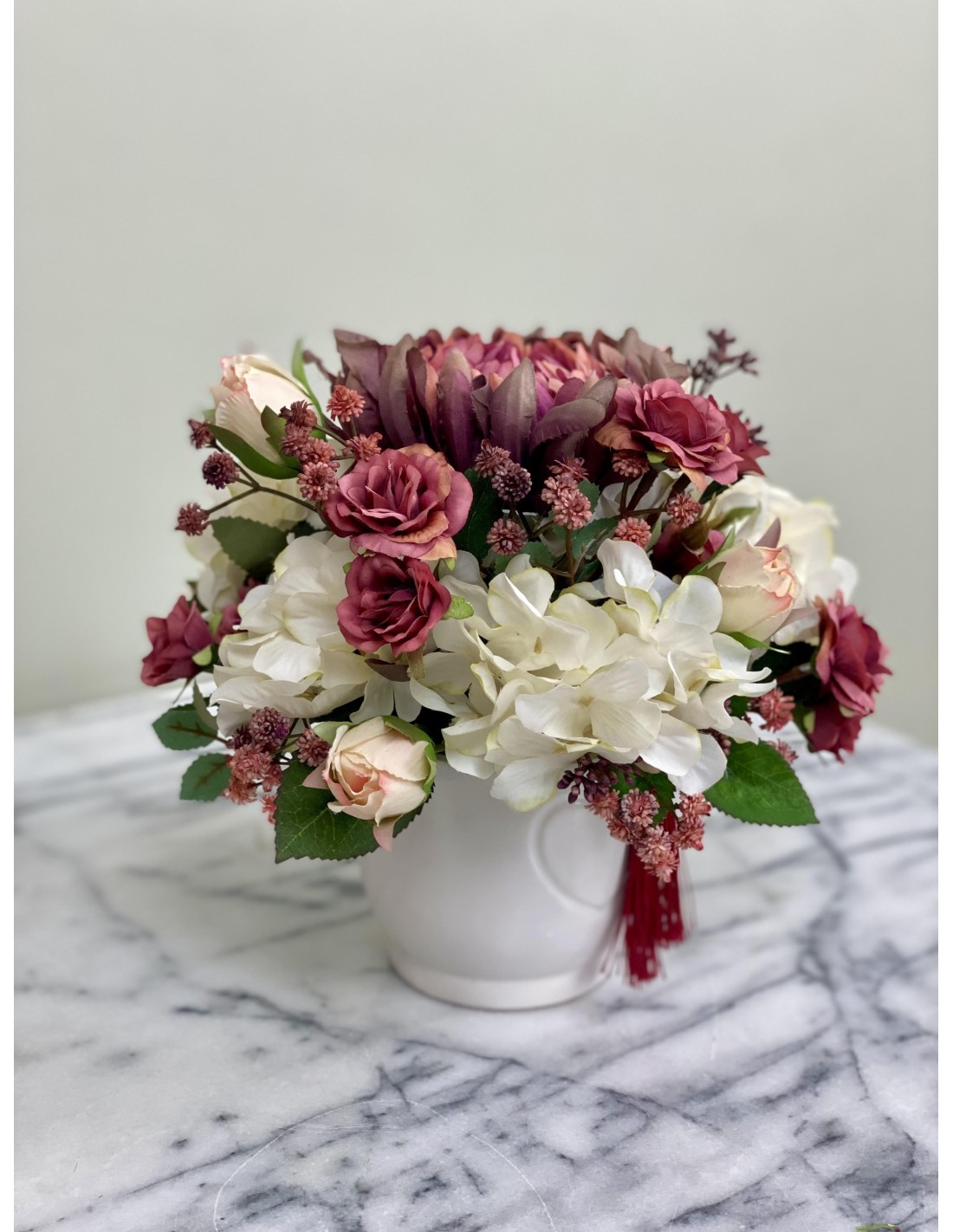 Unsere Seidenblumen-Gestecke sind individuell angefertigte Einzelstücke und können auch nur einmal genau in dieser Art zu bestellt werden. Auf Wunsch fertigen wir Ihnen auch weitere sehr ähnliche Arrangements an.