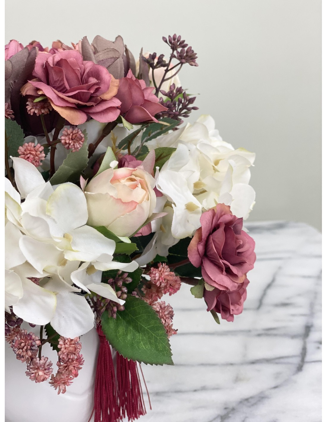 In einem runden Keramikgefäß angefertigtes Seidenblumengesteck mit verschiedenen Rosenblüten, Chrysantheme, Hortensien, Schleierkraut, Beiwerk und unterschiedlichen Gräsern.