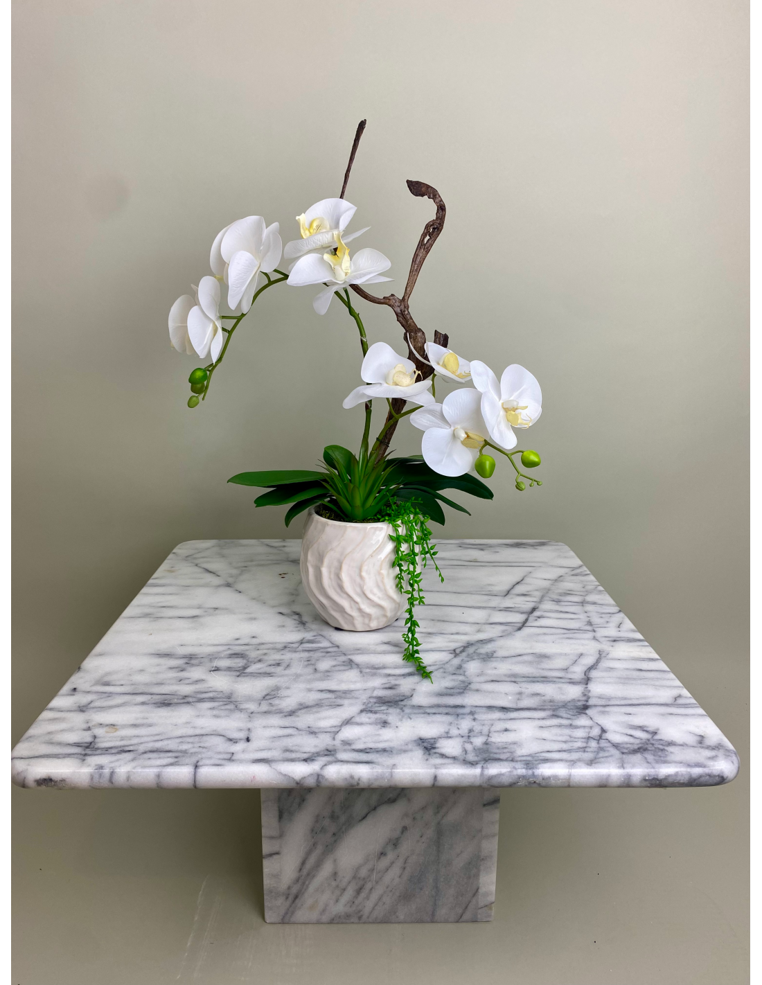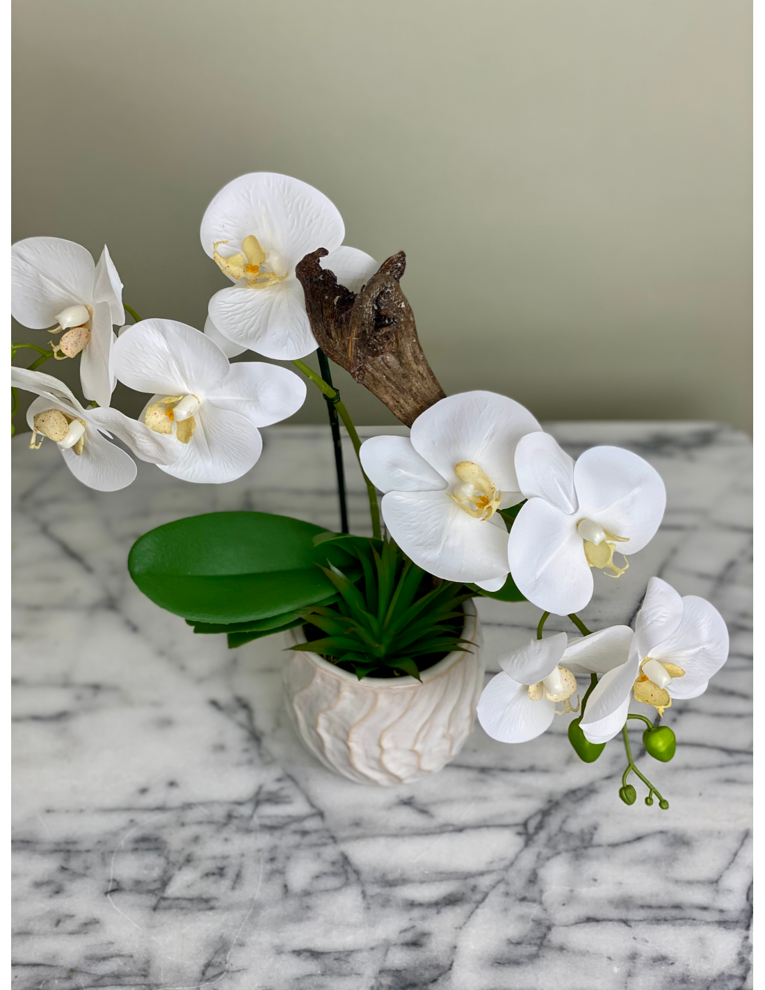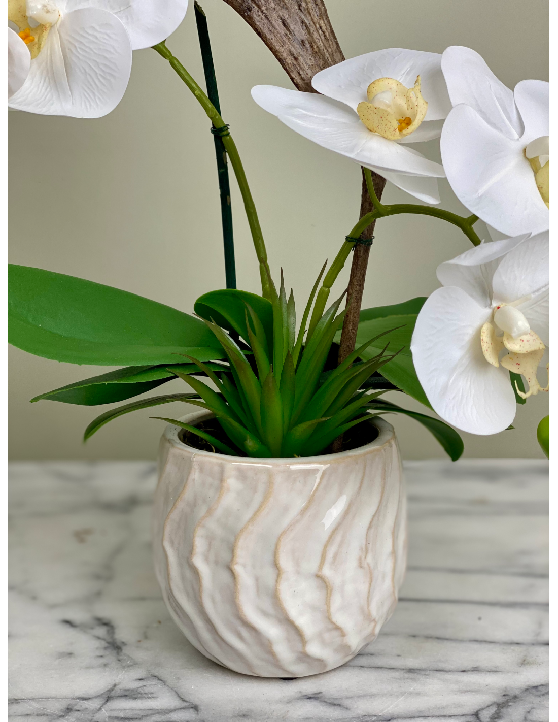 Diese edle künstliche Orchidee bringt zeitlose Eleganz in jeden Raum. Die detailgetreu gefertigten weißen Blüten wirken täuschend echt und harmonieren perfekt mit den kräftig grünen Blättern sowie dem dekorativen Keramiktopf. Durch die hochwertige Verarbeitung bleibt die Blüte dauerhaft schön – ganz ohne Pflegeaufwand.