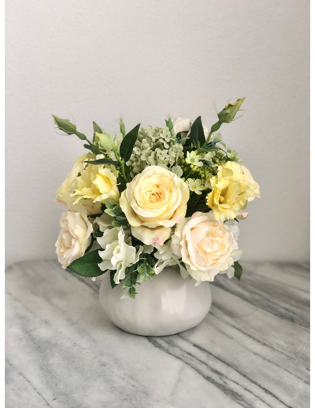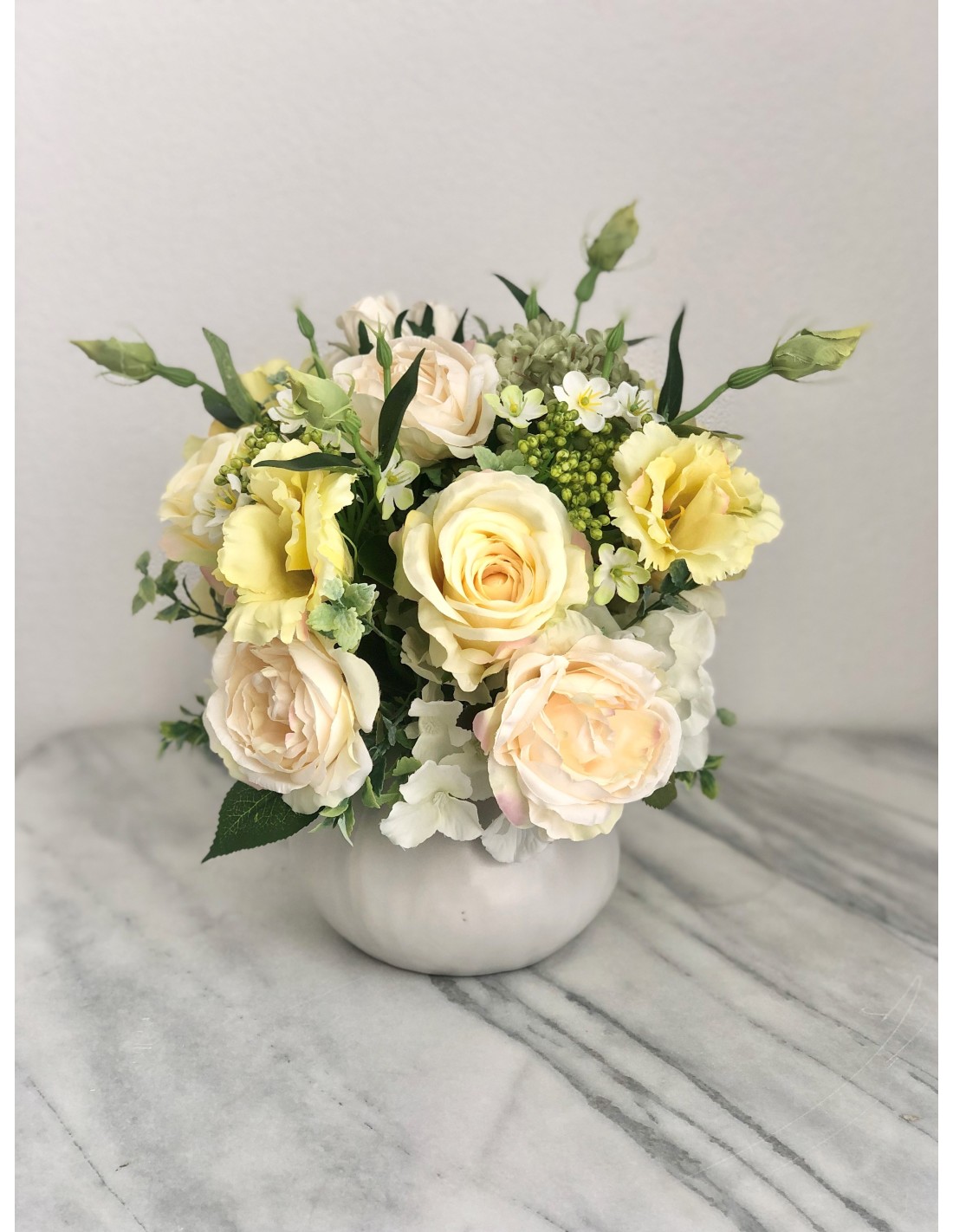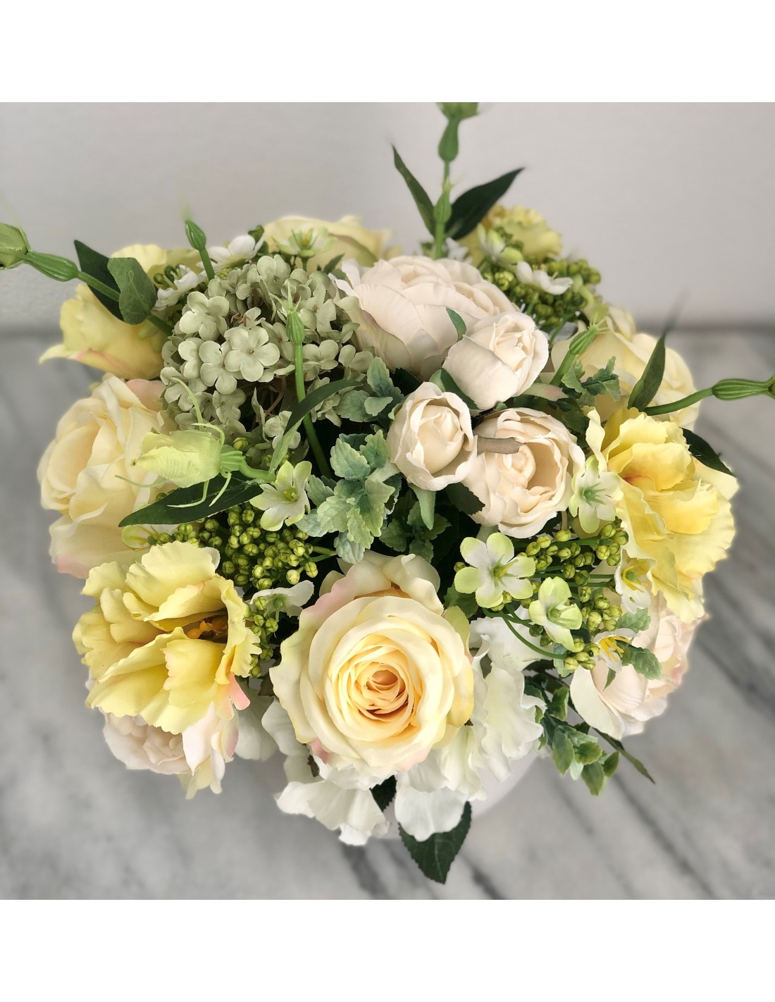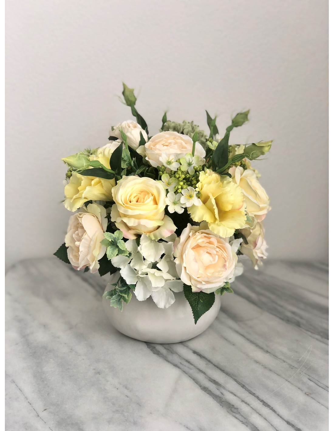In einem runden Keramikgefäß angefertigtes Seidenblumengesteck mit verschiedenen Rosenblüten, Hortensien, Eustomas, Beiwerk und unterschiedlichen Gräsern.