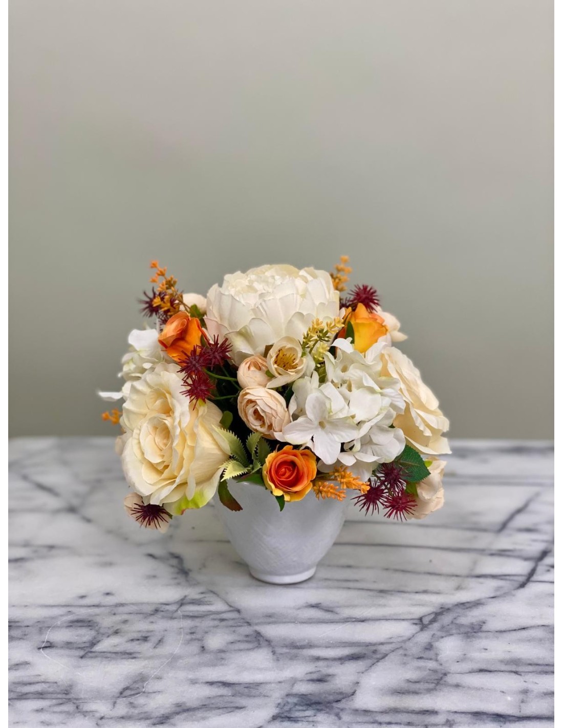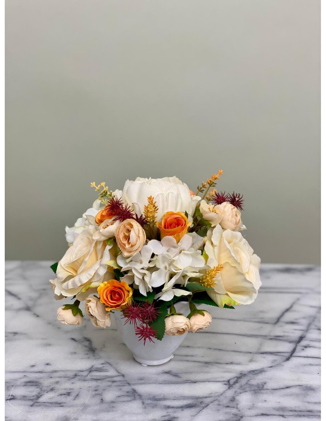 Ein kunstvolles Blumenarrangement, das Wärme und Eleganz ausstrahlt. Sanfte Creme- und Apricotrosen, kombiniert mit leuchtenden orangefarbenen Blüten, werden harmonisch durch weiße Hortensien und feine Akzente in Rot und Gold ergänzt. Alle Blumen und Blätter sind aus hochwertiger Kunstseide gefertigt und wirken täuschend echt – ein langlebiges Schmuckstück, das ohne Pflege seine Schönheit behält. Die Blüten sind fest in einer stilvollen weißen Vase arrangiert und bringen zeitlose Romantik in jeden Raum.