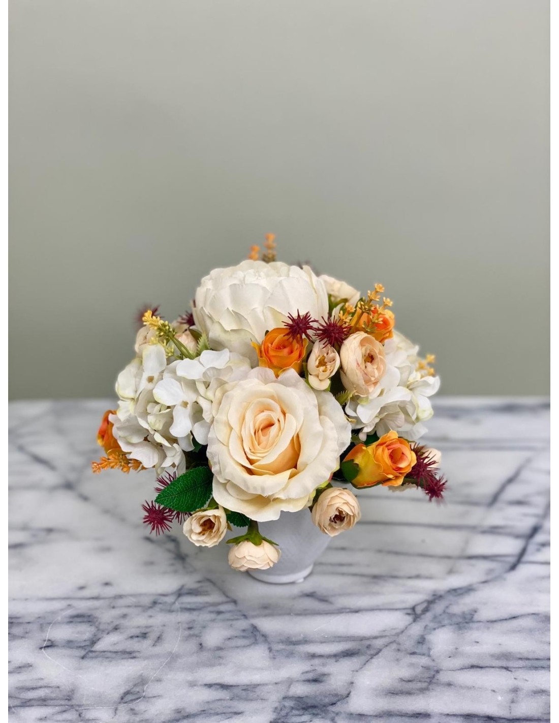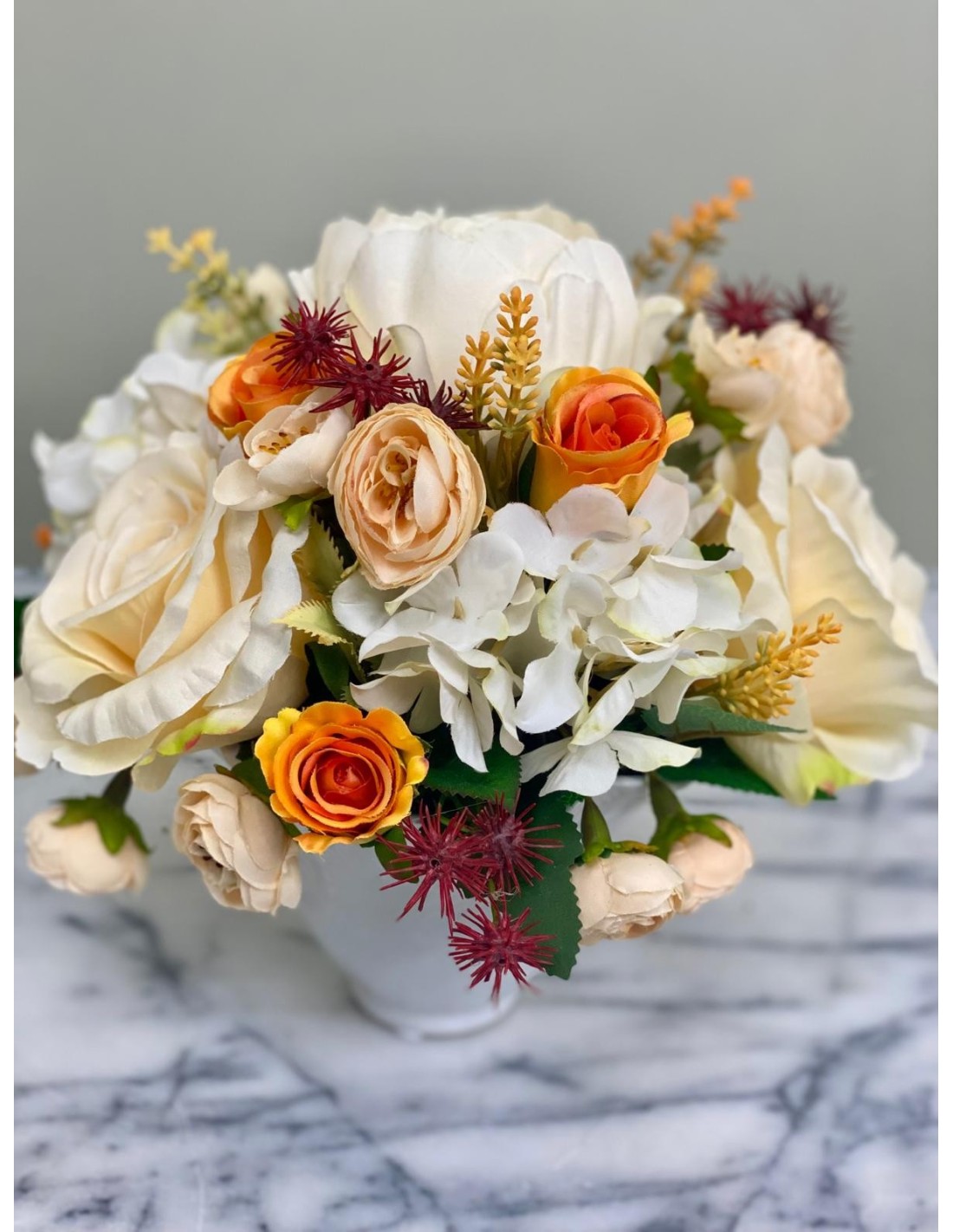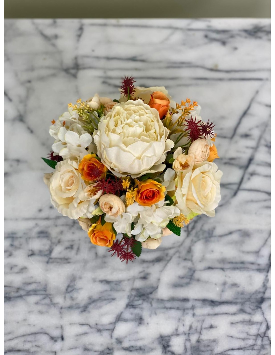 Elegantes Rosen-Arrangement in warmen Farbtönen.Ein kunstvolles Blumenarrangement, das Wärme und Eleganz ausstrahlt. Sanfte Creme- und Apricotrosen, kombiniert mit leuchtenden orangefarbenen Blüten, werden harmonisch durch weiße Hortensien und feine Akzente in Rot und Gold ergänzt. Alle Blumen und Blätter sind aus hochwertiger Kunstseide gefertigt und wirken täuschend echt – ein langlebiges Schmuc