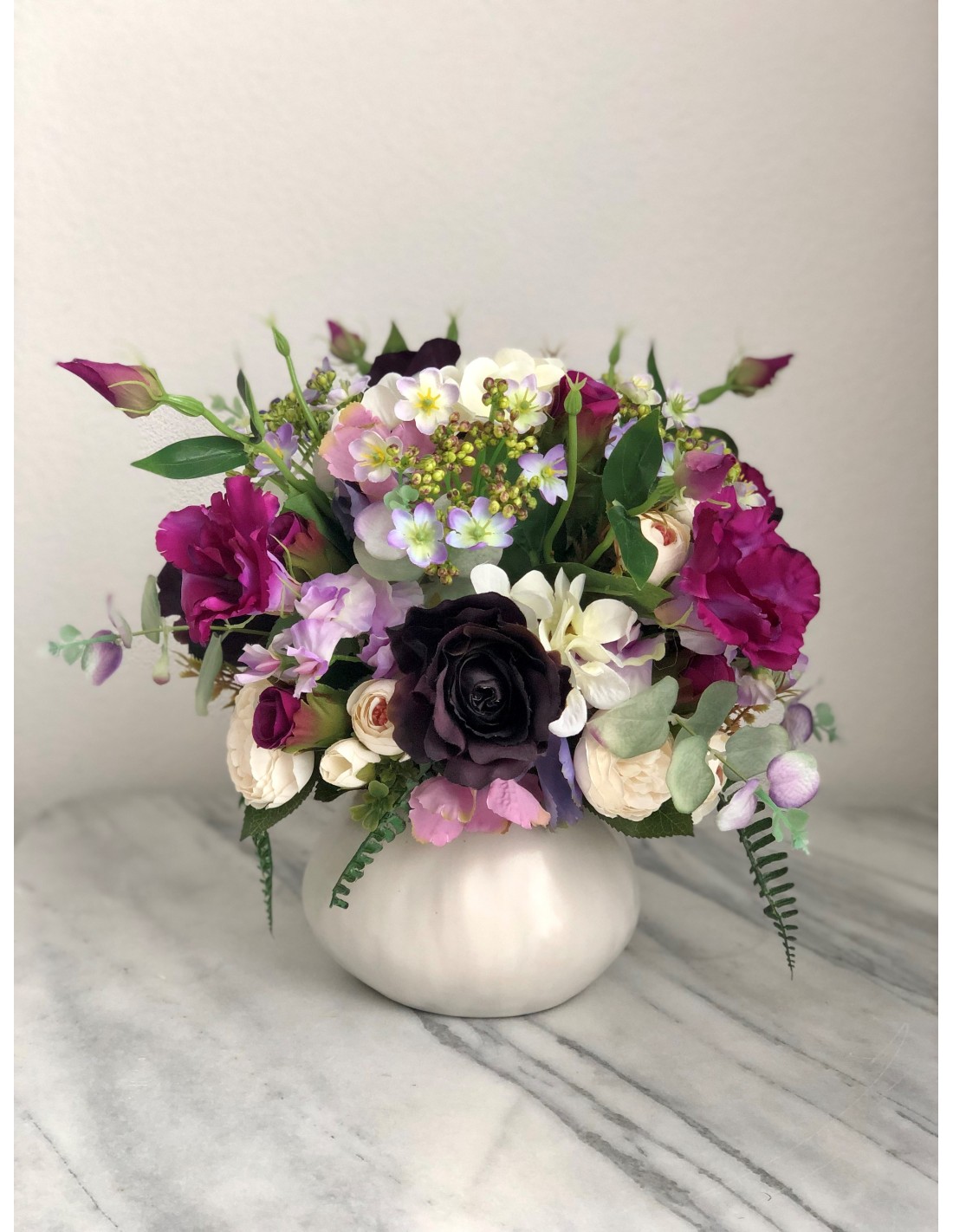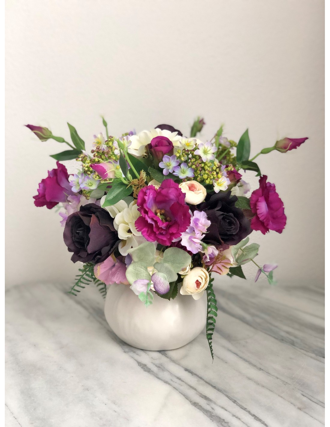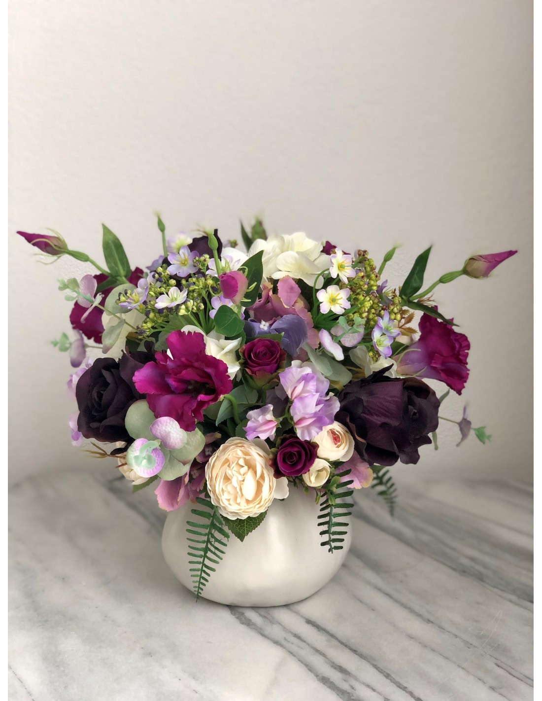 Unsere Seidenblumen-Gestecke sind individuell angefertige Einzelstücke und können auch nur einmal genau in dieser Art zu bestellt werden. Auf Wunsch fertigen wir Ihnen auch weitere sehr ähnliche Arrangements an.