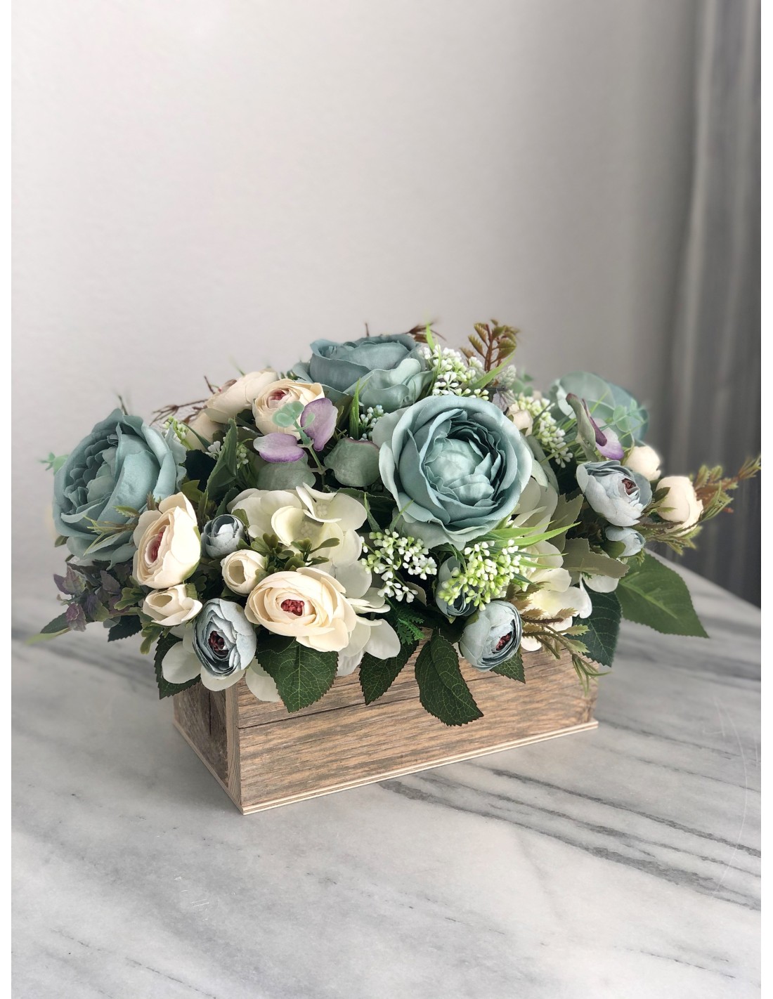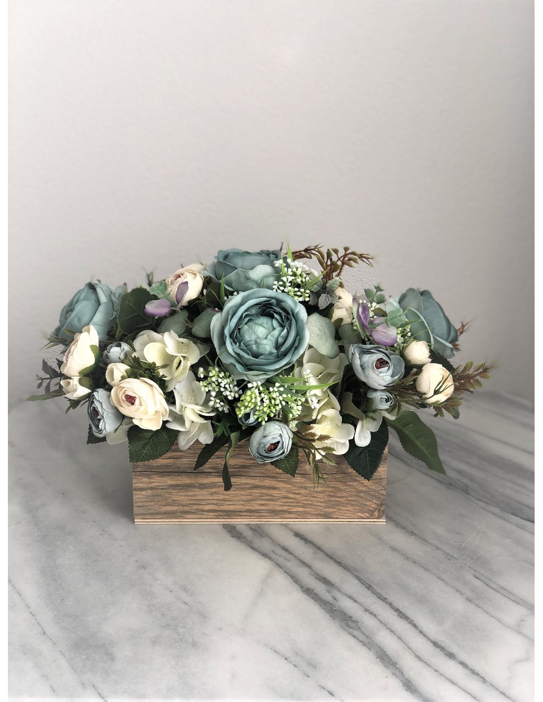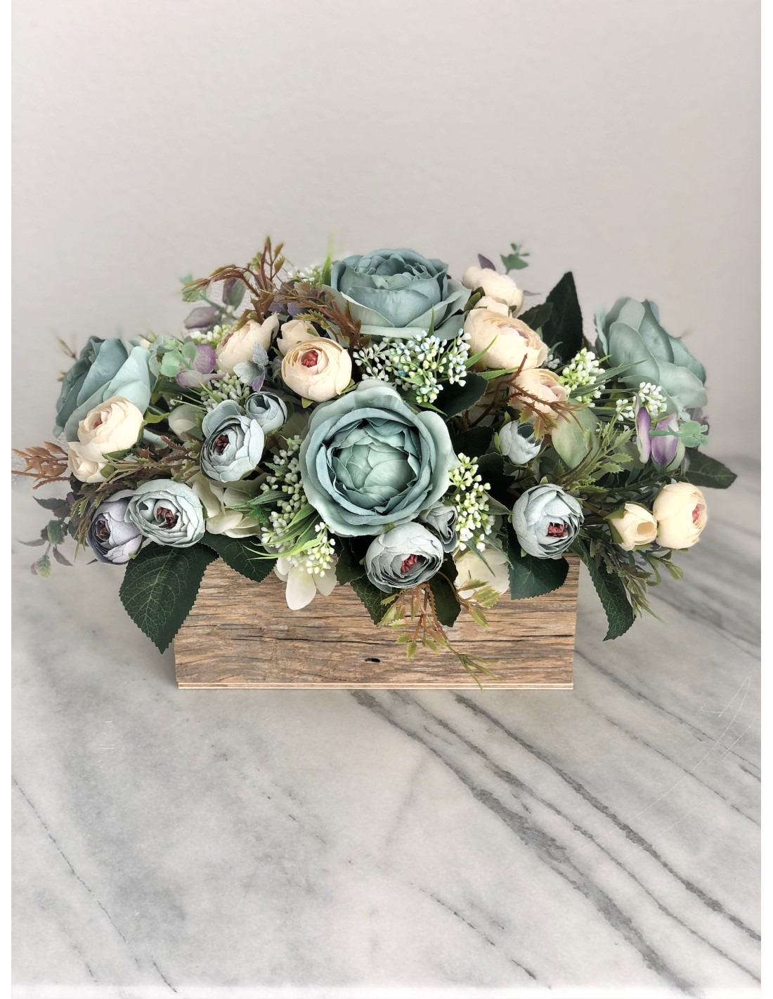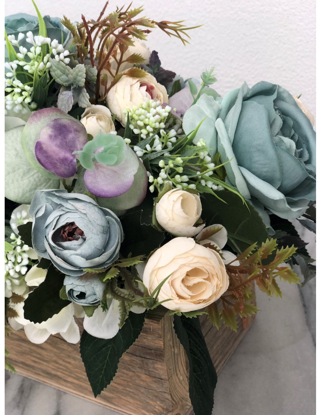 Seidenblumen Arrangement in einem Altholz Gefäss (petrolblau)