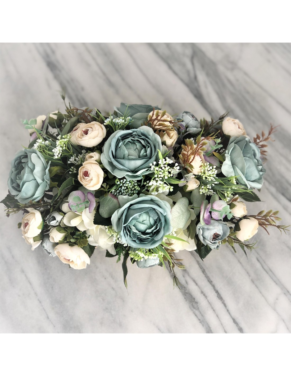 Die handgemachten Arrangements unserer Floristinnen sind traumhaftschöne Kreationen aus einer Vielzahl von Kunstblumen: Hortensien, Rosen, Zweigen, Blättern und Beiwerk.