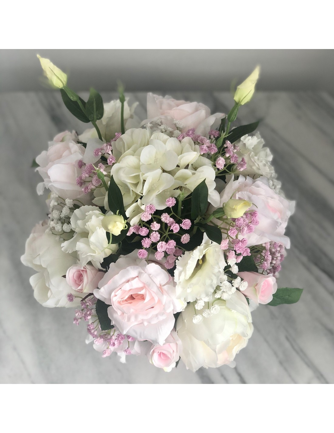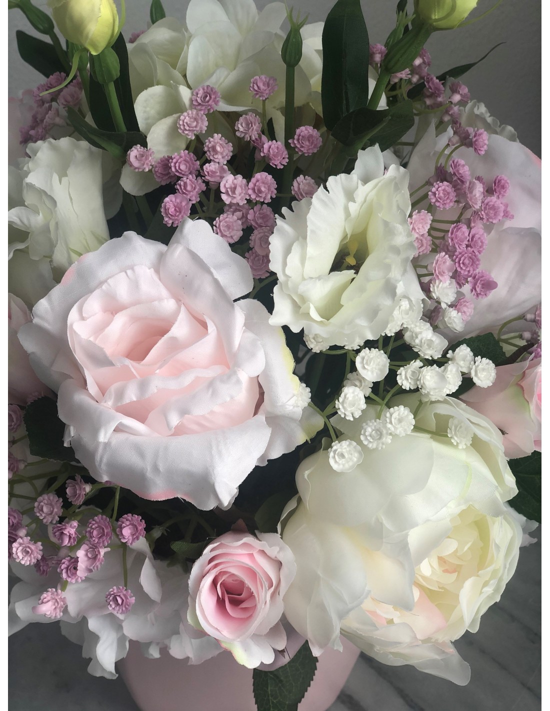 In einem runden Keramikgefäß angefertigtes Seidenblumengesteck mit verschiedenen Rosenblüten, Hortensien, Peonies, Schleierkraut, Eustomas, Beiwerk und unterschiedlichen Gräsern.