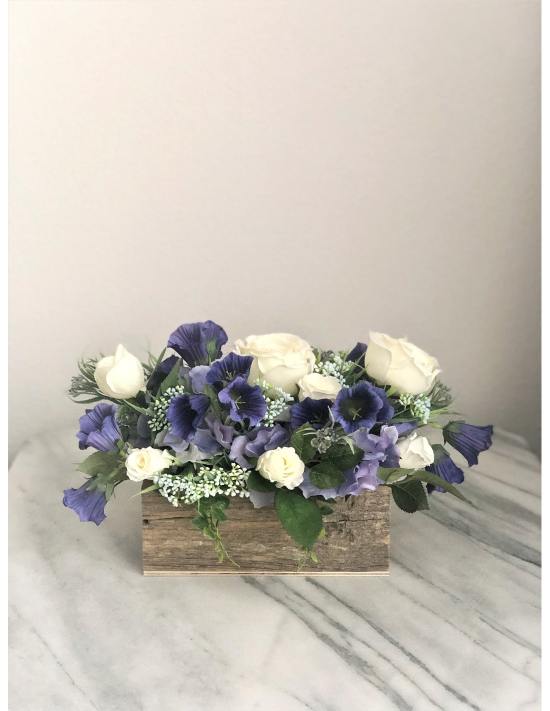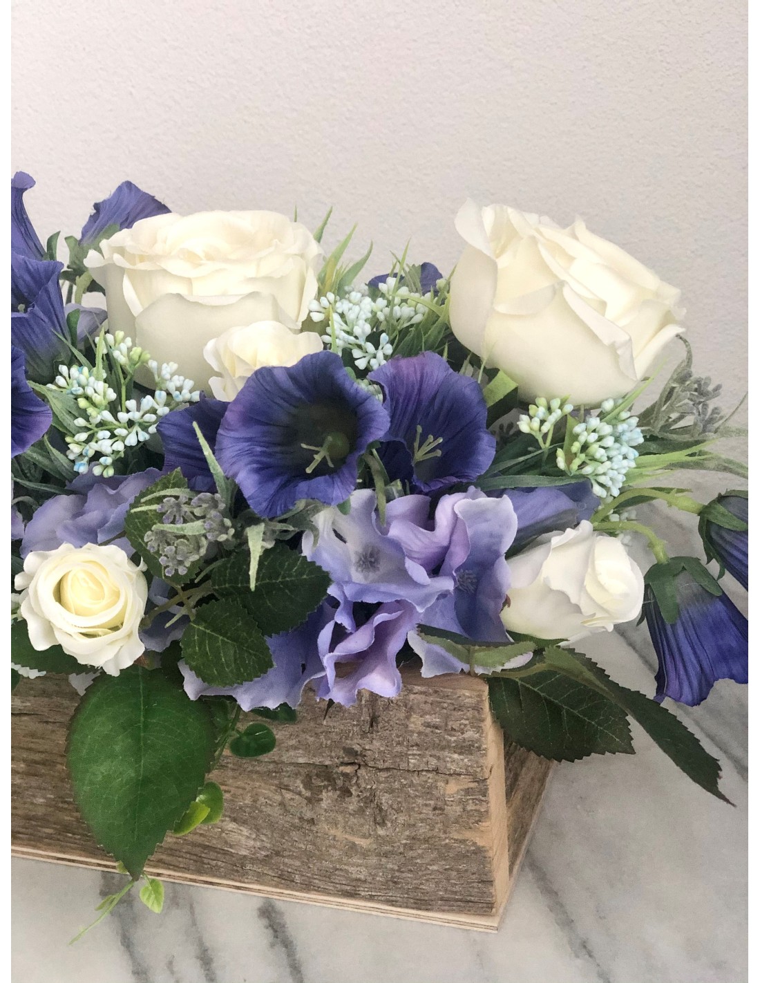 "Altholz" Kollektion - Arrangement in einem Holzgefäss, weiss, blau