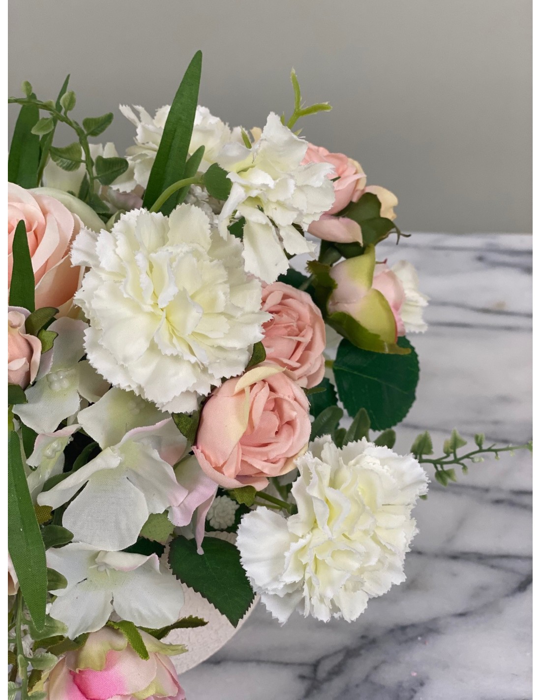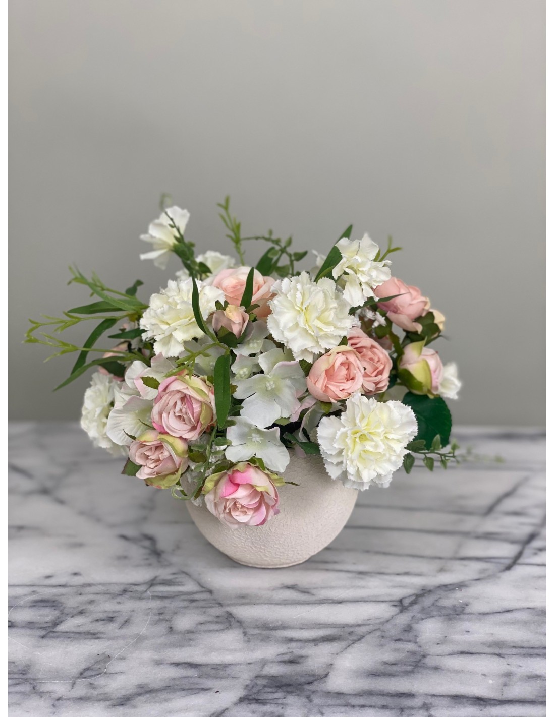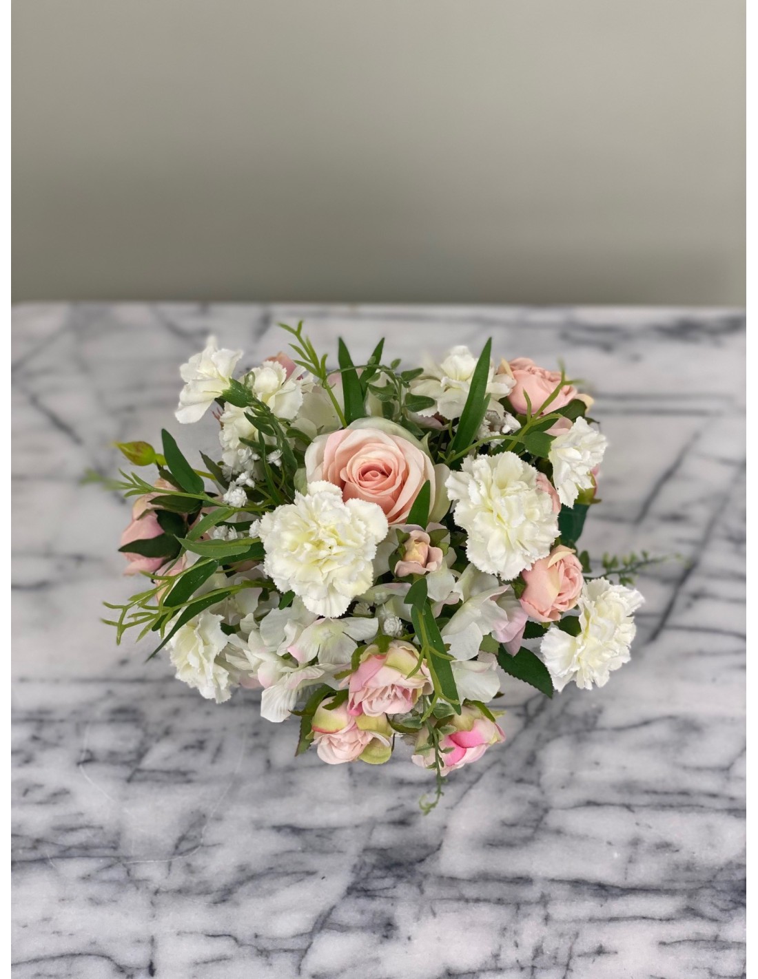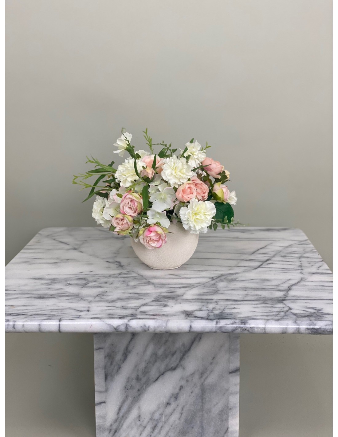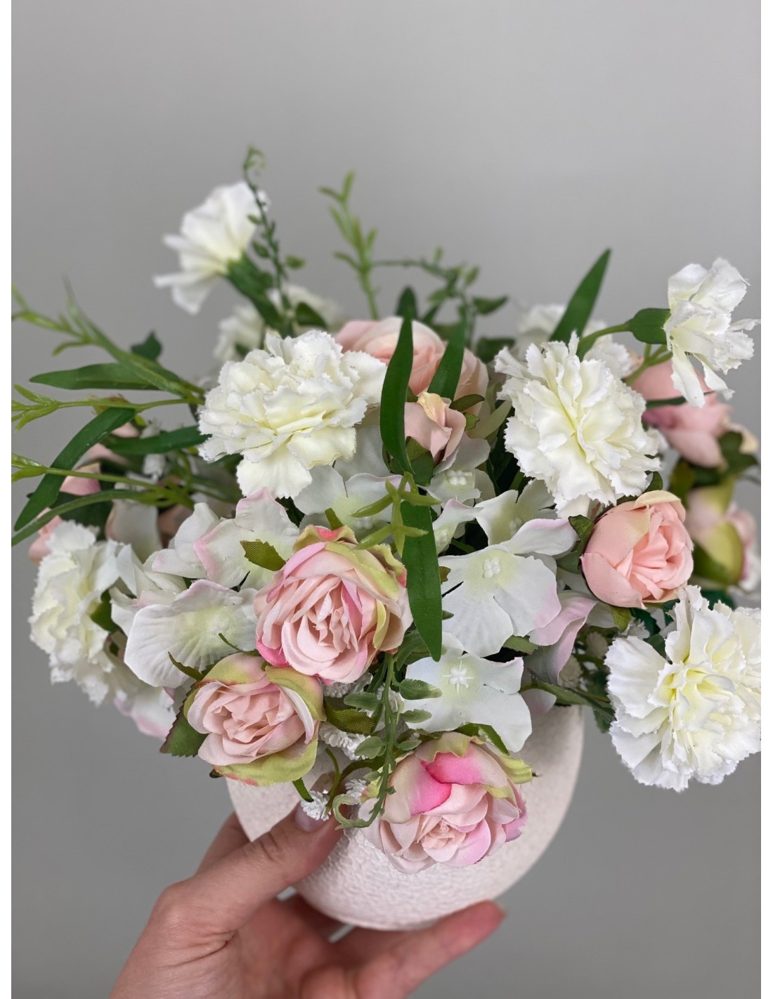 Dieses kompakte, aber edle Arrangement besticht durch seine harmonische Kombination aus zartrosafarbenen Rosen, cremeweißen Nelken und feinem Blattgrün. In einer eleganten, strukturierten Vase arrangiert, bringt es Frische, Leichtigkeit und zeitlose Eleganz in jeden Raum.