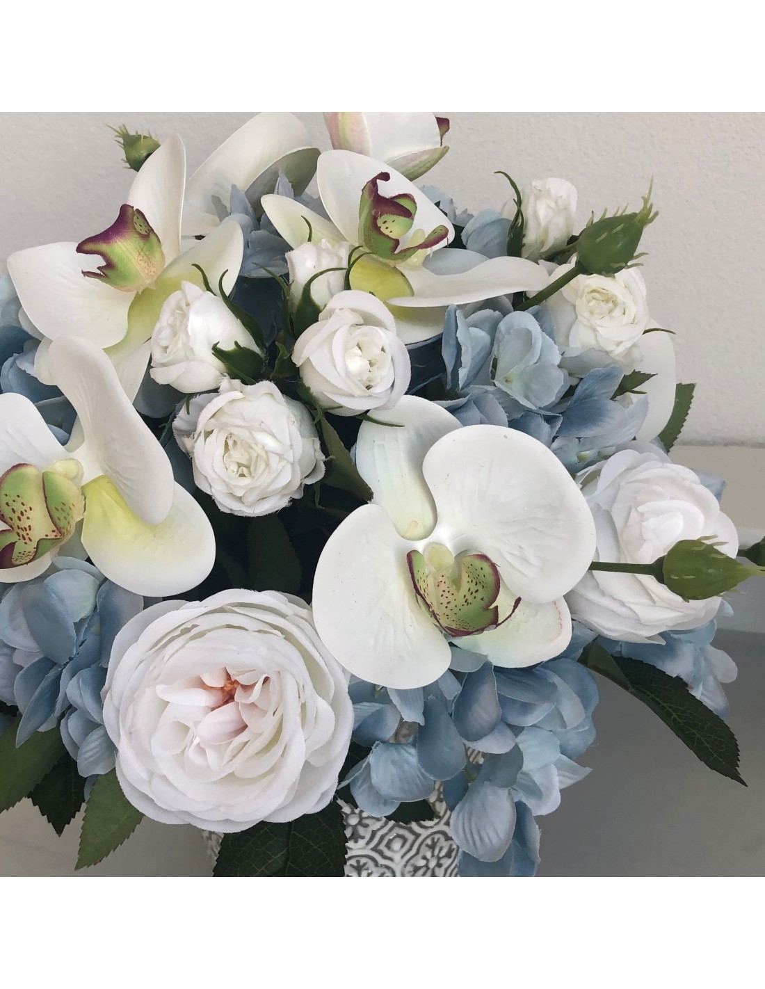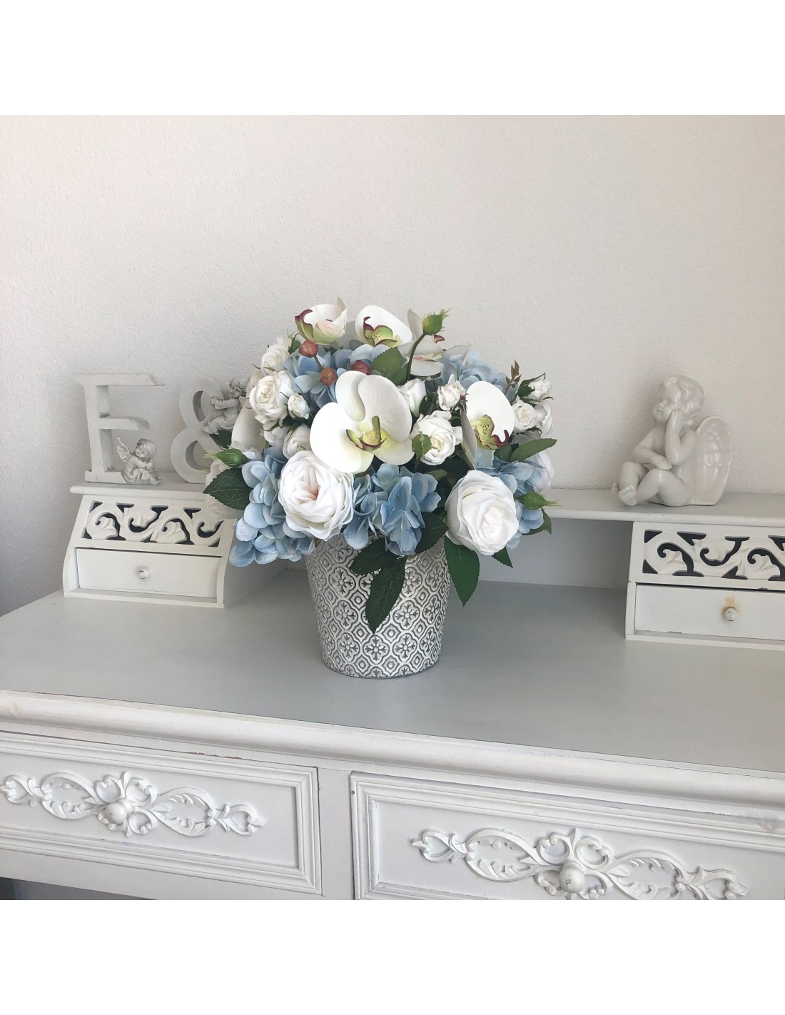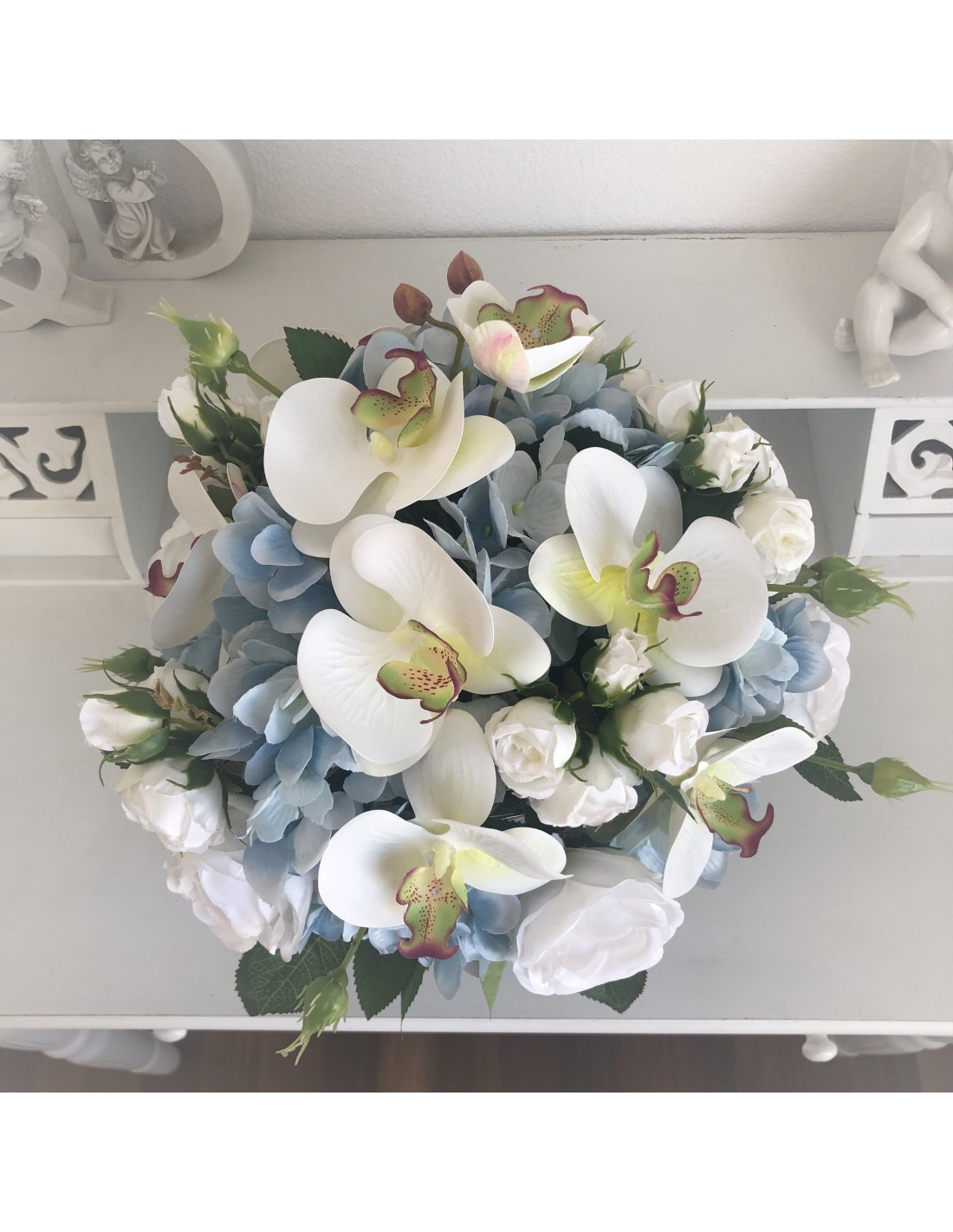 Kunstblumen Arrangement aus Rosen, Hortensien und Orchideen in einer Vase