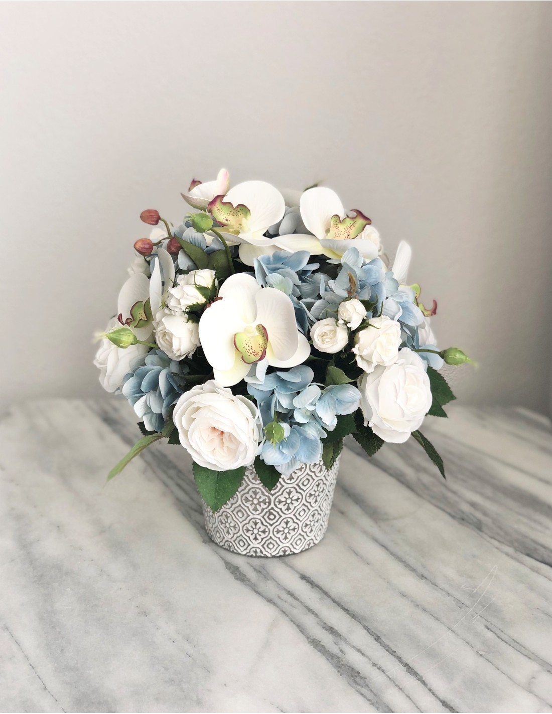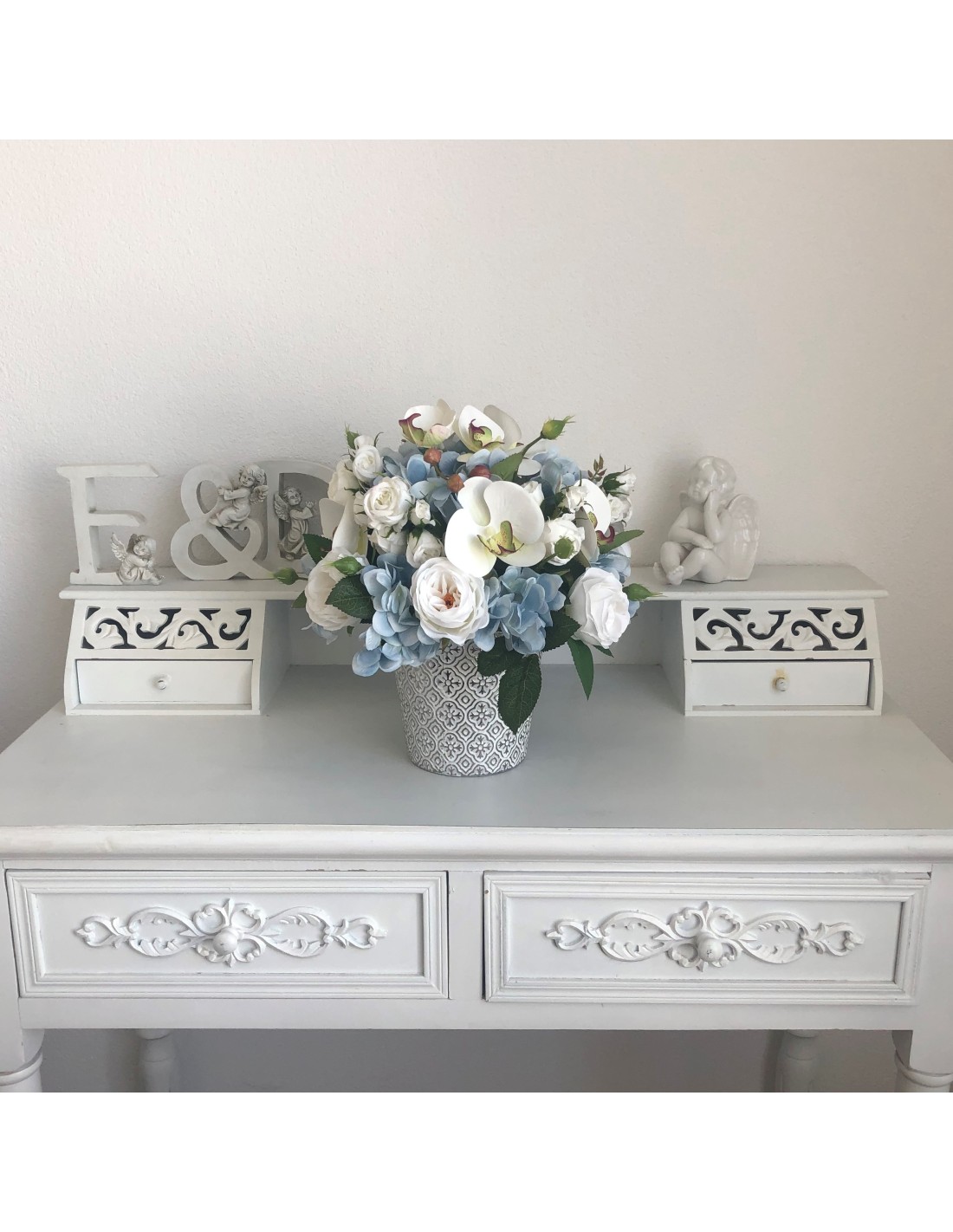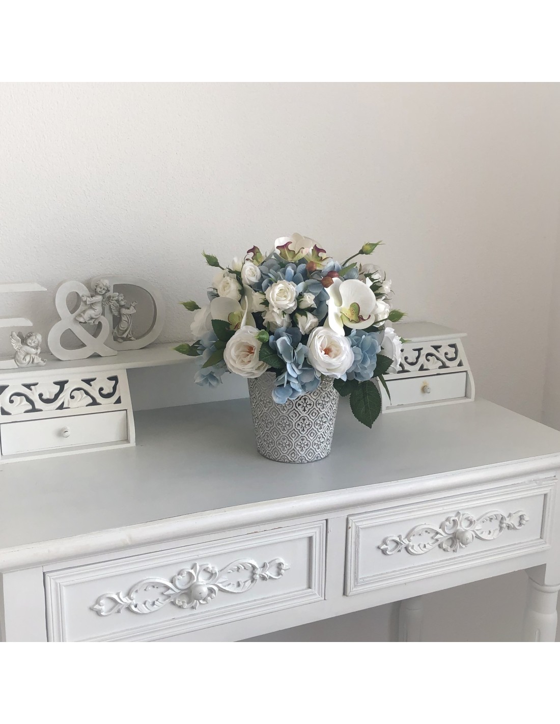 Kunstblumen Arrangement aus Rosen, Hortensien und Orchideen in einer Vase
