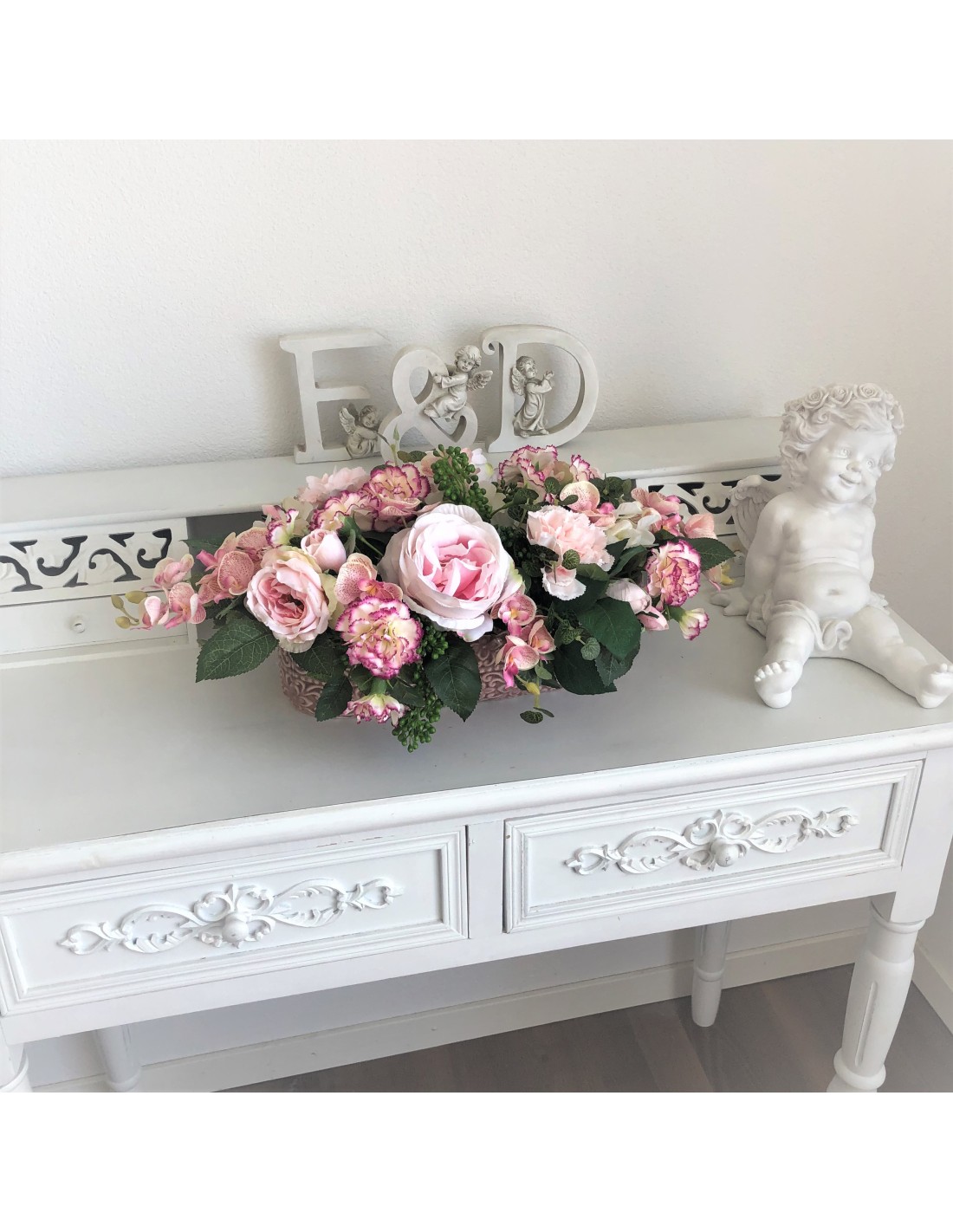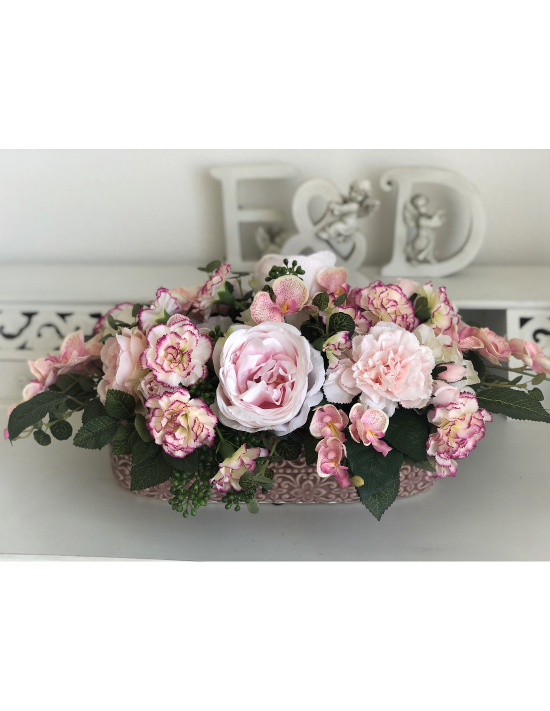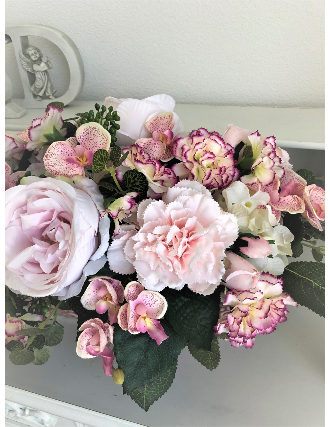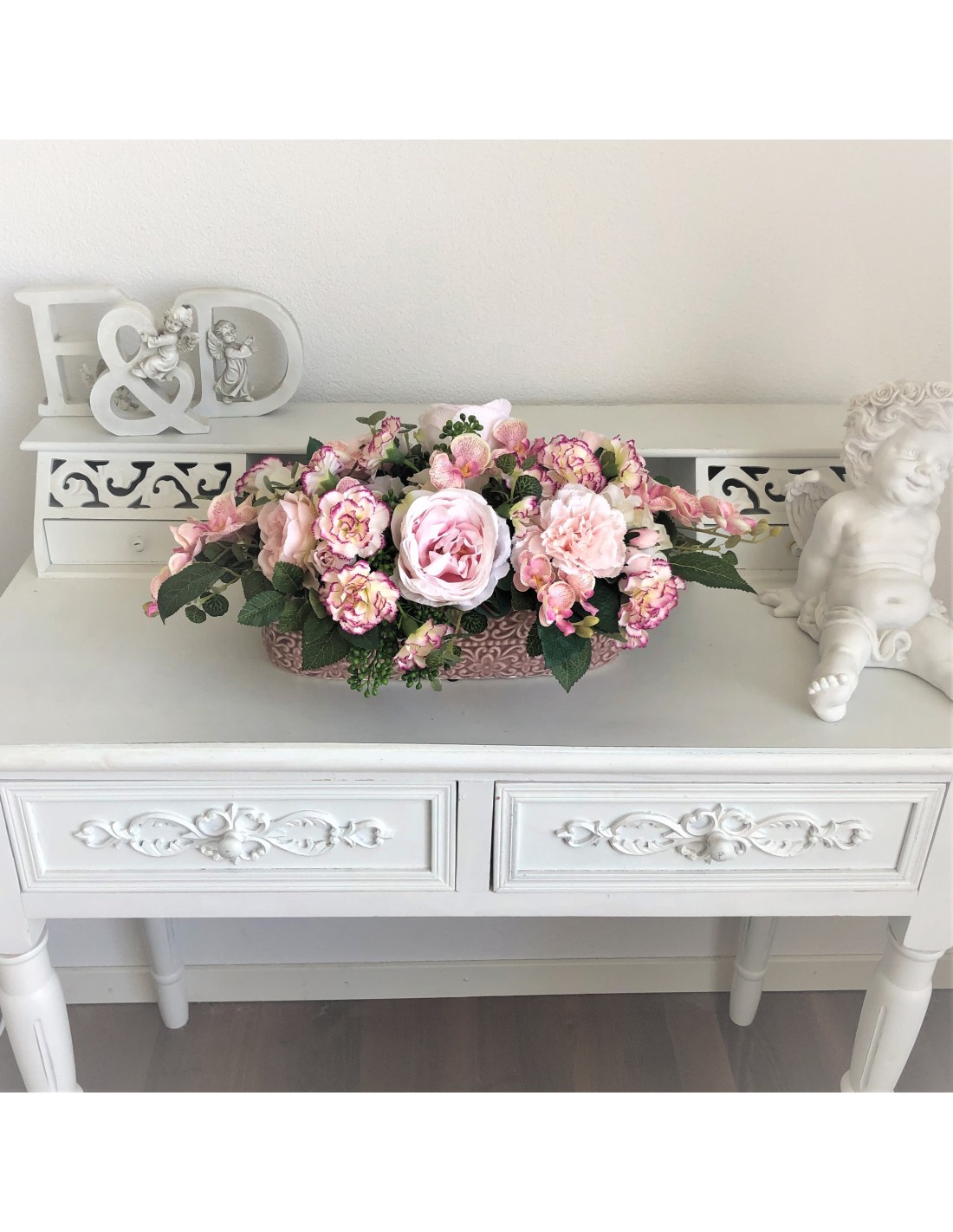 Haben Sie auch immer gerne einen blühenden Arrangement Blumen auf dem Tisch stehen, an dem Sie sich jeden Tag erfreuen? Nur schade, dass die Freude nur so lange hält, wie auch die Blumen blühen. An unseren handgefertigten Arrangements aus Kunststoff können Sie sich das ganze Jahr über erfreuen.Das Arrangement hat eine Höhe von ca. 22 cm, Breite von ca. 50 cm, Tiefe von ca. 29 cm.In einem ovalen Ke