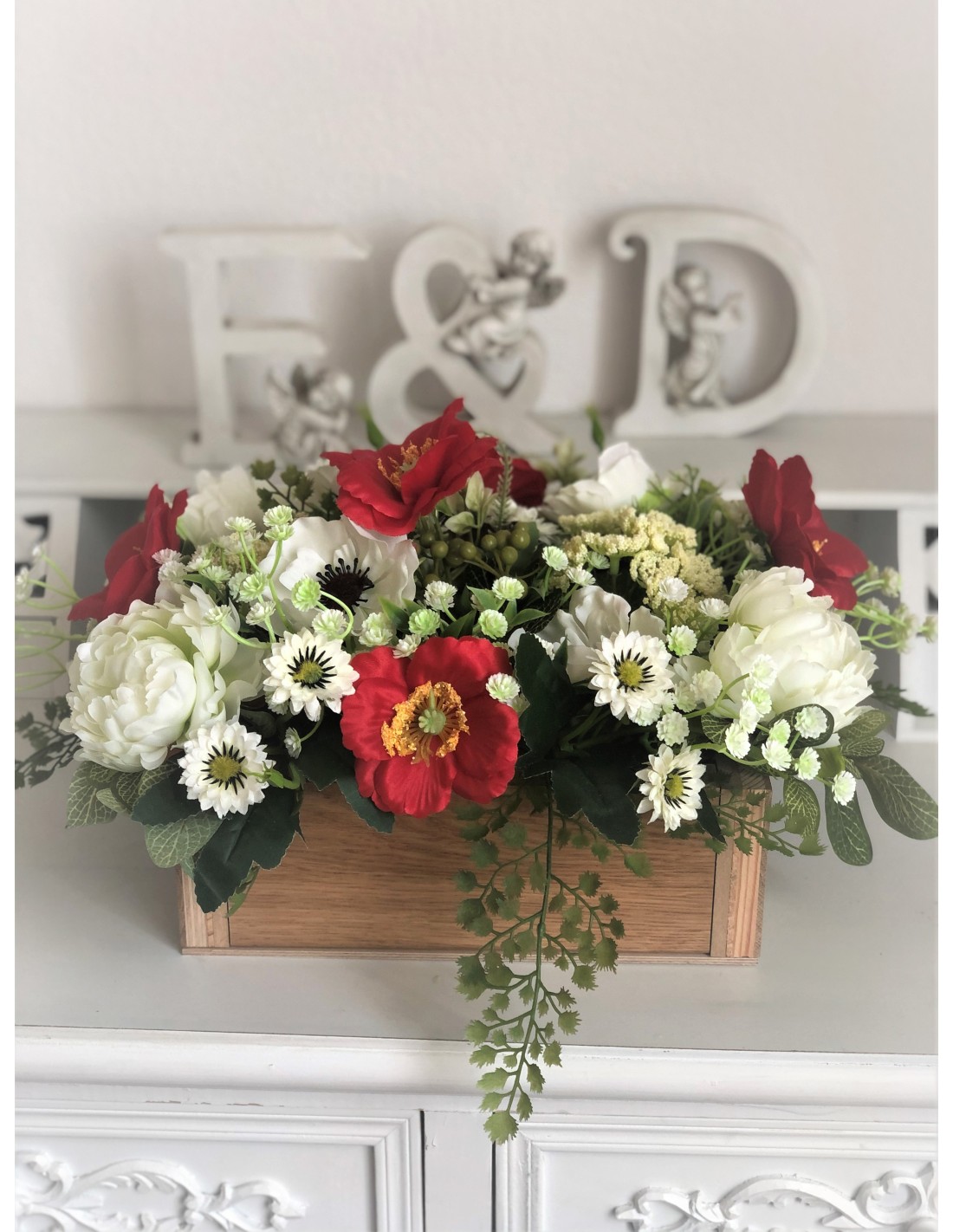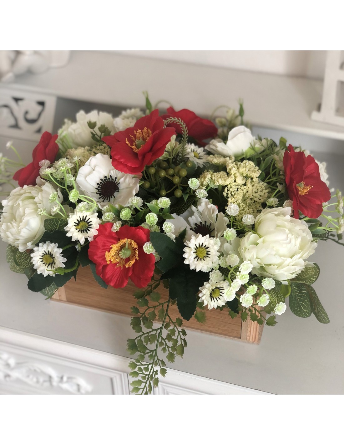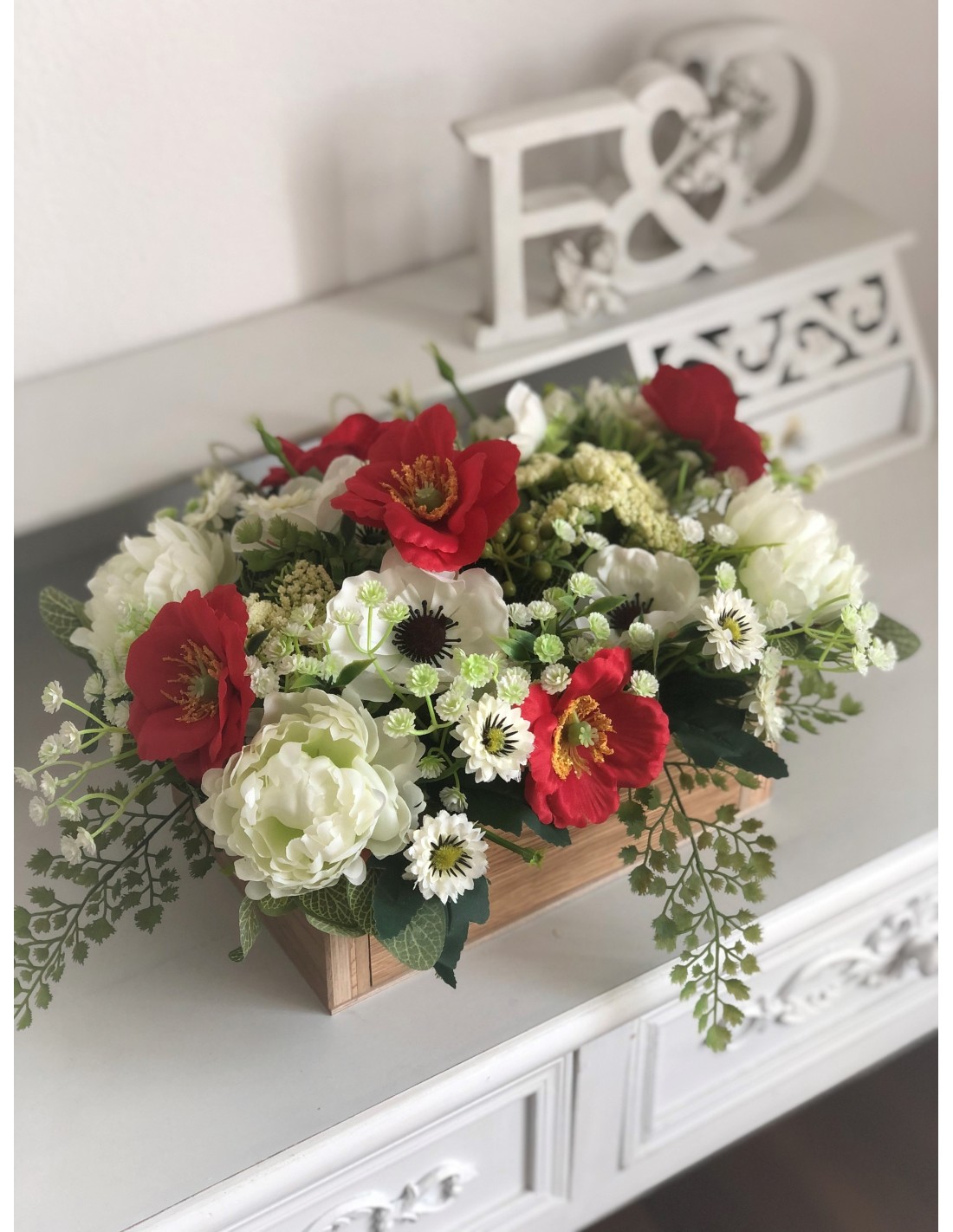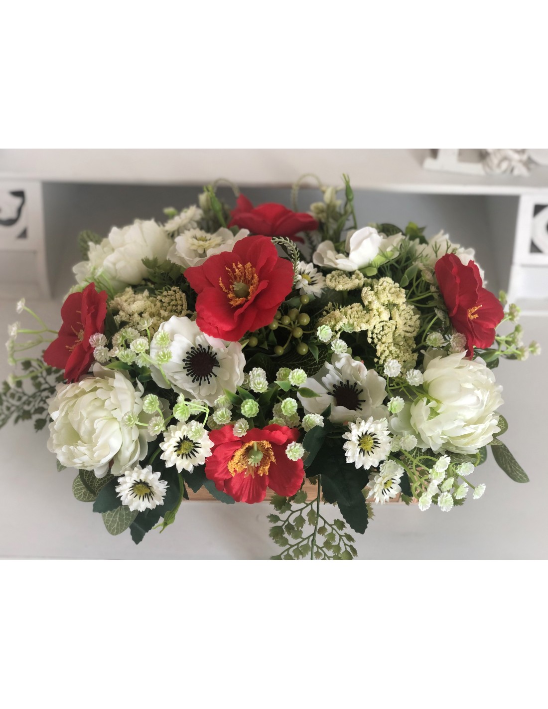 Die handgebundenen Arrangements unserer Floristinnen sind traumhaftschöne Kreationen aus einer Vielzahl von Kunstblumen: Mohnblumen, Peonies, Zweigen, Blättern und Beiwerk. Das Arrangement hat eine Höhe von ca. 21 cm., Breite von ca. 45 cm., Tiefe von ca. 29 cm.Unsere Seidenblumen-Arrangements sind individuell angefertige Einzelstücke und können auch nur einmal genau in dieser Art zu bestellt werd