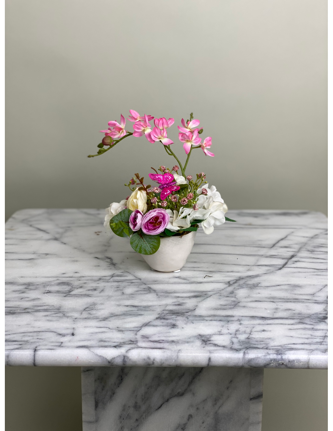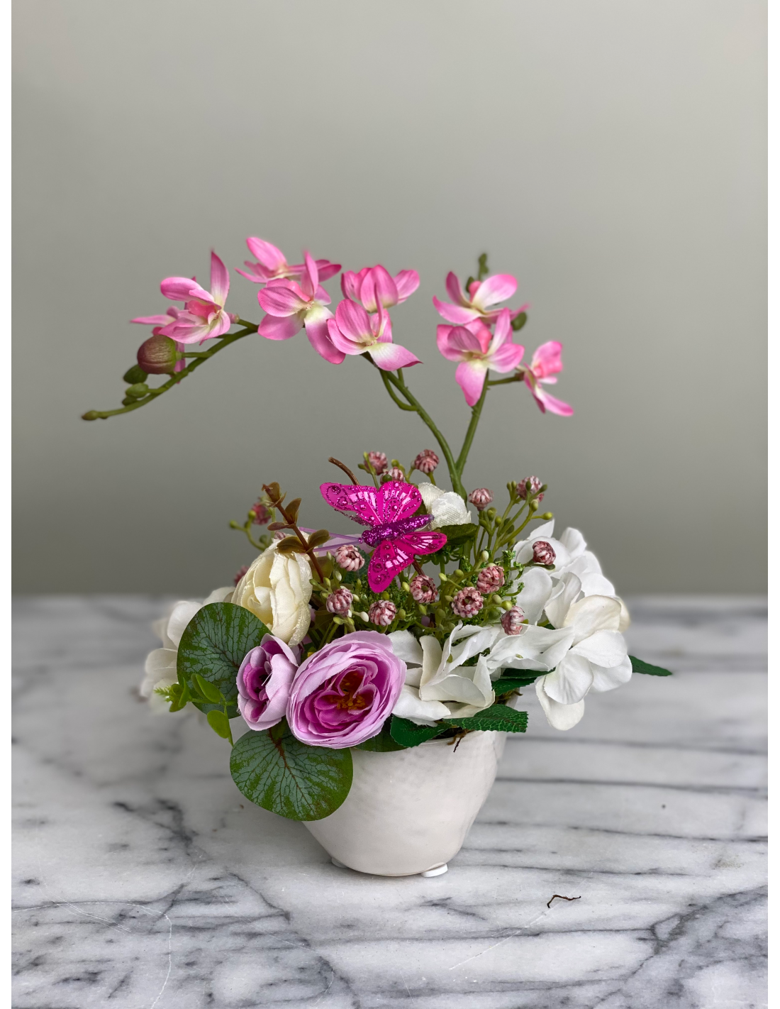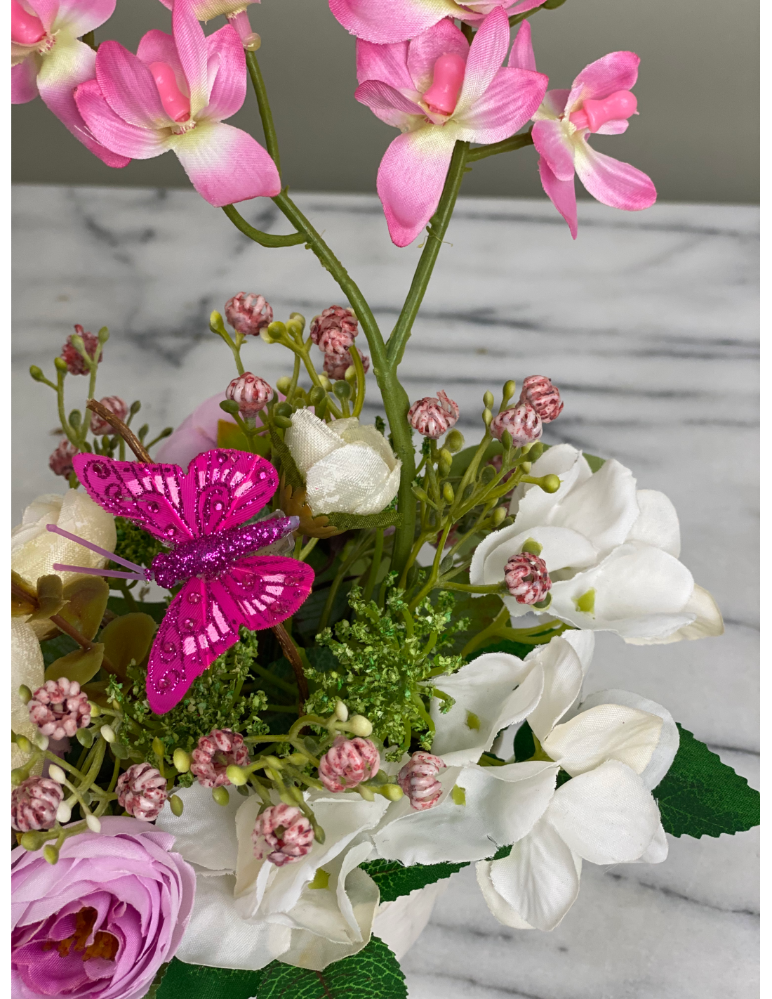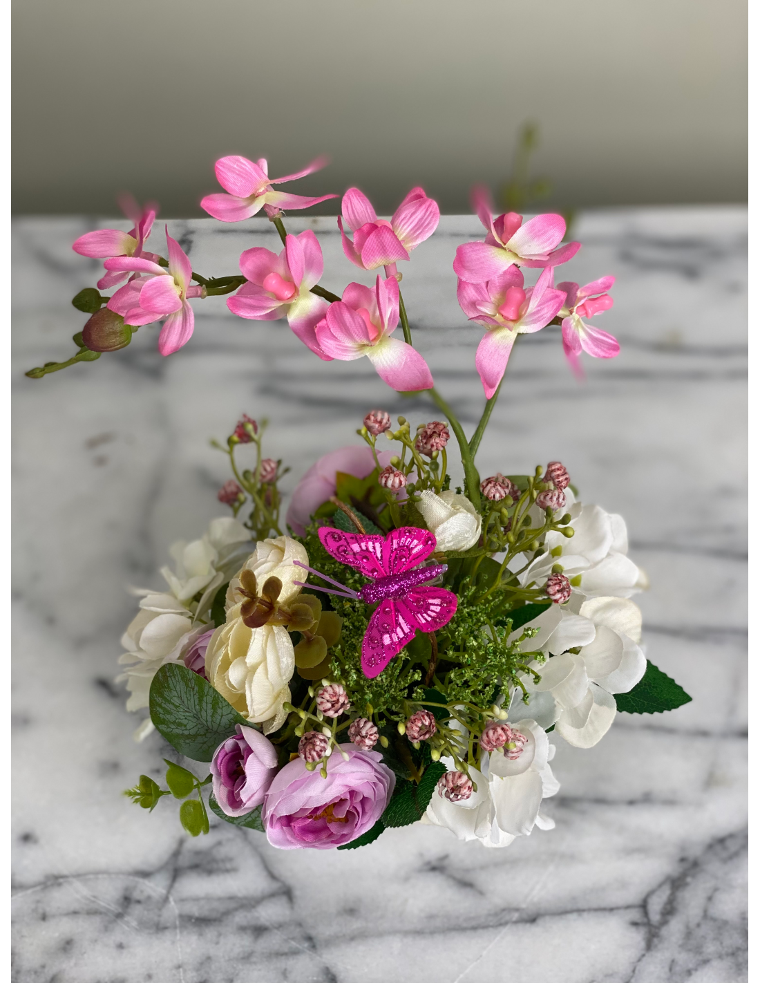 Dieses bezaubernde Arrangement vereint filigrane rosa Orchideen mit zarten Rosenknospen, edlen weißen Blüten und frischem Grün. Der liebevoll platzierte Schmetterling in Pink verleiht dem Gesamtbild eine verspielte Leichtigkeit und bringt sofort Frische und Lebensfreude in jeden Raum.
