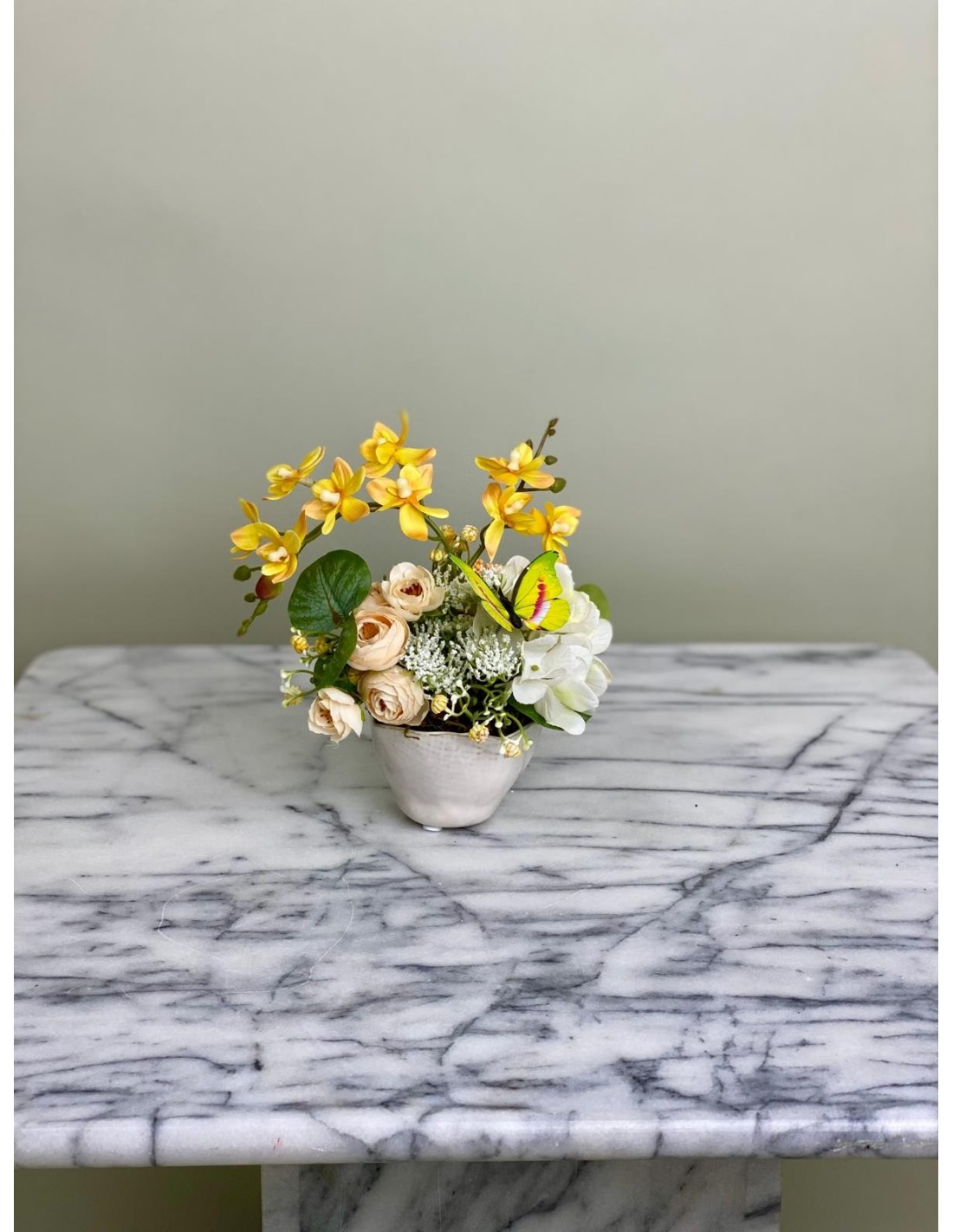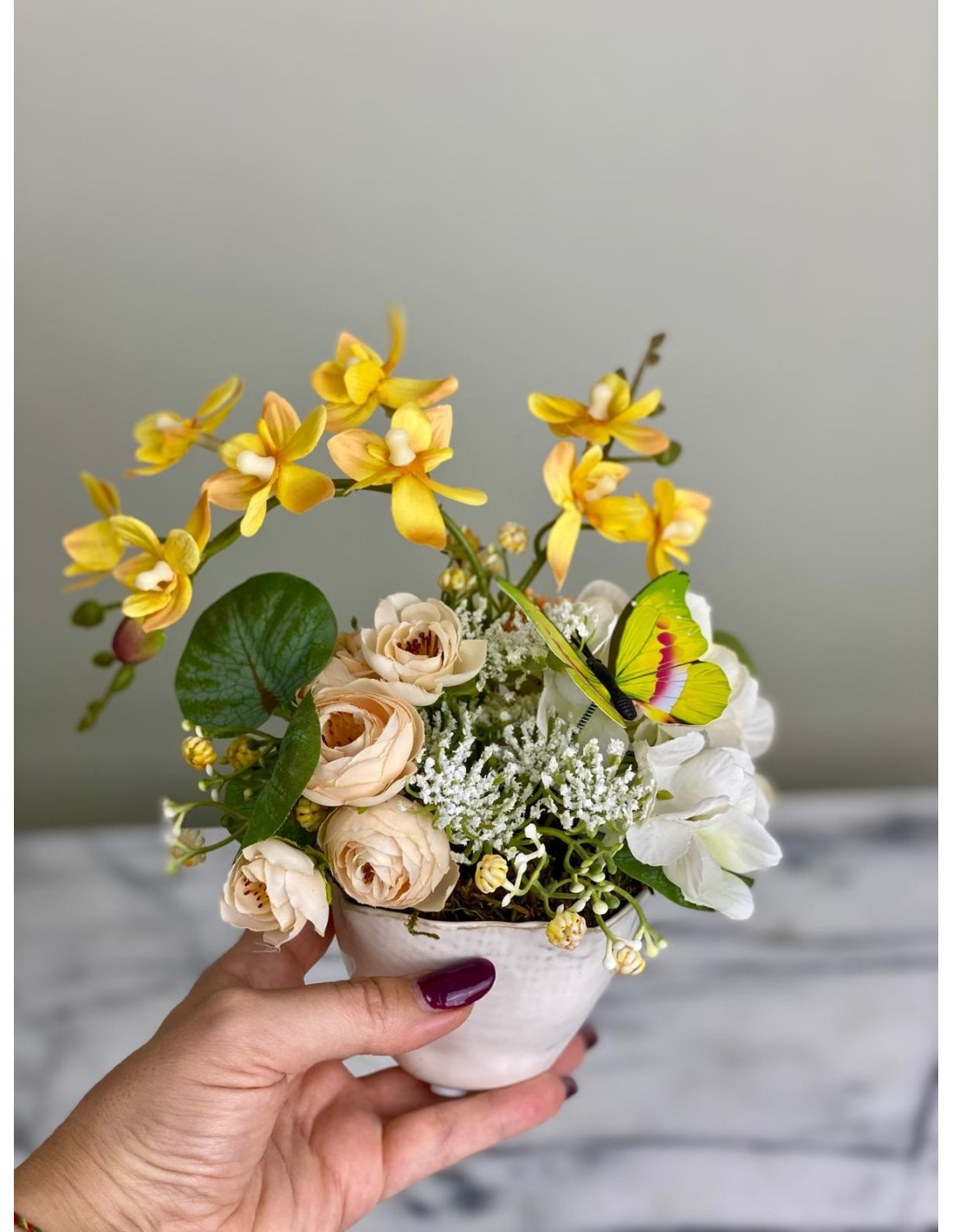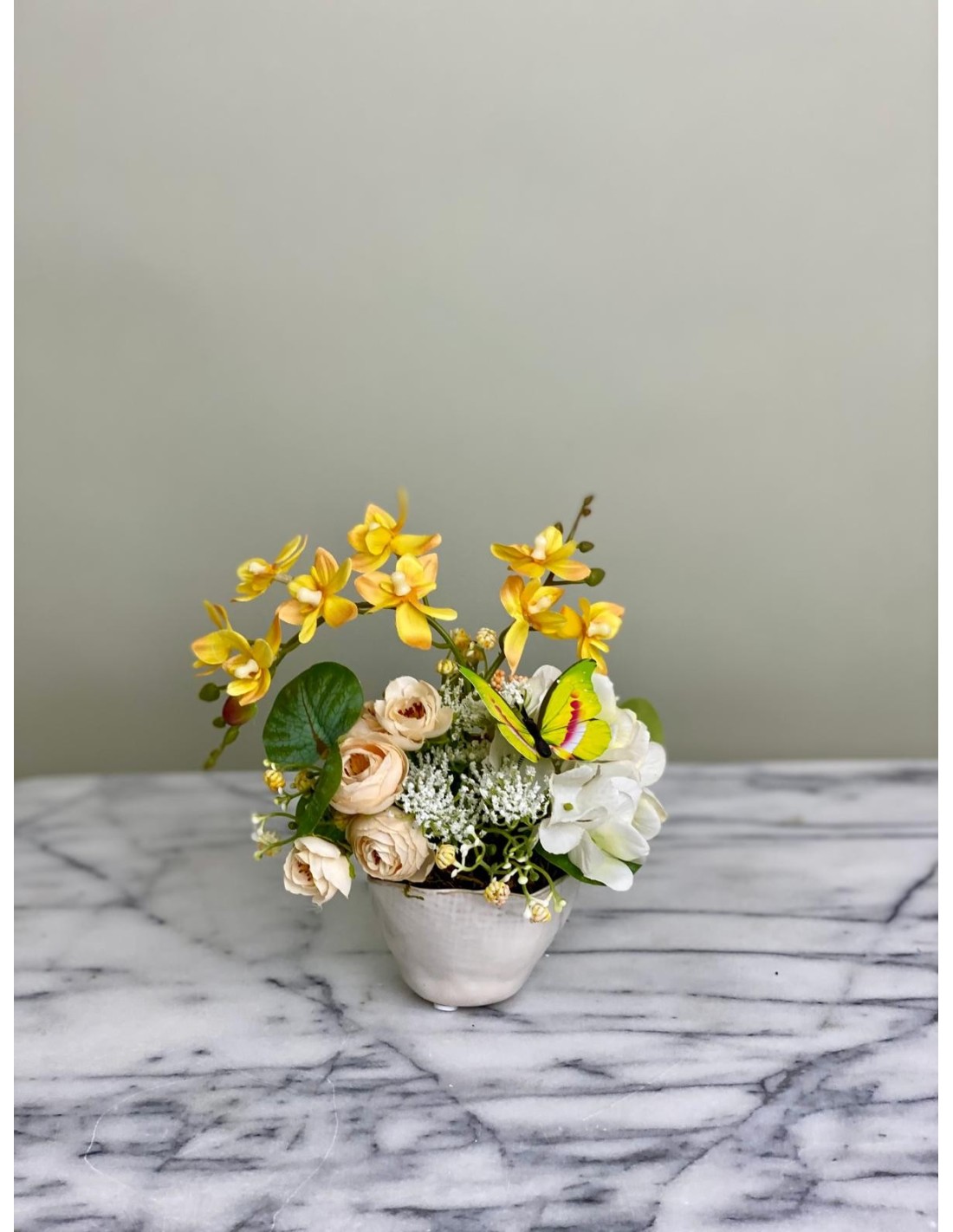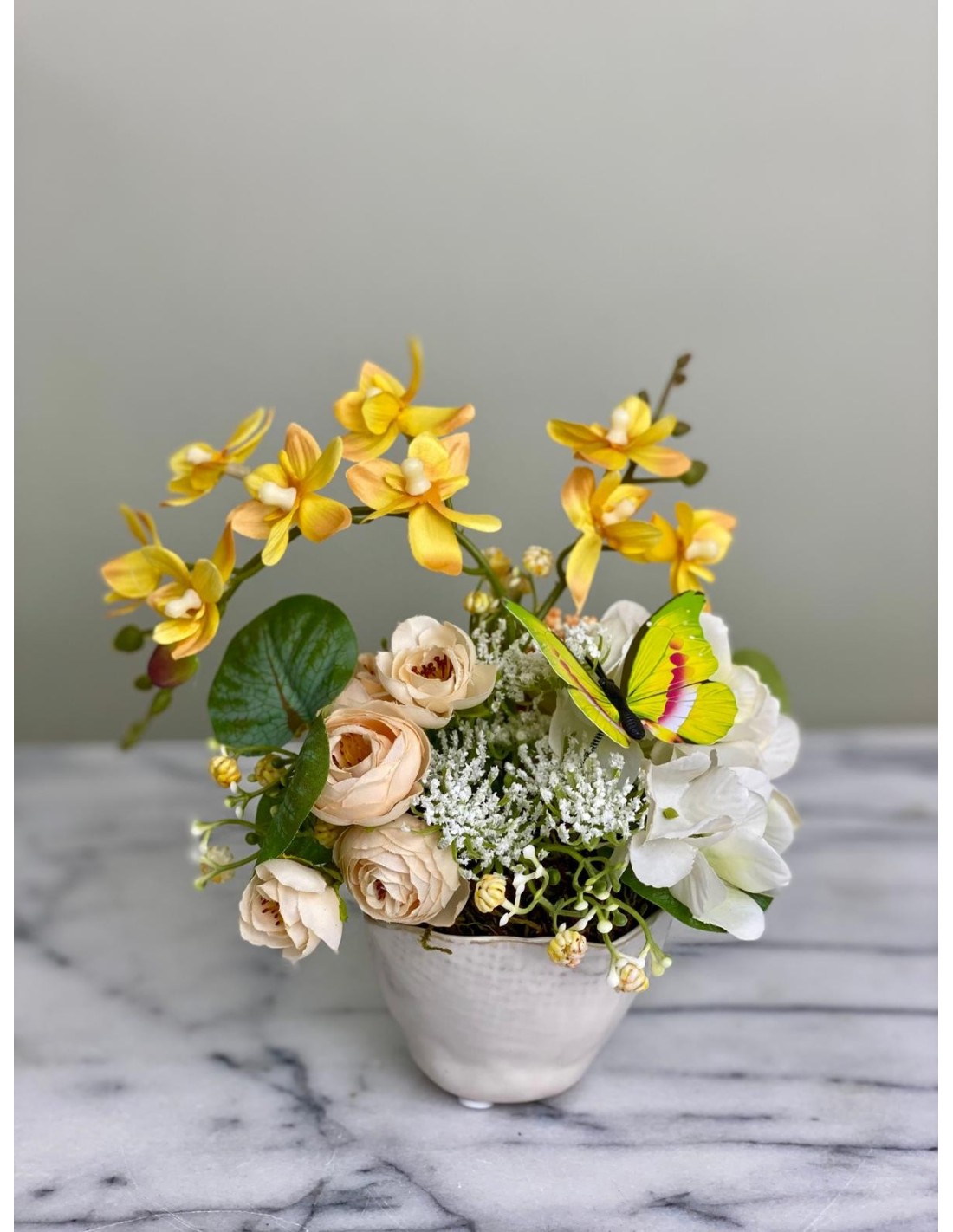 Ein zauberhaftes Arrangement aus hochwertigen Kunstblumen, das mit seiner sommerlichen Frische begeistert. Strahlend gelbe Orchideen vereinen sich mit zarten cremefarbenen Rosen, weißen Blüten und grünen Akzenten zu einer harmonischen Komposition. Als besonderes Detail schmückt ein farbenfroher Schmetterling das Arrangement und verleiht ihm eine lebendige, verspielte Note.