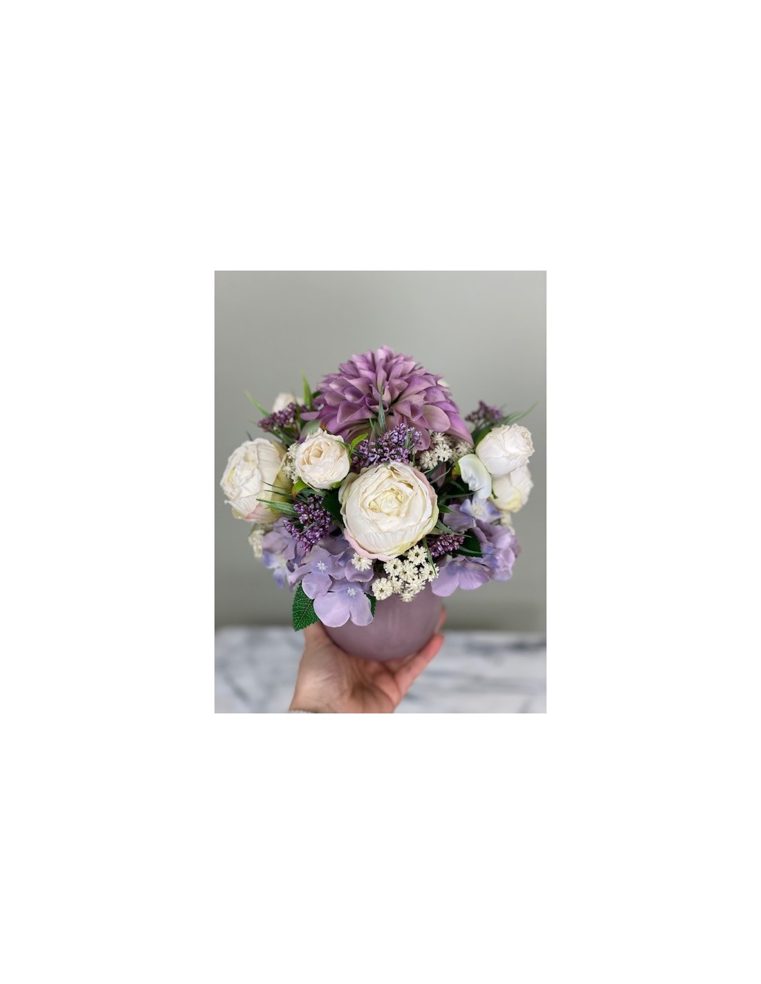 Kleines Arrangement in einer VaseHaben Sie auch immer gerne einen blühenden Arrangement Blumen auf dem Tisch stehen, an dem Sie sich jeden Tag erfreuen? Nur schade, dass die Freude nur so lange hält, wie auch die Blumen blühen. An unseren handgefertigten Arrangements aus Kunststoff können Sie sich das ganze Jahr über erfreuen.Kleines Arrangement in einer Vase hat eine Höhe von ca. 23 cm, Gesamtdur