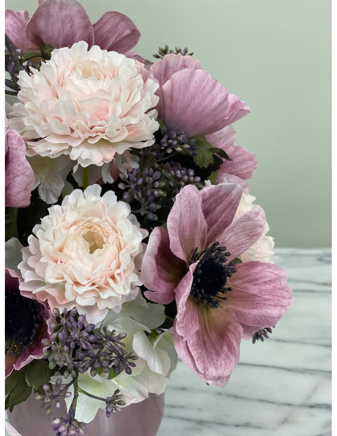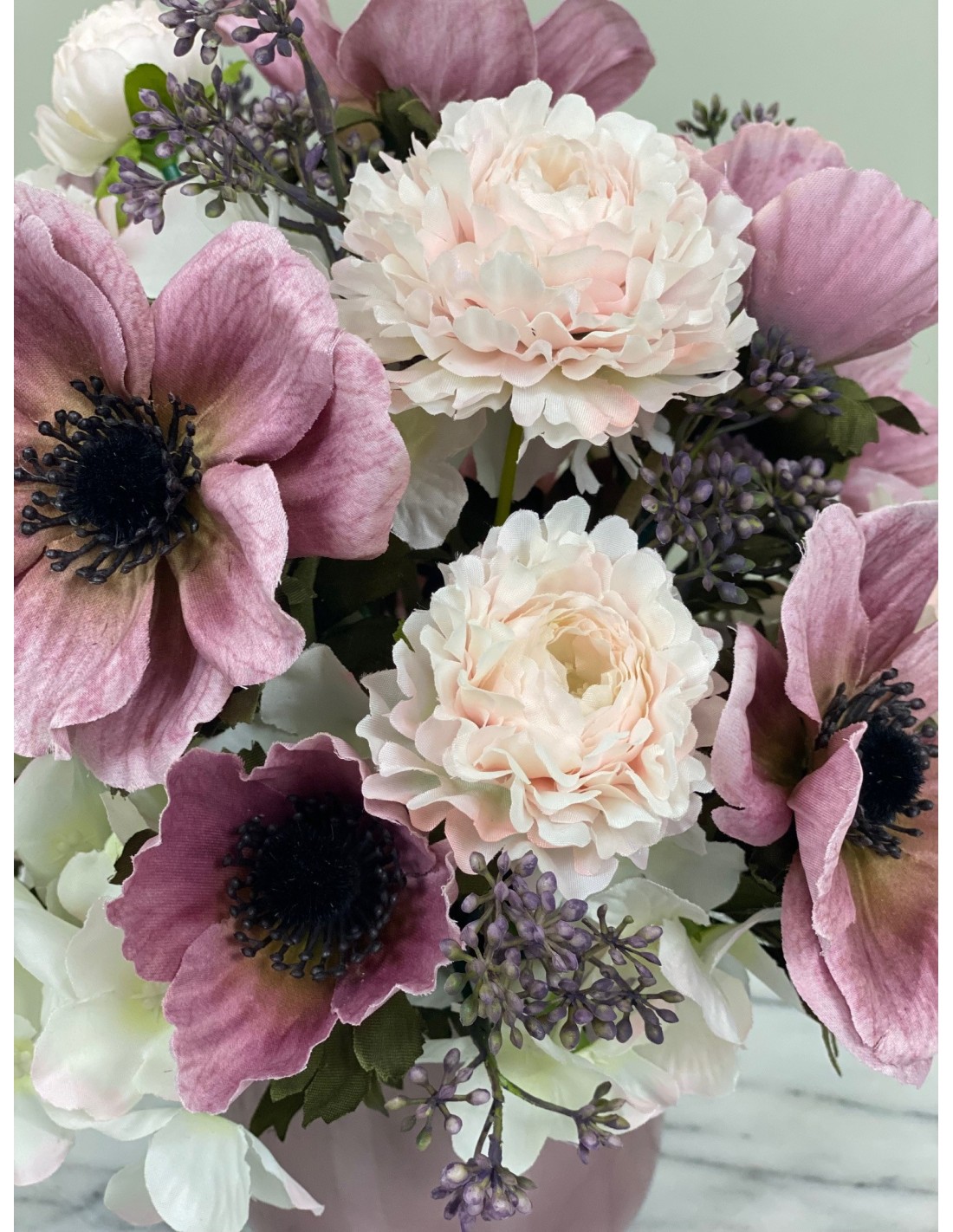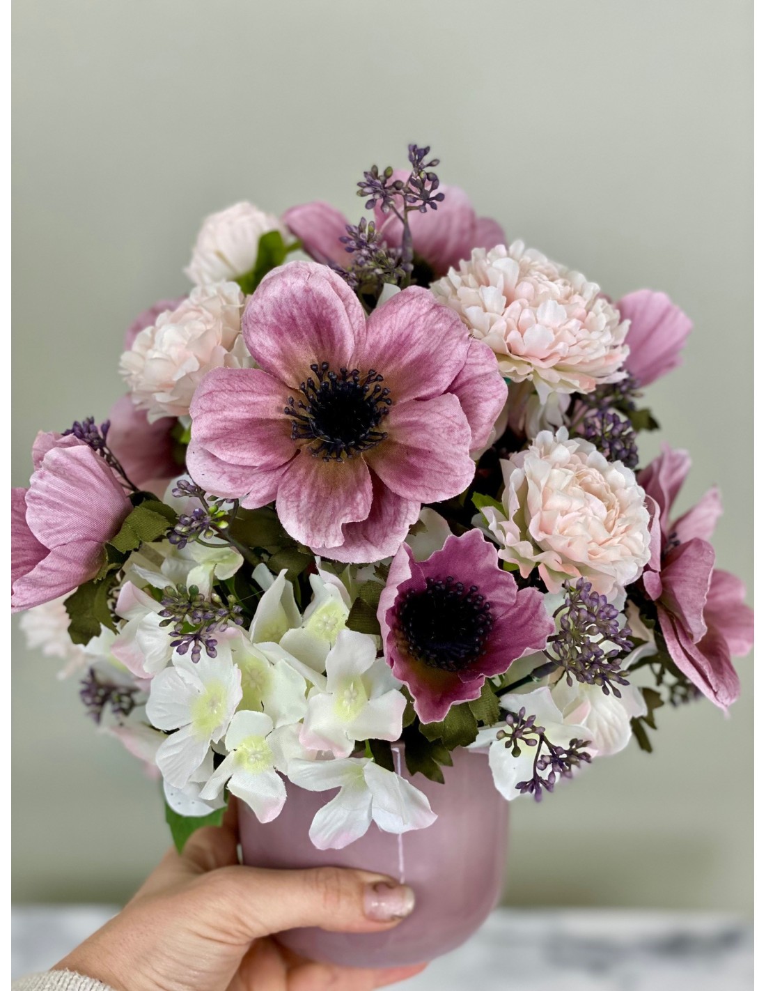 Romantisches Blumenarrangement in RosatönenDieses liebevoll arrangierte Blumenbouquet bringt zarte Farben und zeitlose Eleganz in jeden Raum. Die Komposition besteht aus fein abgestimmten Blüten in Rosa, Violett und Cremeweiß – darunter Anemonen, Nelken und Hortensien – die gemeinsam eine harmonische, beruhigende Wirkung erzeugen.🌸 Besondere Merkmale: Handgebundene, naturgetreue Seidenblumen (alte