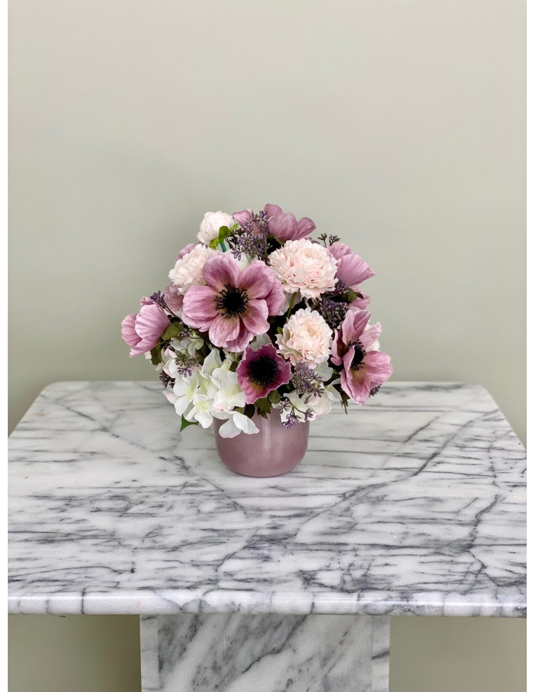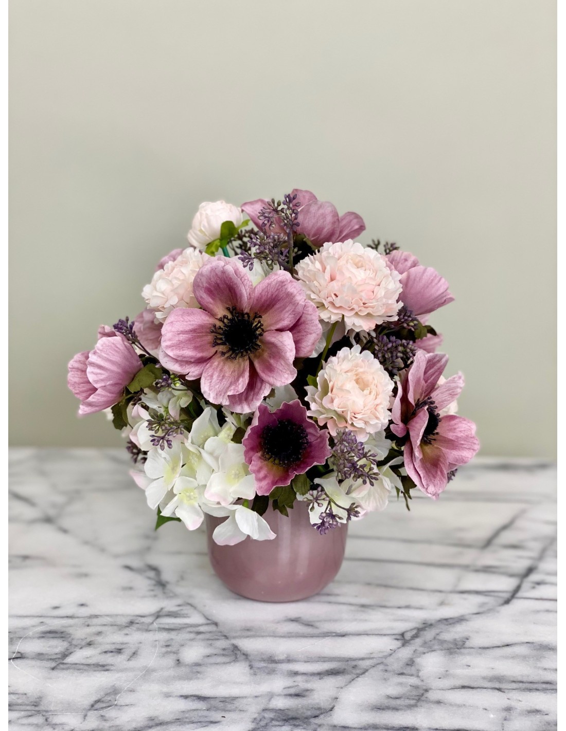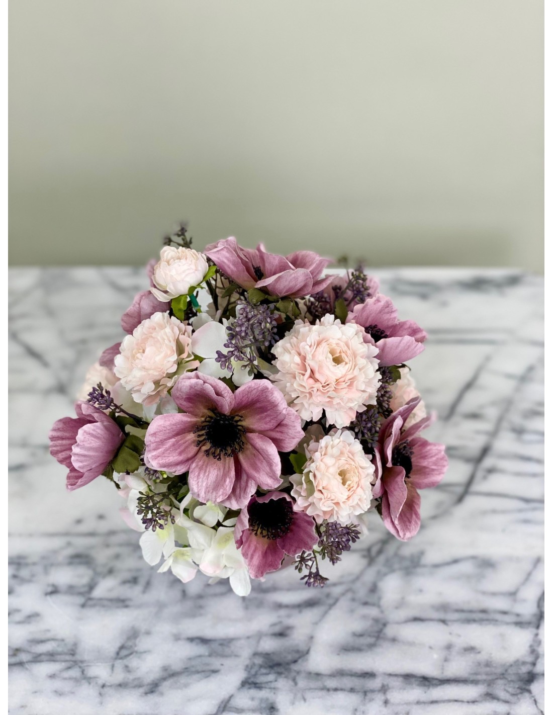 Romantisches Blumenarrangement in RosatönenDieses liebevoll arrangierte Blumenbouquet bringt zarte Farben und zeitlose Eleganz in jeden Raum. Die Komposition besteht aus fein abgestimmten Blüten in Rosa, Violett und Cremeweiß – darunter Anemonen, Nelken und Hortensien – die gemeinsam eine harmonische, beruhigende Wirkung erzeugen.🌸 Besondere Merkmale: Handgebundene, naturgetreue Seidenblumen (alte
