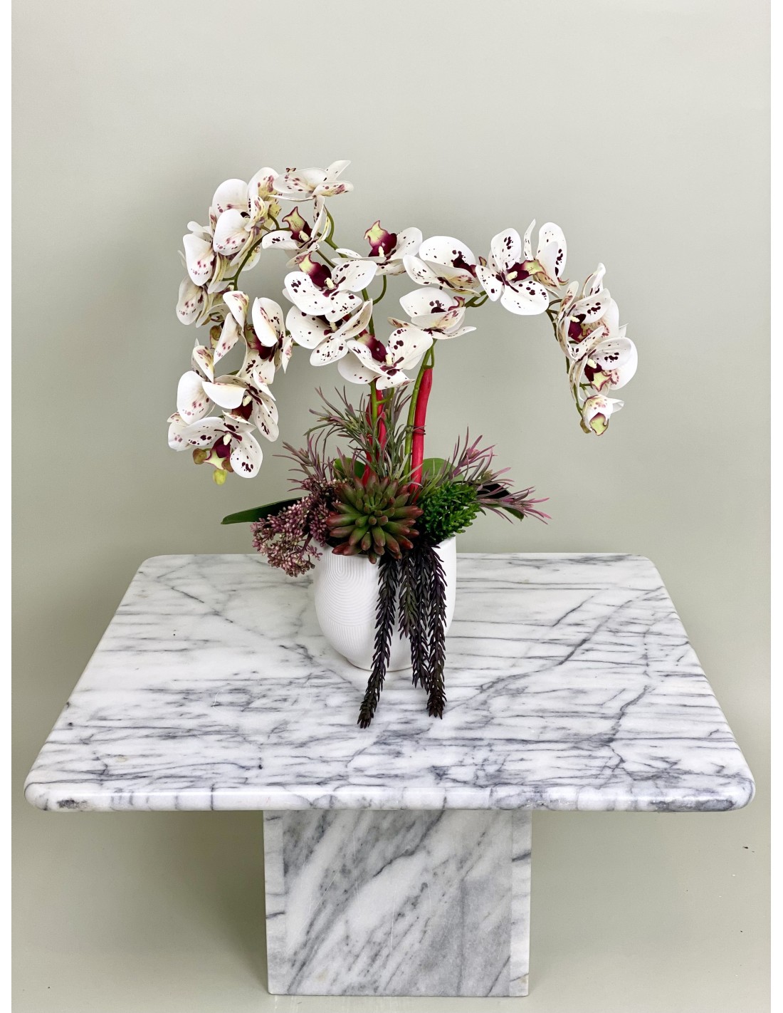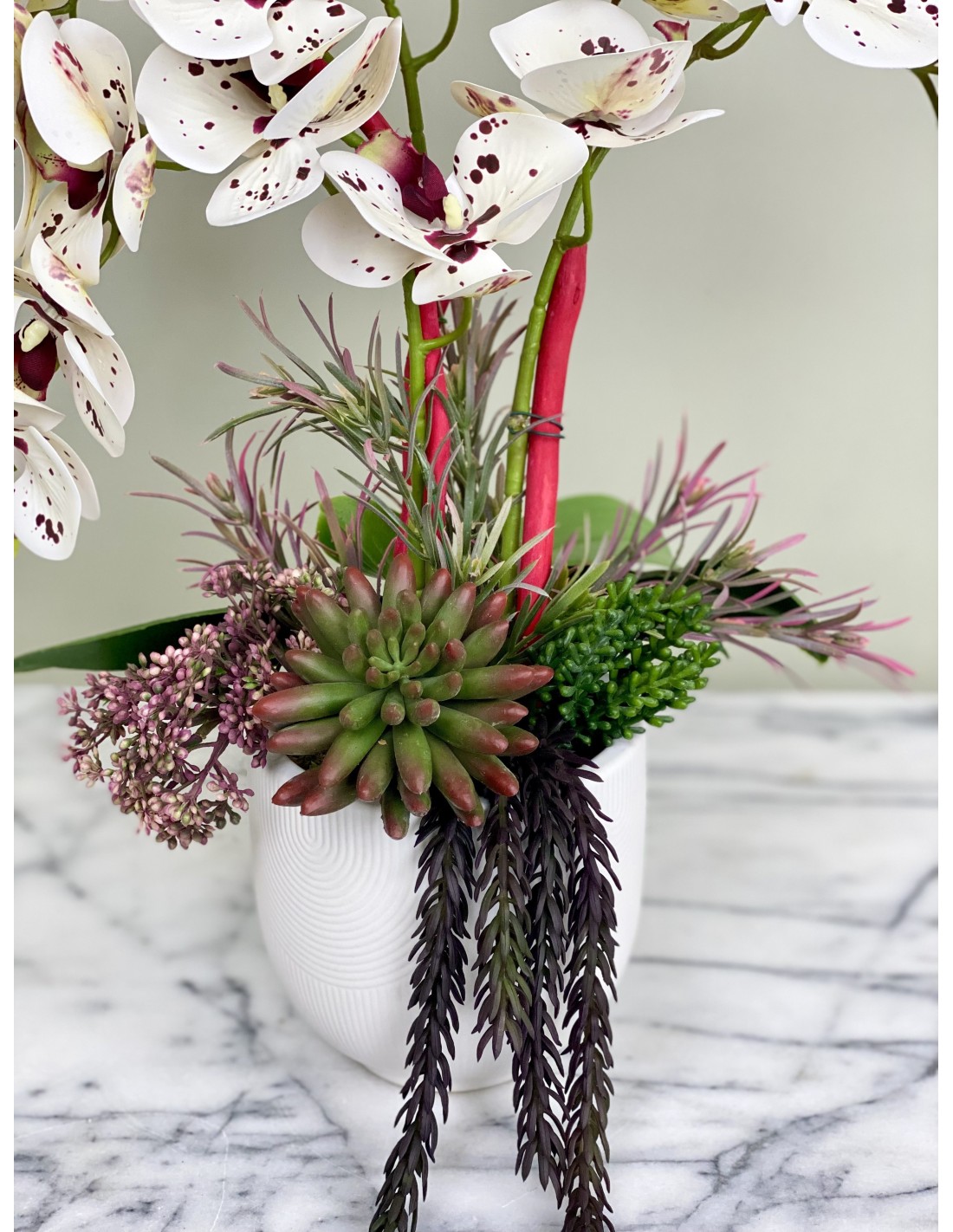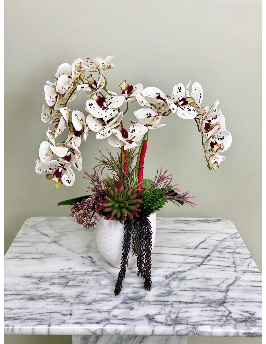 Diese Kunstorchidee (Phalaenopsis) mit drei Blütenrispen ist eine geschmackvolle Ergänzung zu ihrer Einrichtung im Wohnzimmer, Schlafzimmer oder Esszimmer.