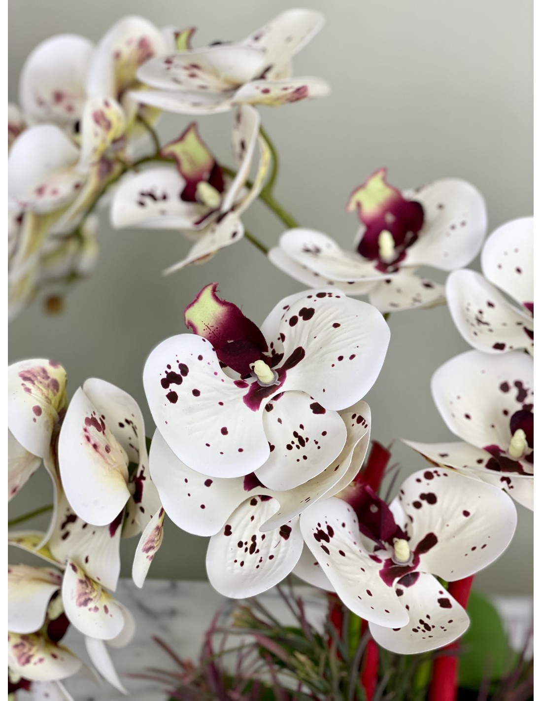 - Drei Blütendetriebe mit sehr schönen Blüten und einige Knospen, längsgerillte Blätter und Luftwurzeln, echt anfühlend.