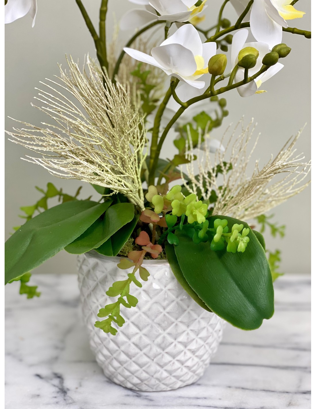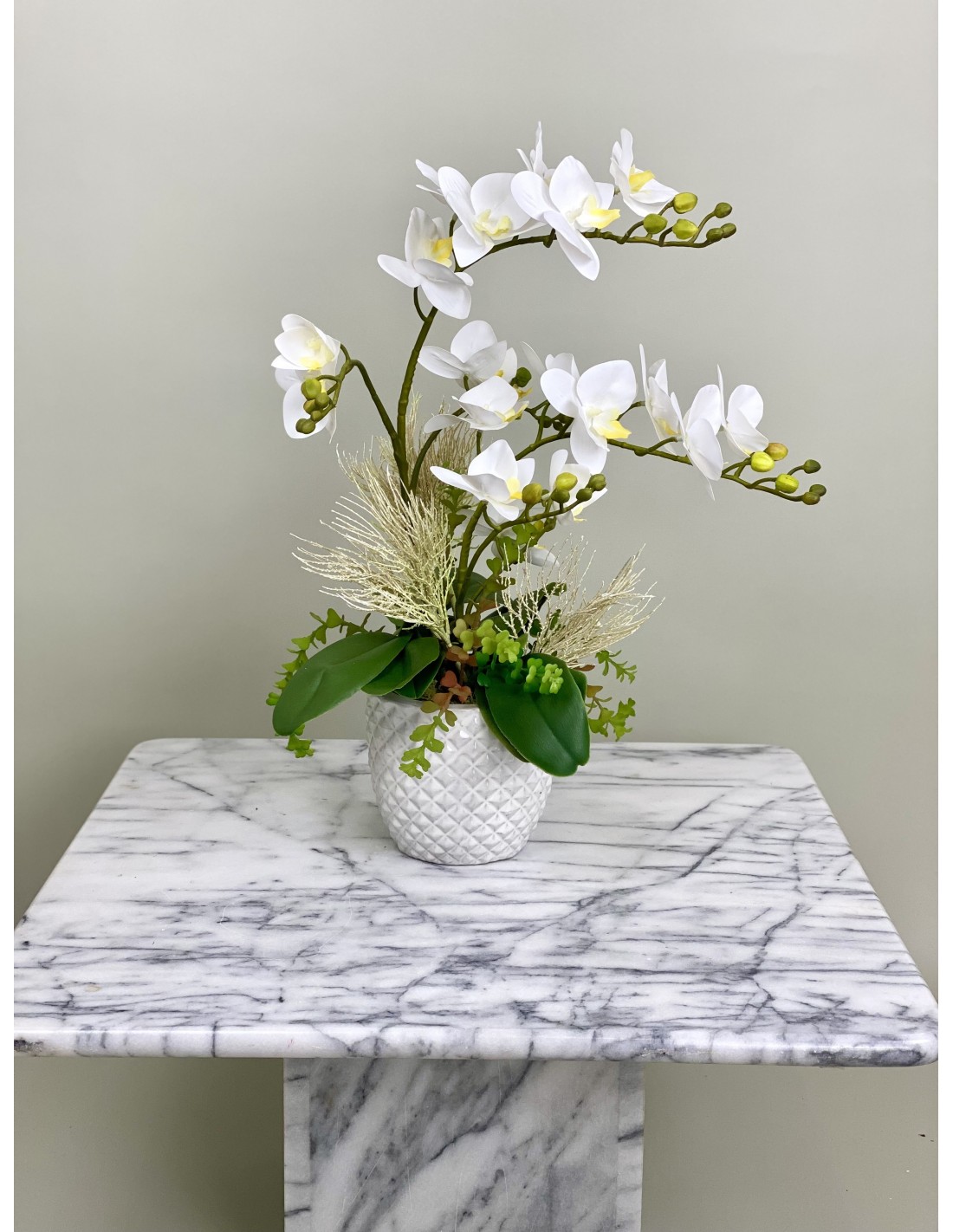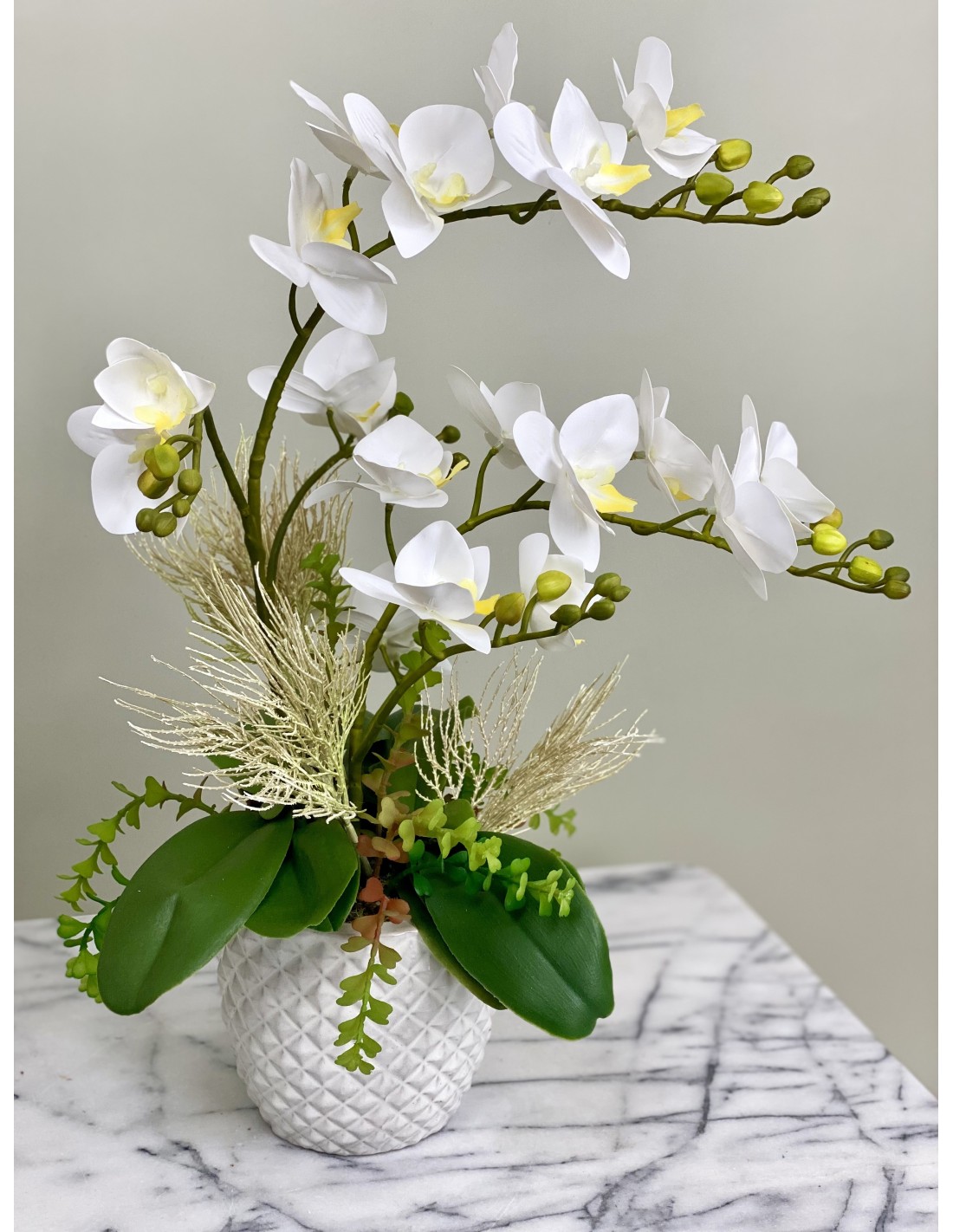 Orchideen Arrangement xx335Diese Kunstorchidee mit drei Blütenrispen in eine weisse Farbe ist eine geschmackvolle Ergänzung zu ihrer Einrichtung im Wohnzimmer, Schlafzimmer oder Esszimmer.- Gesamthöhe ca.53 cm. incl Topf (13 cm, Ø ca. 14 cm), Breite ca. 38 cm.- Die Blütendetriebe mit sehr schönen Blüten und eineg Knospen, längsgerillte Blätter und Luftwurzeln, echt anfühlend.