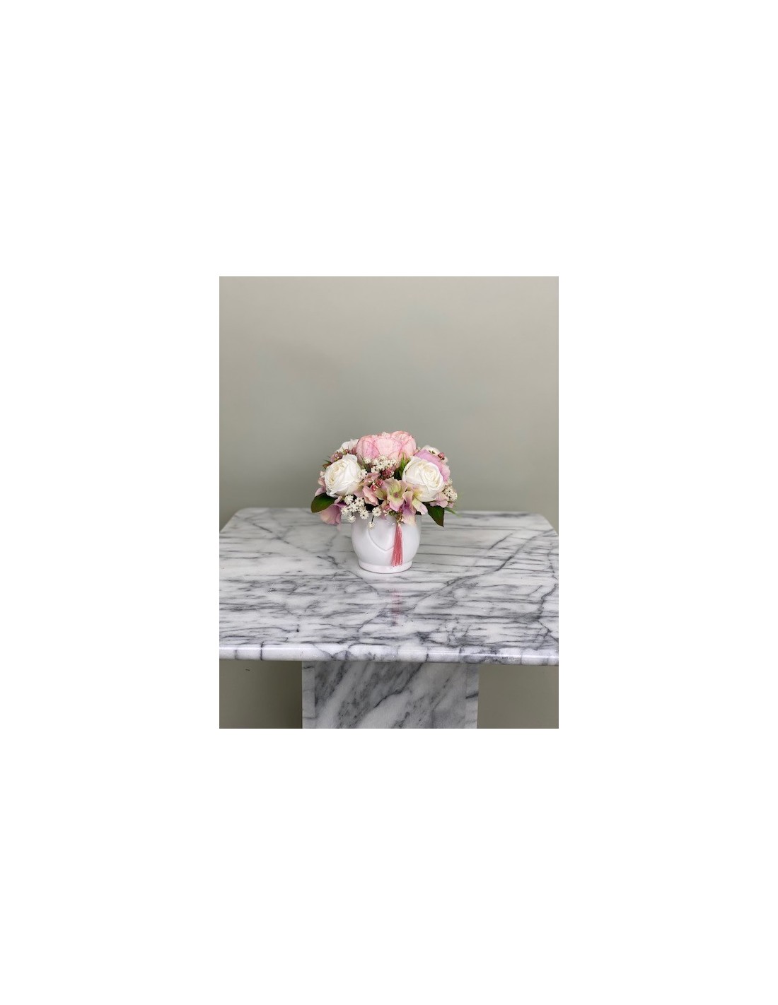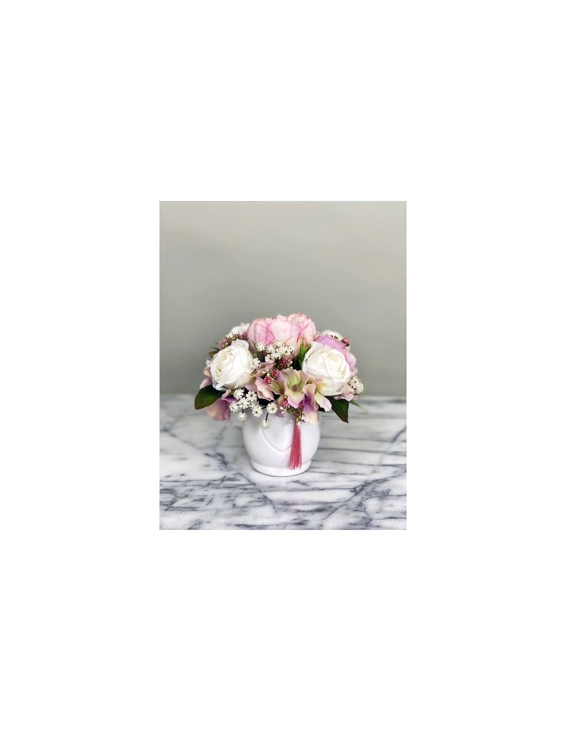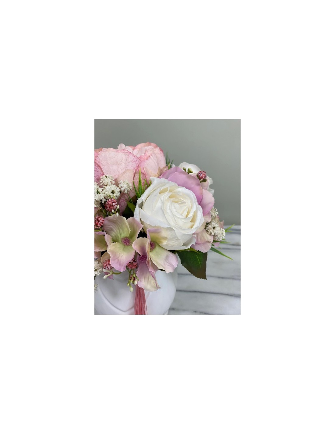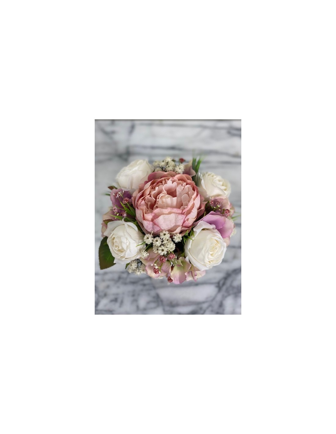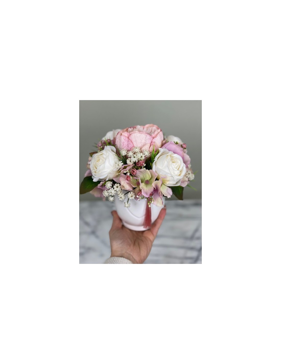 Haben Sie auch immer gerne einen blühenden Arrangement Blumen auf dem Tisch stehen, an dem Sie sich jeden Tag erfreuen? Nur schade, dass die Freude nur so lange hält, wie auch die Blumen blühen. An unseren handgefertigten Arrangements aus Kunststoff können Sie sich das ganze Jahr über erfreuen.Kleines Arrangement in einer Vase hat eine Höhe von ca. 21 cm, Gesamtdurchmesser von ca. 22 cm.In einem r