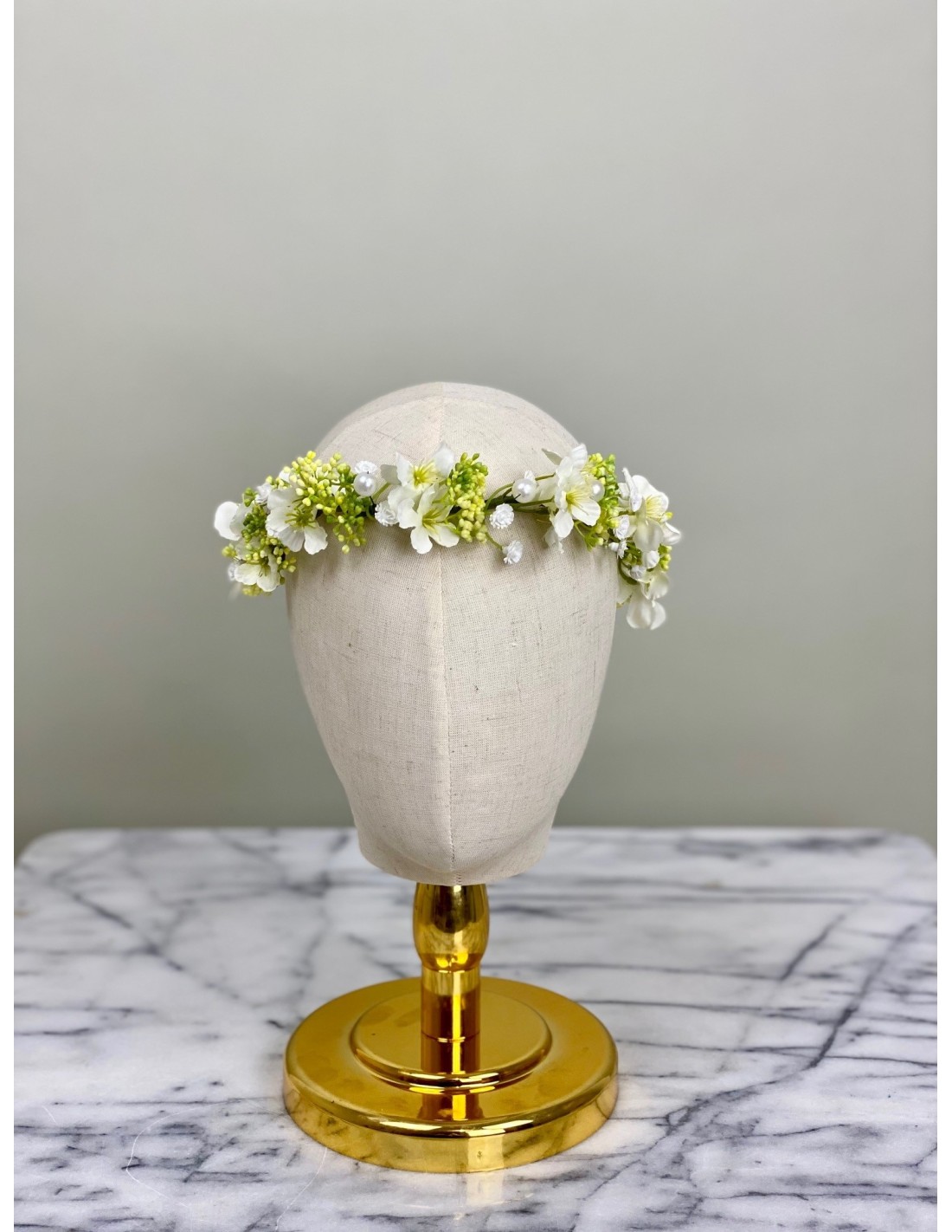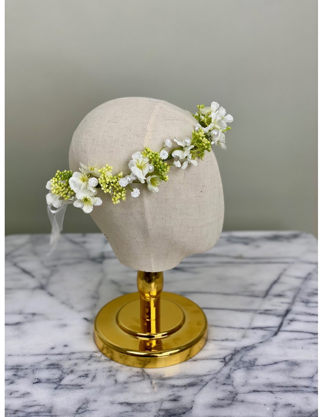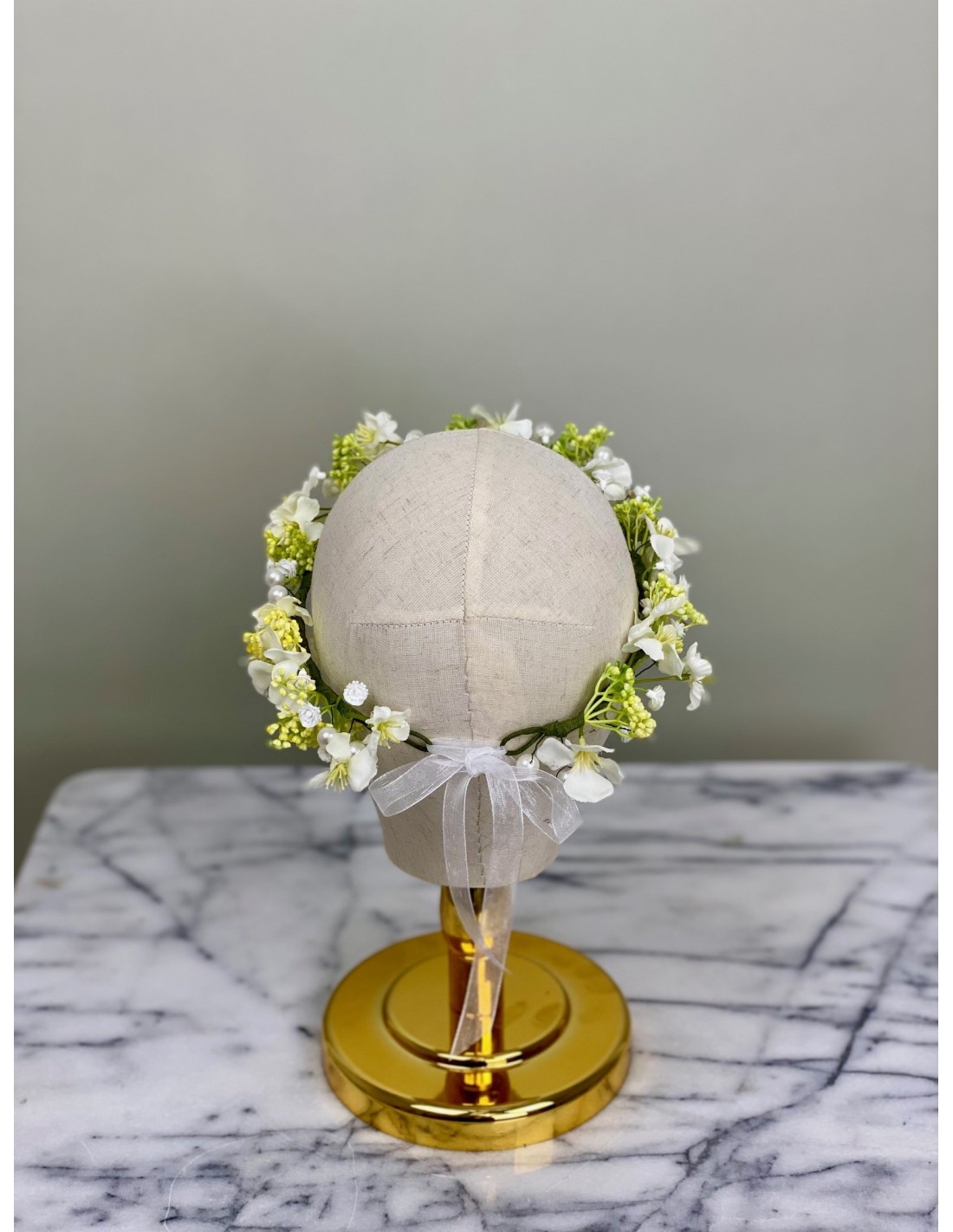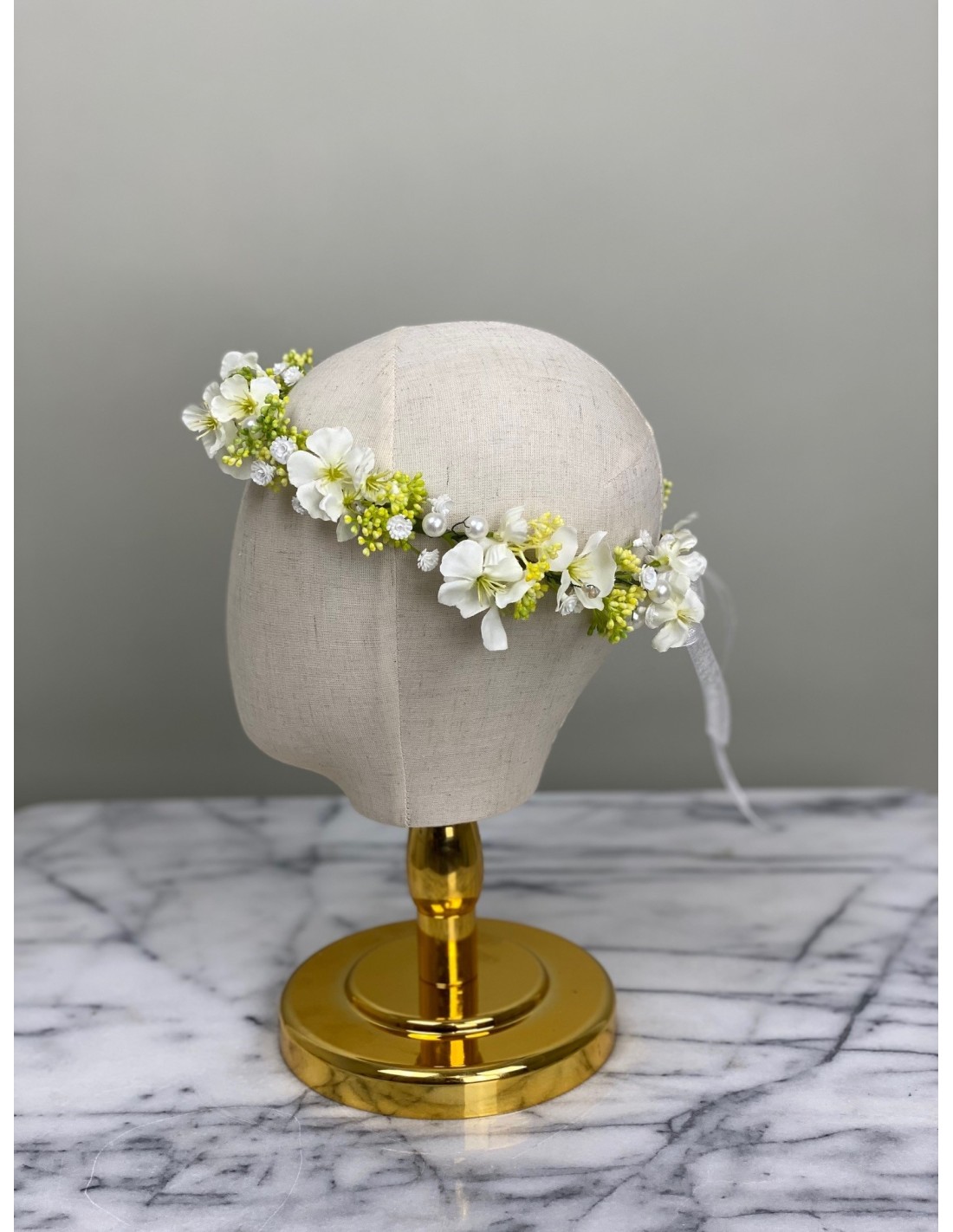 Diese zarte Blumenkrone wurde mit viel Liebe zum Detail handgefertigt. Künstliche Blüten in Weiß und Gelb, ergänzt mit Perlen, verleihen ihr einen eleganten und romantischen Look.