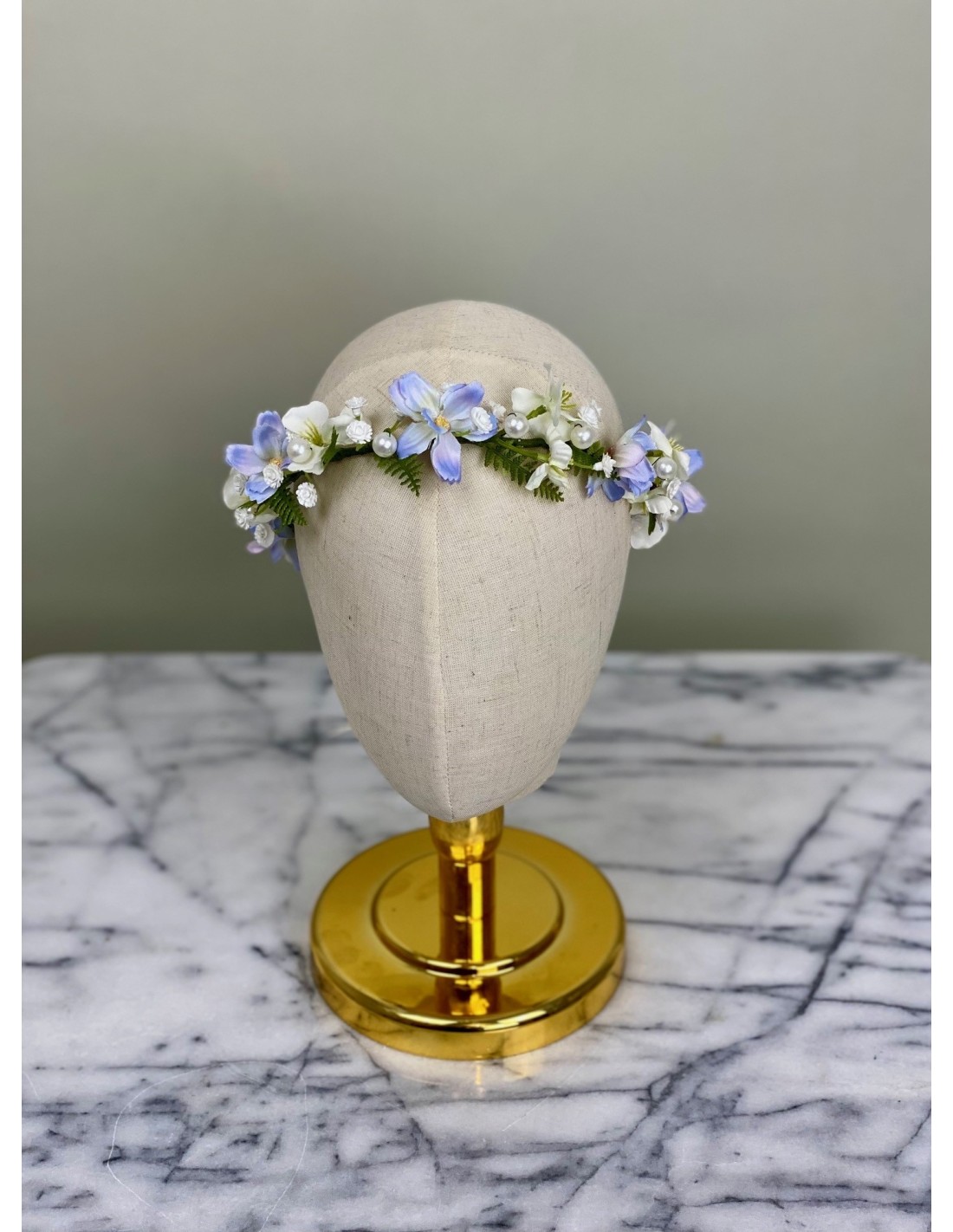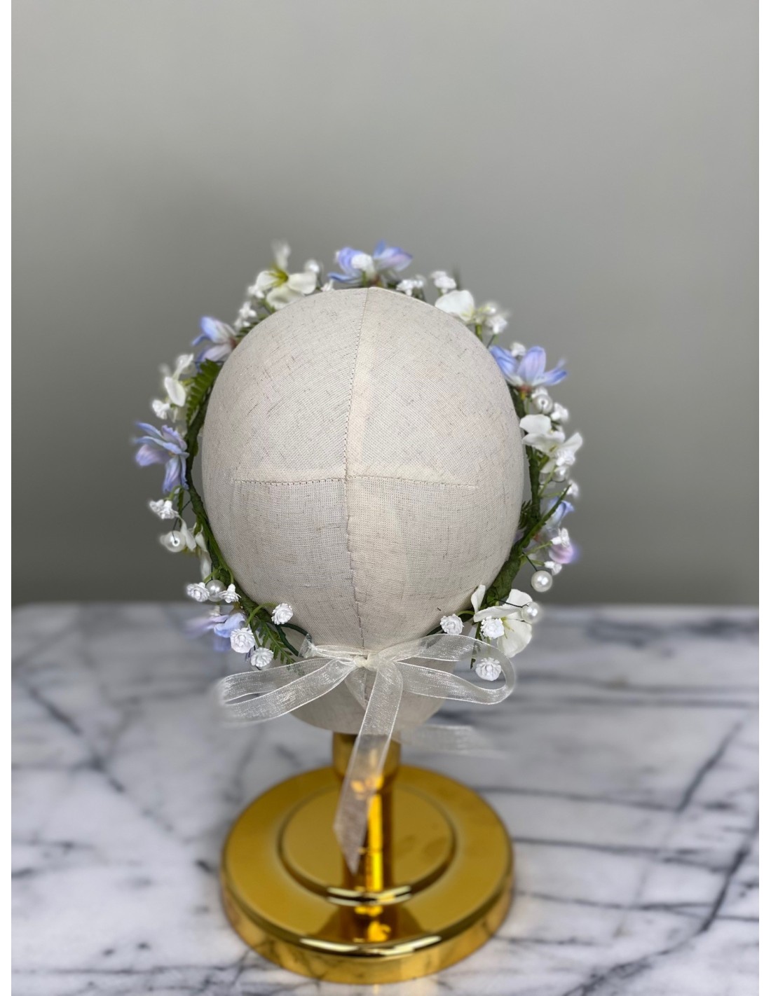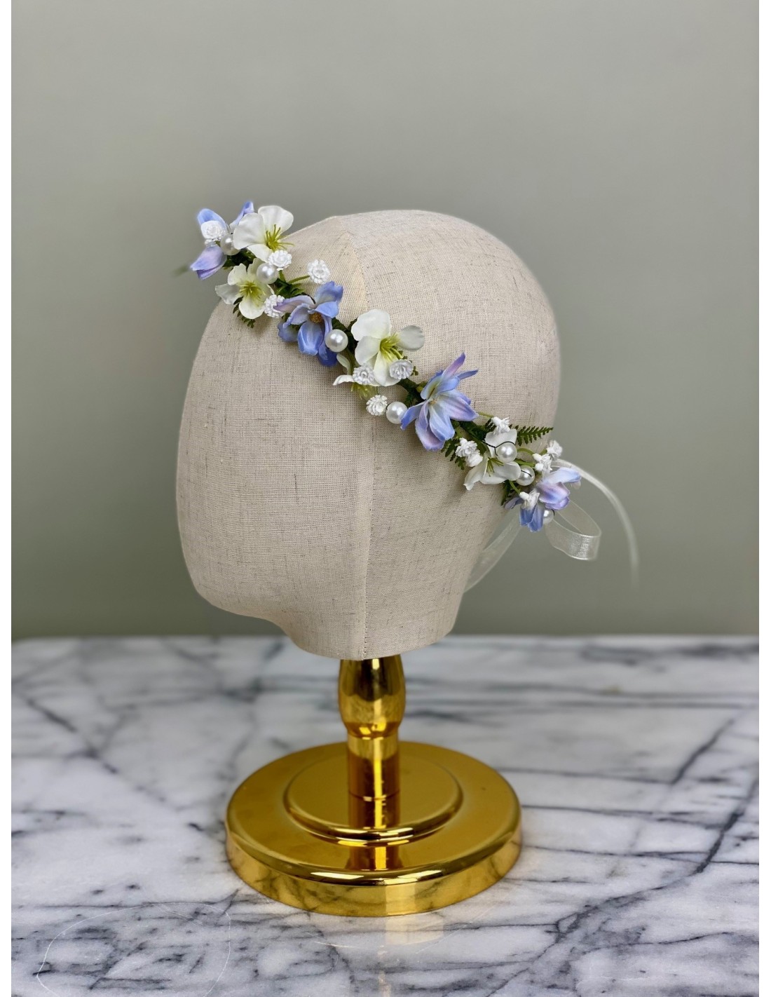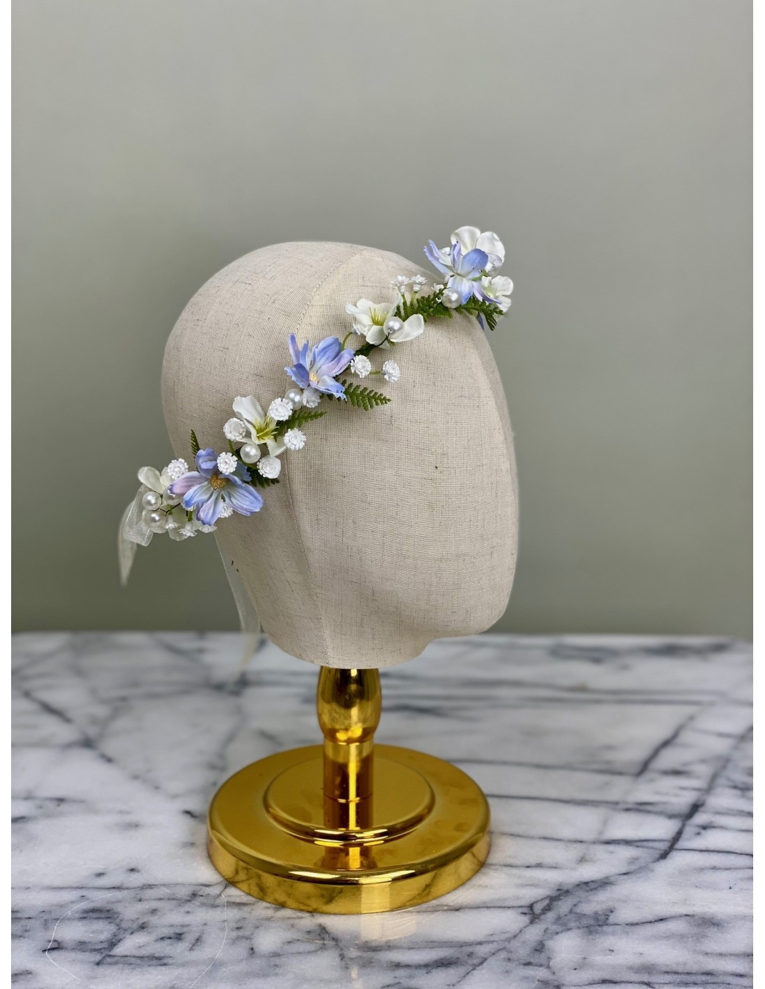 Diese zarte Blumenkrone wurde mit viel Liebe zum Detail handgefertigt. Künstliche Blüten in Weiß und Blau, ergänzt mit Perlen und Kristallen, verleihen ihr einen eleganten und romantischen Look.