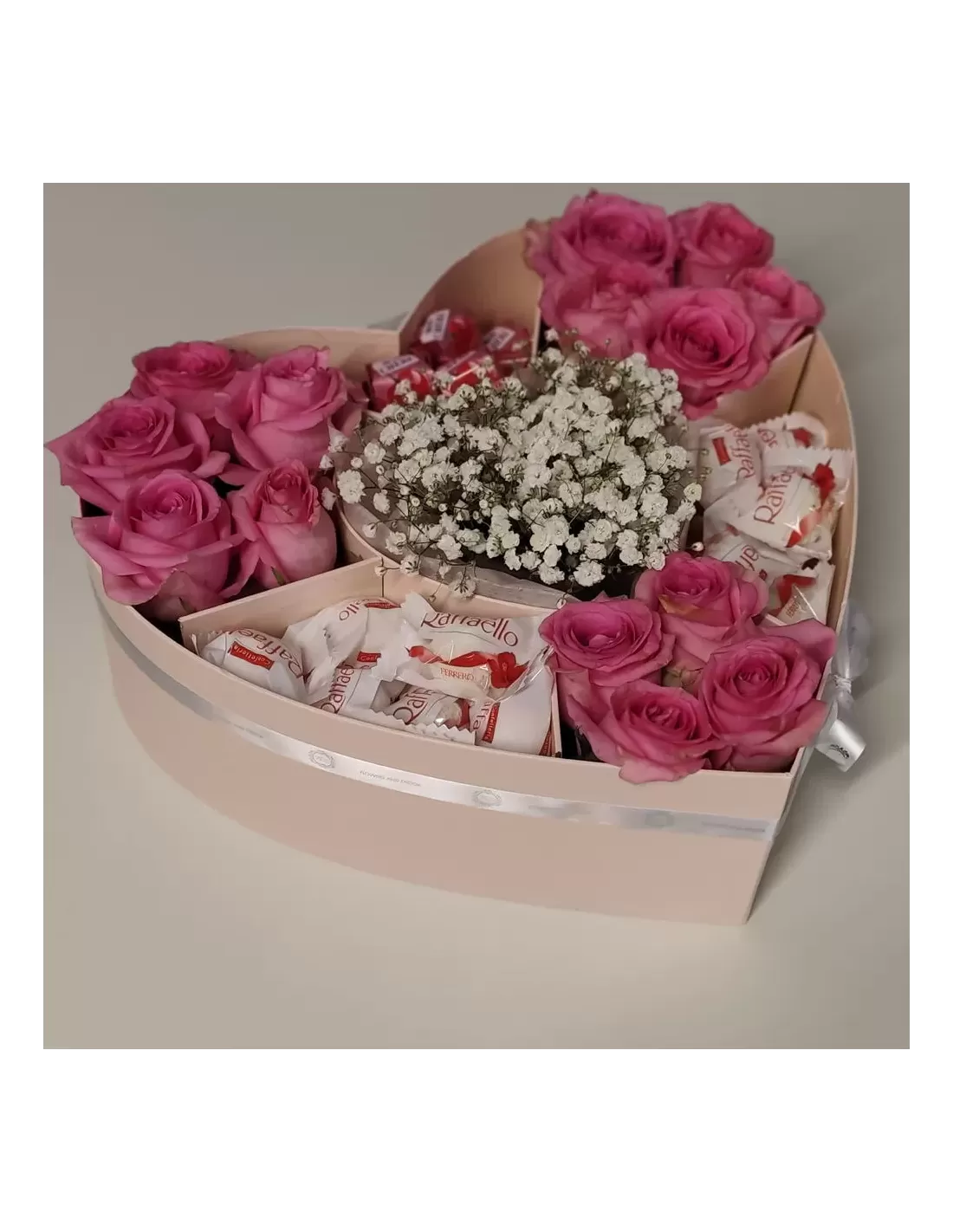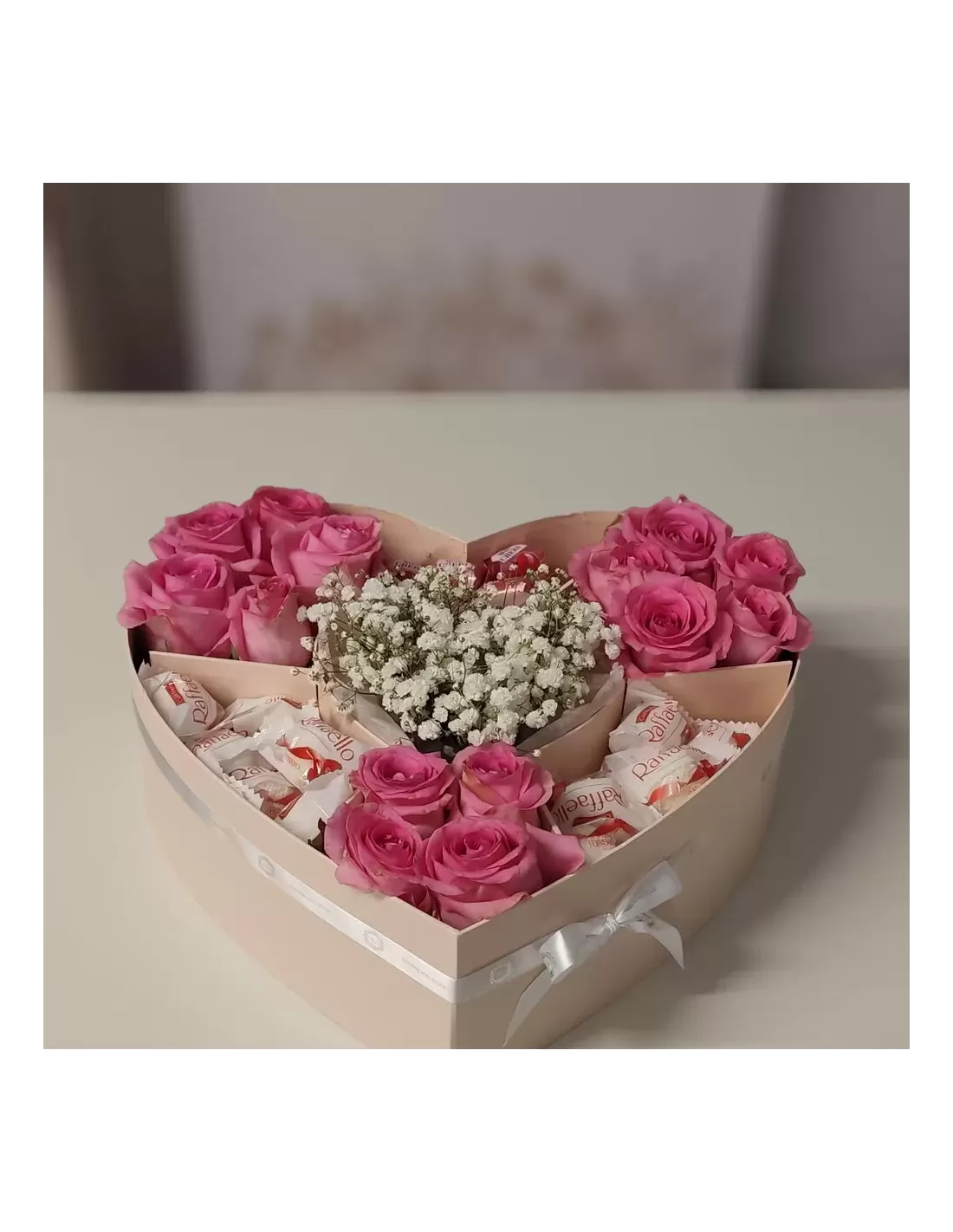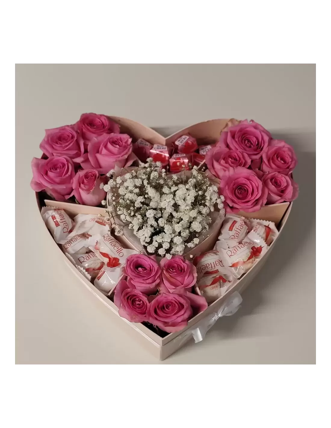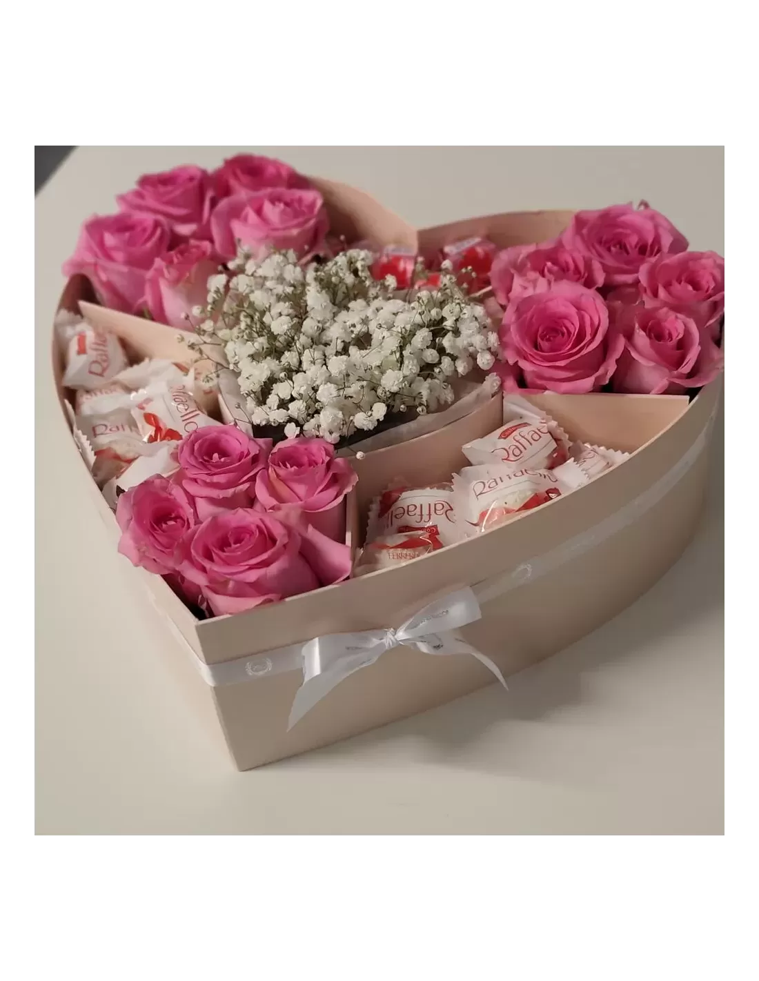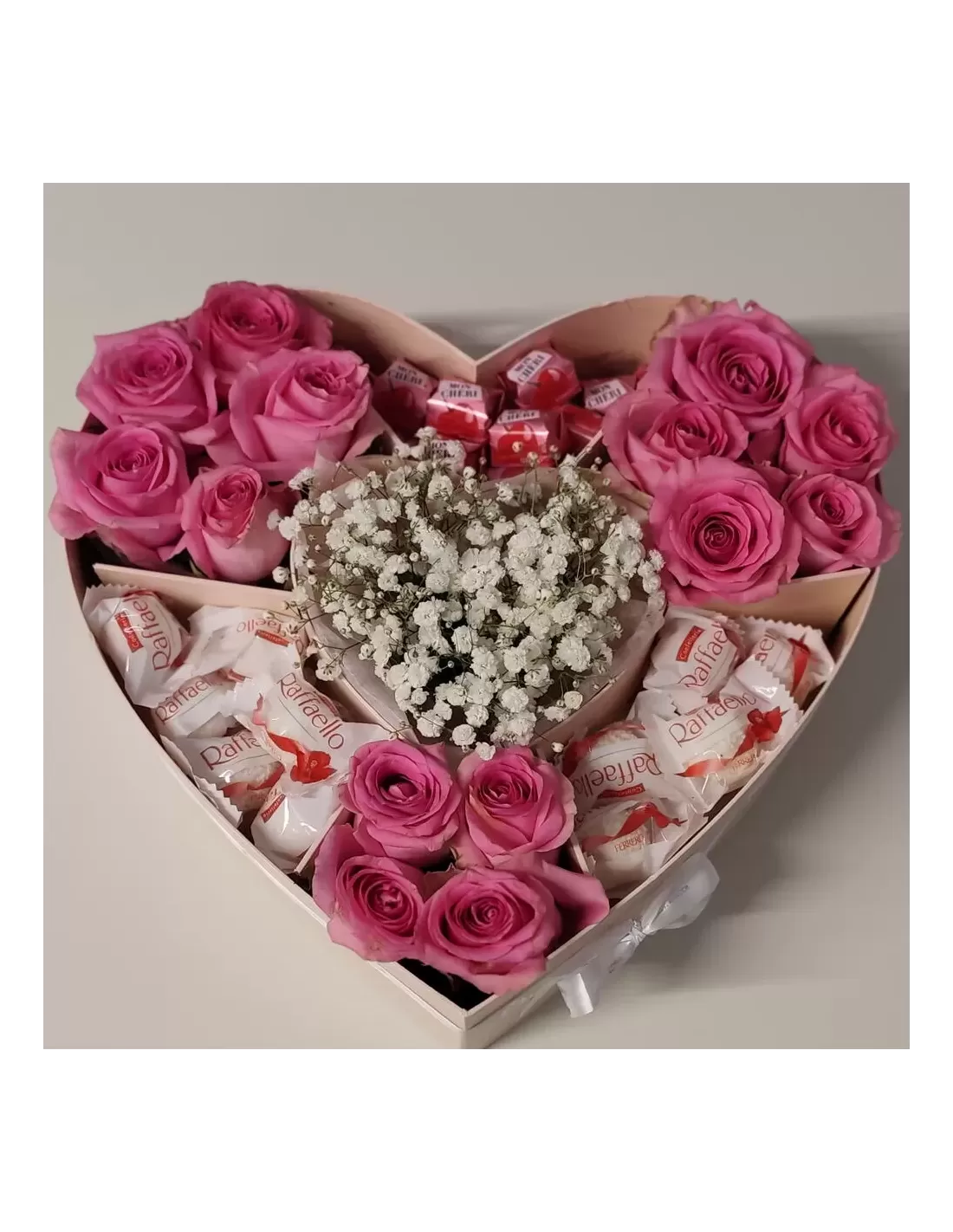 Diese liebevoll gestaltete Herzbox ist mehr als nur ein Geschenk – sie ist eine Botschaft voller Zuneigung. Zarte rosa Rosen treffen auf süsse Raffello und Mon Cheri -Pralinen, feine Schleierkraut-Blüten und schaffen zusammen eine harmonische, romantische Komposition.