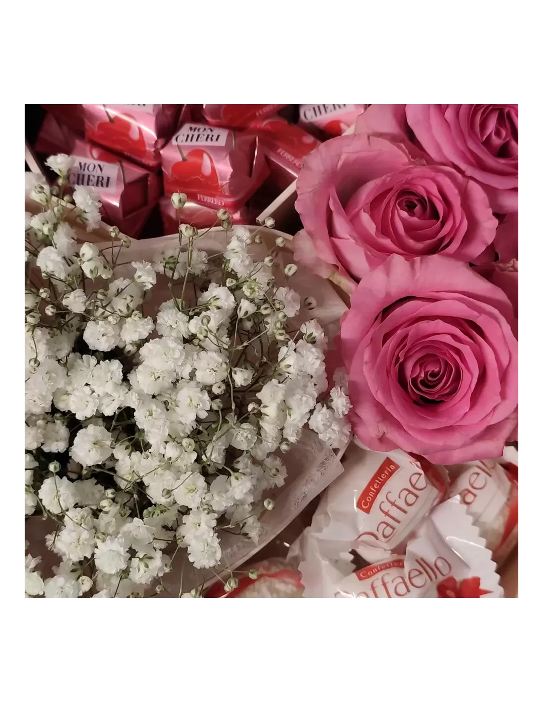 Die edle Herzform macht dieses Arrangement zu einem besonderen Blickfang und eignet sich perfekt als Geschenk zum Geburtstag, Jahrestag, Valentinstag oder einfach, um einem geliebten Menschen eine Freude zu bereiten. Die frischen Rosen werden sorgfältig arrangiert und mit süssen Raffello-Pralinen und Mon Cheri kombiniert – eine wunderschöne Mischung aus Blumen und Genuss. Details: Frische rosa Rosen Feines Schleierkraut (Gypsophila) Raffello, Mon Cheri -Pralinen