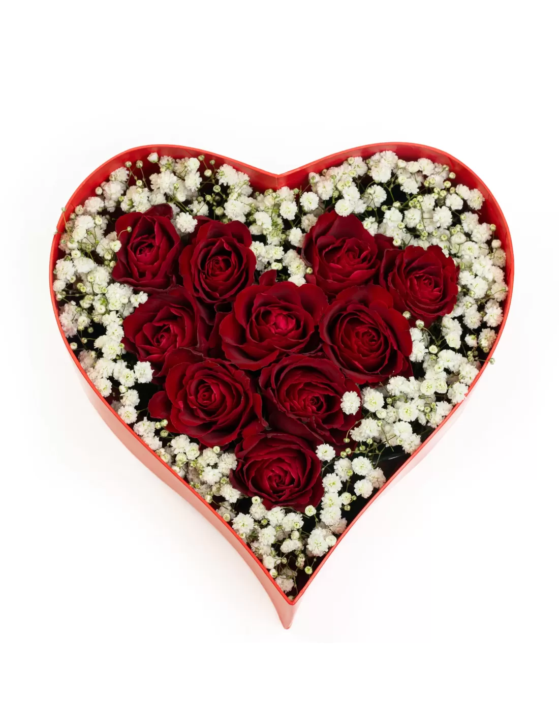 Herzbox mit frischen roten Rosen & Schleierkraut
