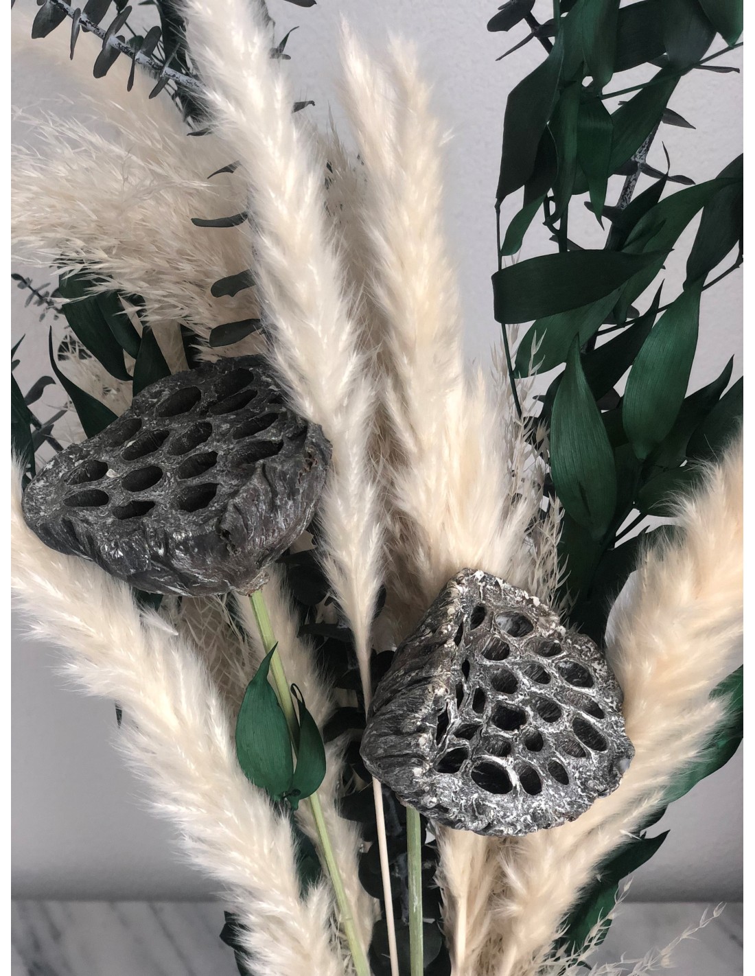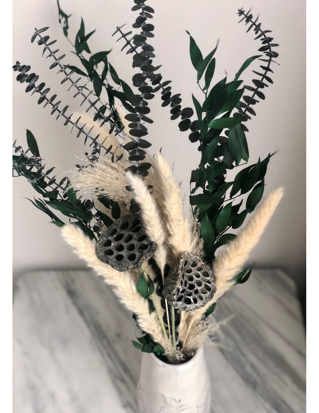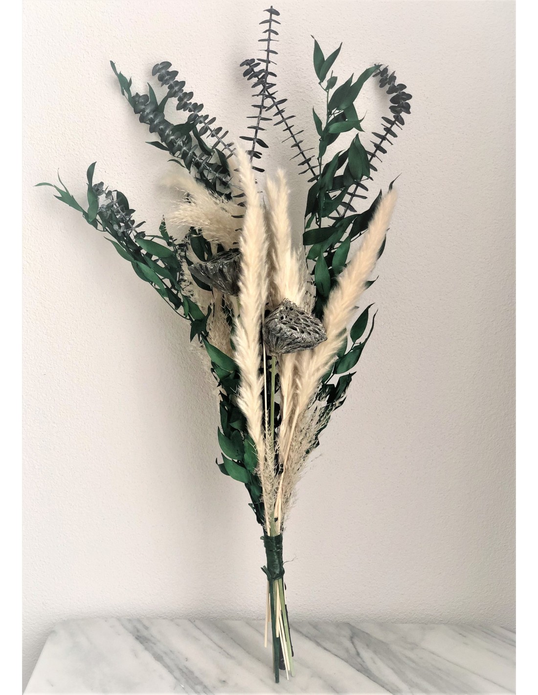 Der Strauss hat eine Höhe von ca. 75 cm und breiteste Stelle ca. 35cm. Im Trockenblumenstrauss sind Eukalyptus, Pampasgras, Ruskus, Lotus enthalten.
