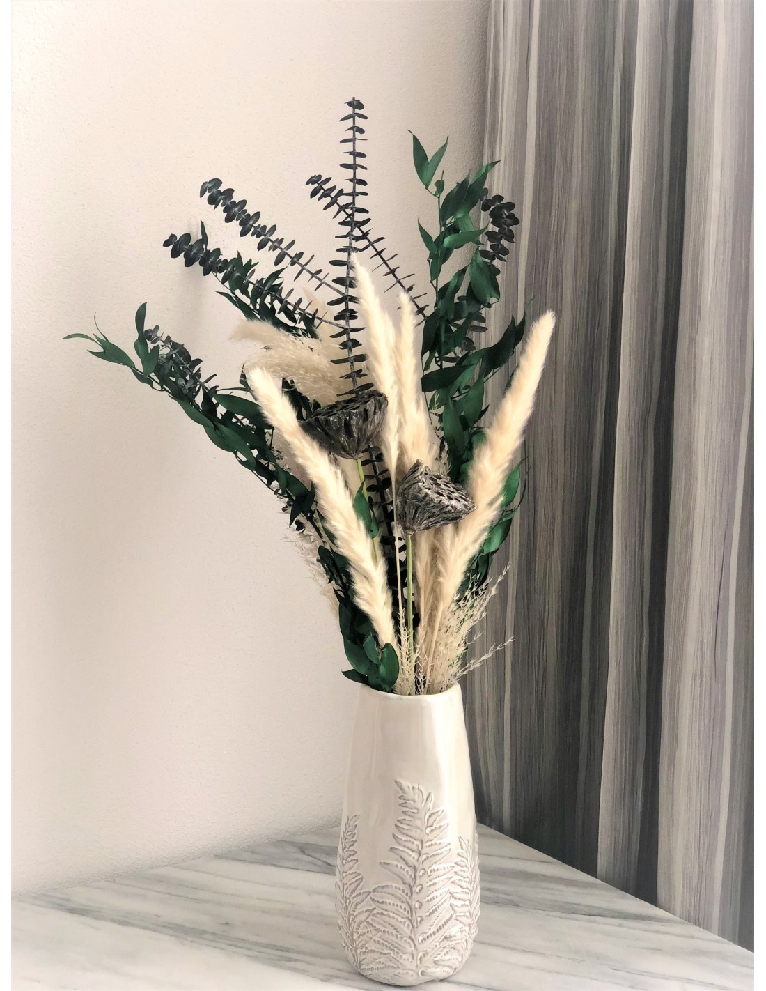 Dieser handgebundene Strauß aus Trockenblumen sorgt für langanhaltende Freude in deinem Zuhause! Der Strauss hat eine Höhe von ca. 75 cm und breiteste Stelle ca. 35cm. Im Trockenblumenstrauss sind Eukalyptus, Pampasgras, Ruskus, Lotus enthalten. Der Strauß kommt ohne Vase.Wenn Sie die Vase mit dem Arrangement kaufen möchten, schreiben Sie uns: info@flowersdecor.chVase hat eine Höhe von ca. 26 cm.