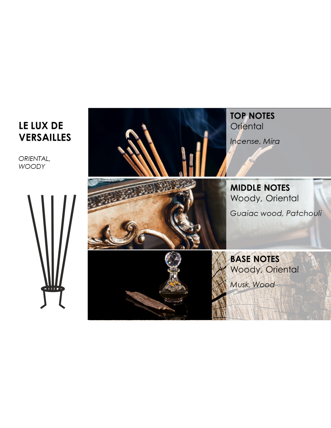 "Le Lux De Versailles" - Raumduft 100 mlGeruchstyp: orientalisch, holzigKOPFNOTEN: Weihrauch, MyrrheMITTELNOTEN: Gaiac-Holz, PatchouliAPPARATIVE NOTEN: Moschus, Holz Ein Duft von extremem Luxus. Ein Hauch von französischem Château – Weihrauch, Myrrhe und warme Holznoten, umhüllt von süßer Raffinesse.LE LUX DE VERSAILLES ist eine Komposition für ein exklusives und schickes Wohnambiente. Für eine Pe