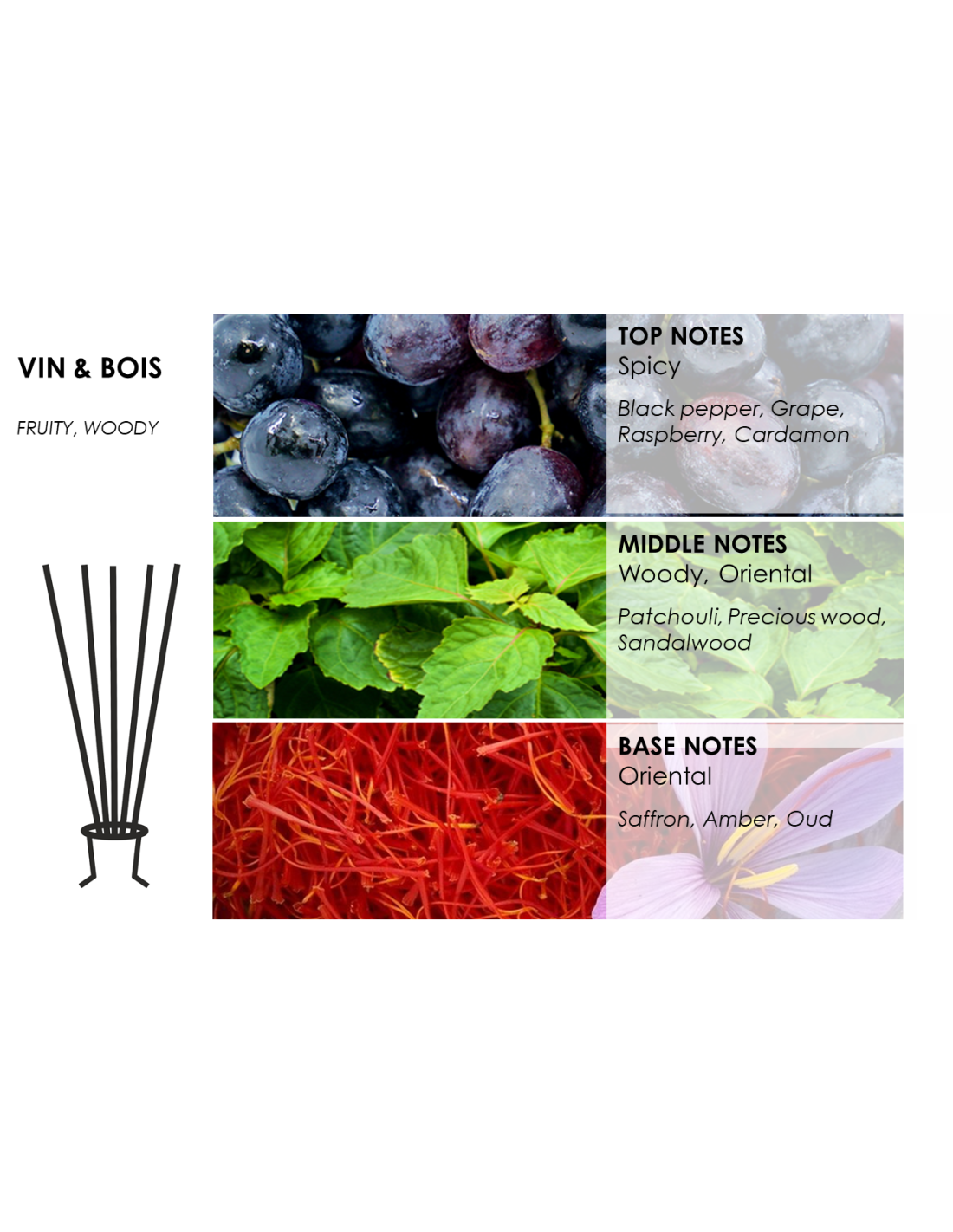 VIN & BOIS ist ein warmer, klassischer Raumduft mit einer Gourmand-Mischung aus süßen Trauben, Himbeeren und subtilen Holznoten.