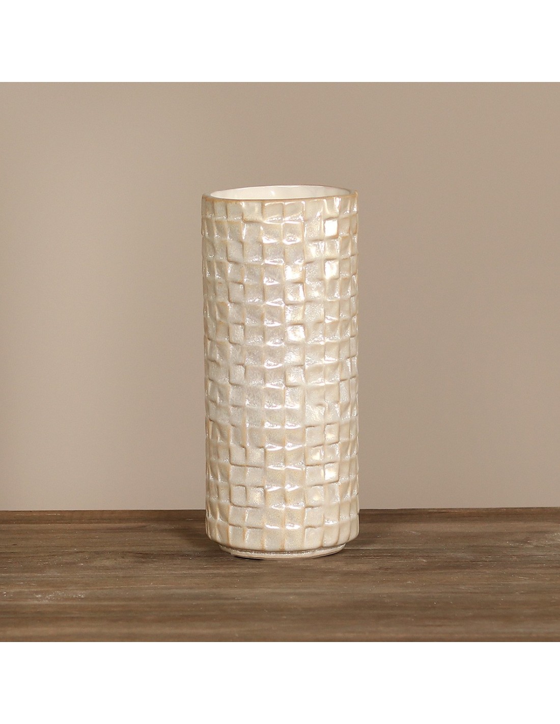 Stilvolle Keramik Vase in Creme mit edler Mosaikstruktur. Die glänzende Oberfläche und das elegante Design machen sie zu einem zeitlosen Blickfang. Mit einer Höhe von 22 cm eignet sich die Vase perfekt für mittelgroße Blumenarrangements, dekorative Zweige oder Trockenblumen.