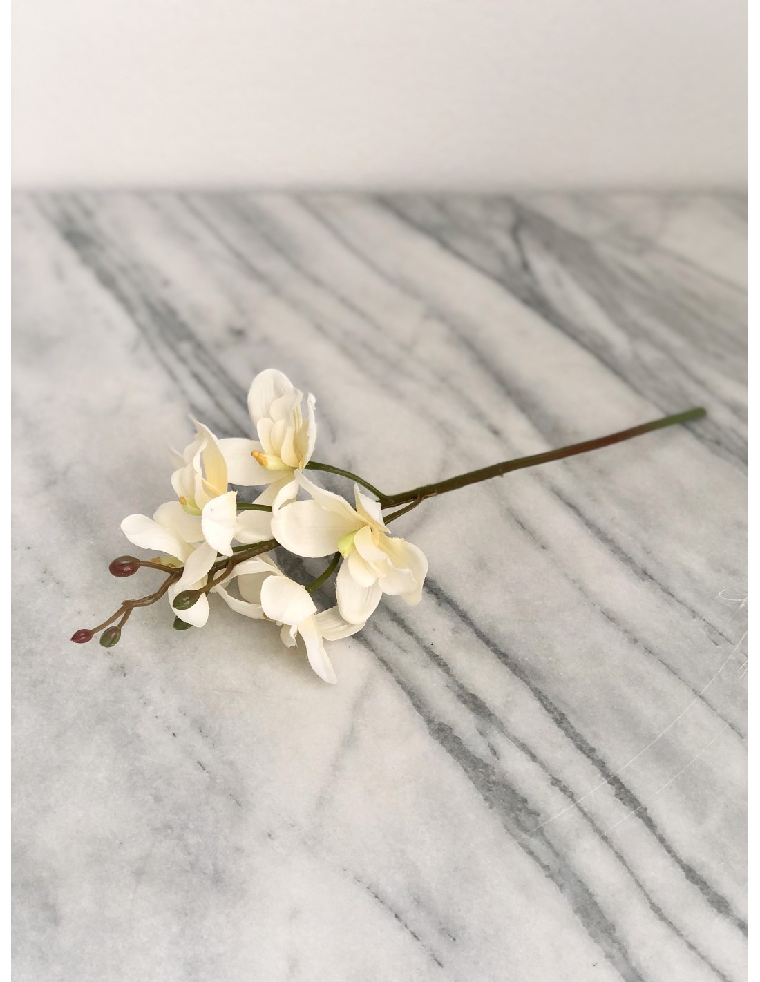 Künstlicher Cymbidium-Orchideenzweig mit 5 offenen Orchideenblüten in Farbe creme. Der Kunstzweig ist ca. 34 cm lang.
