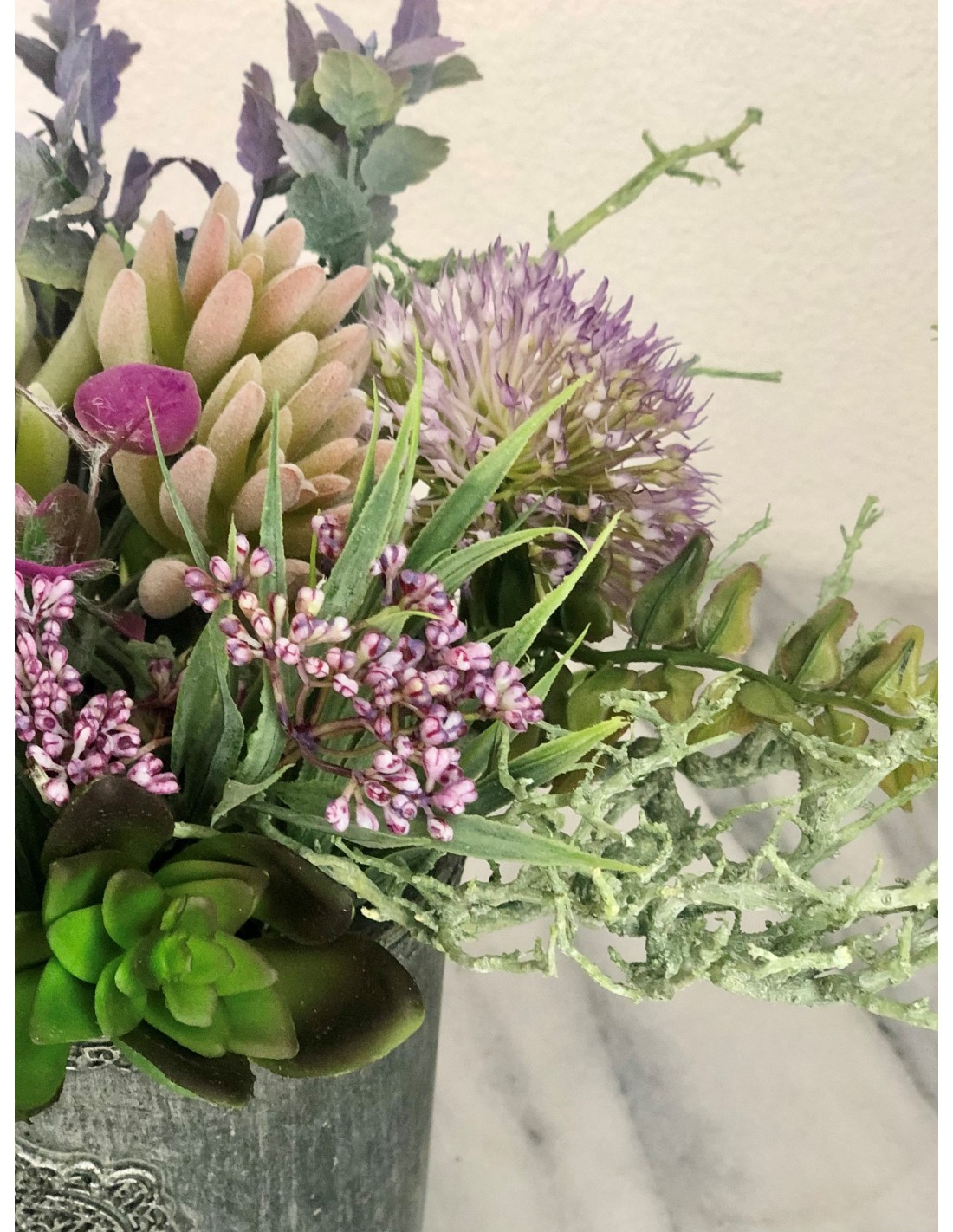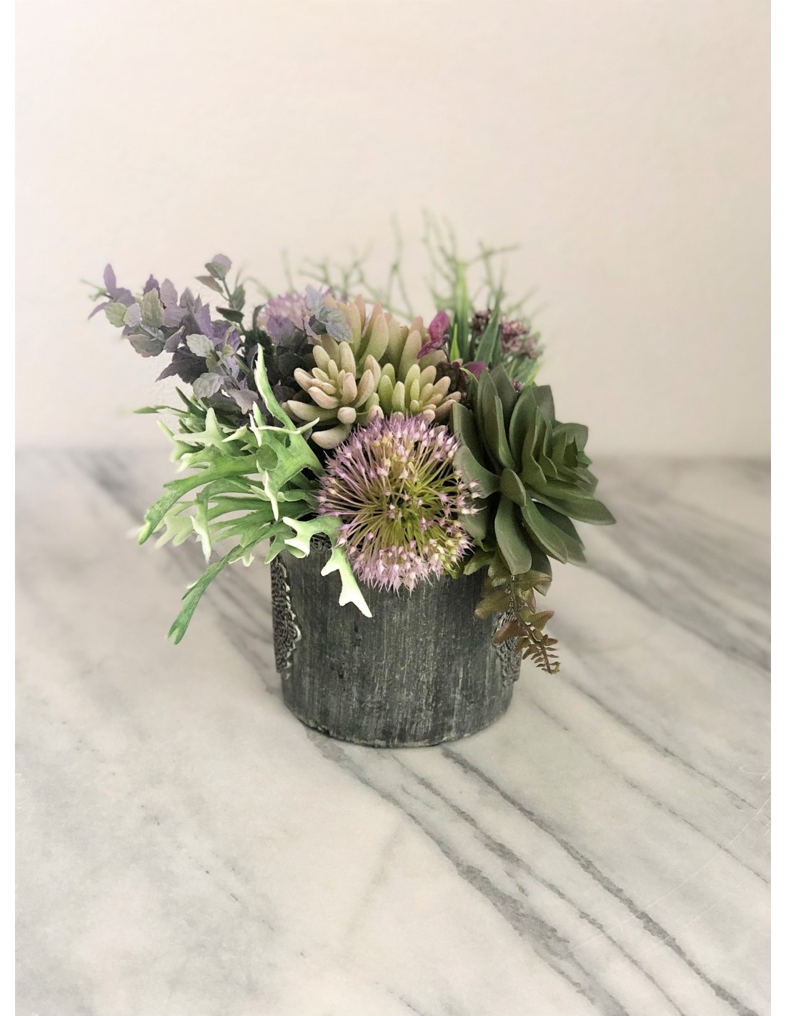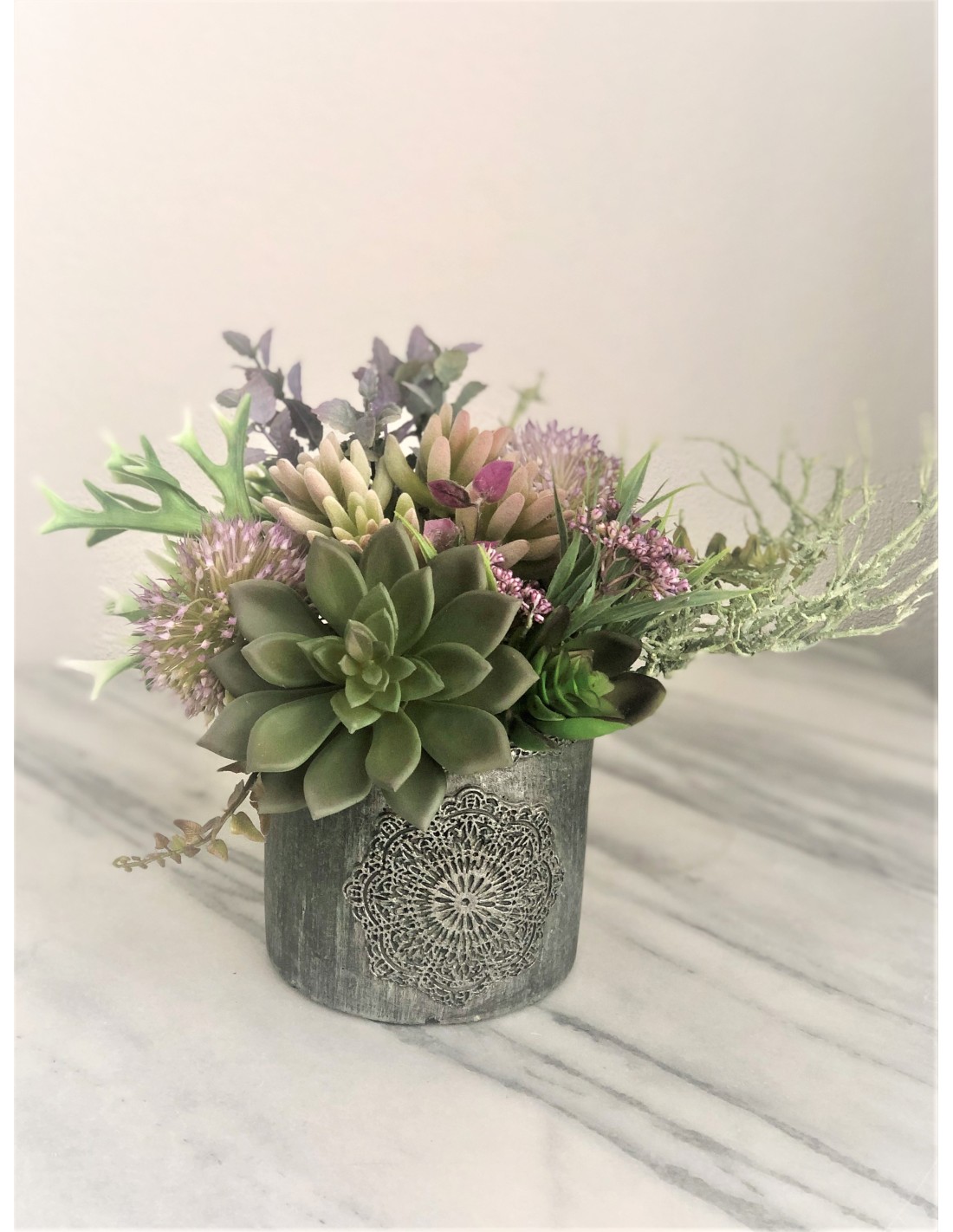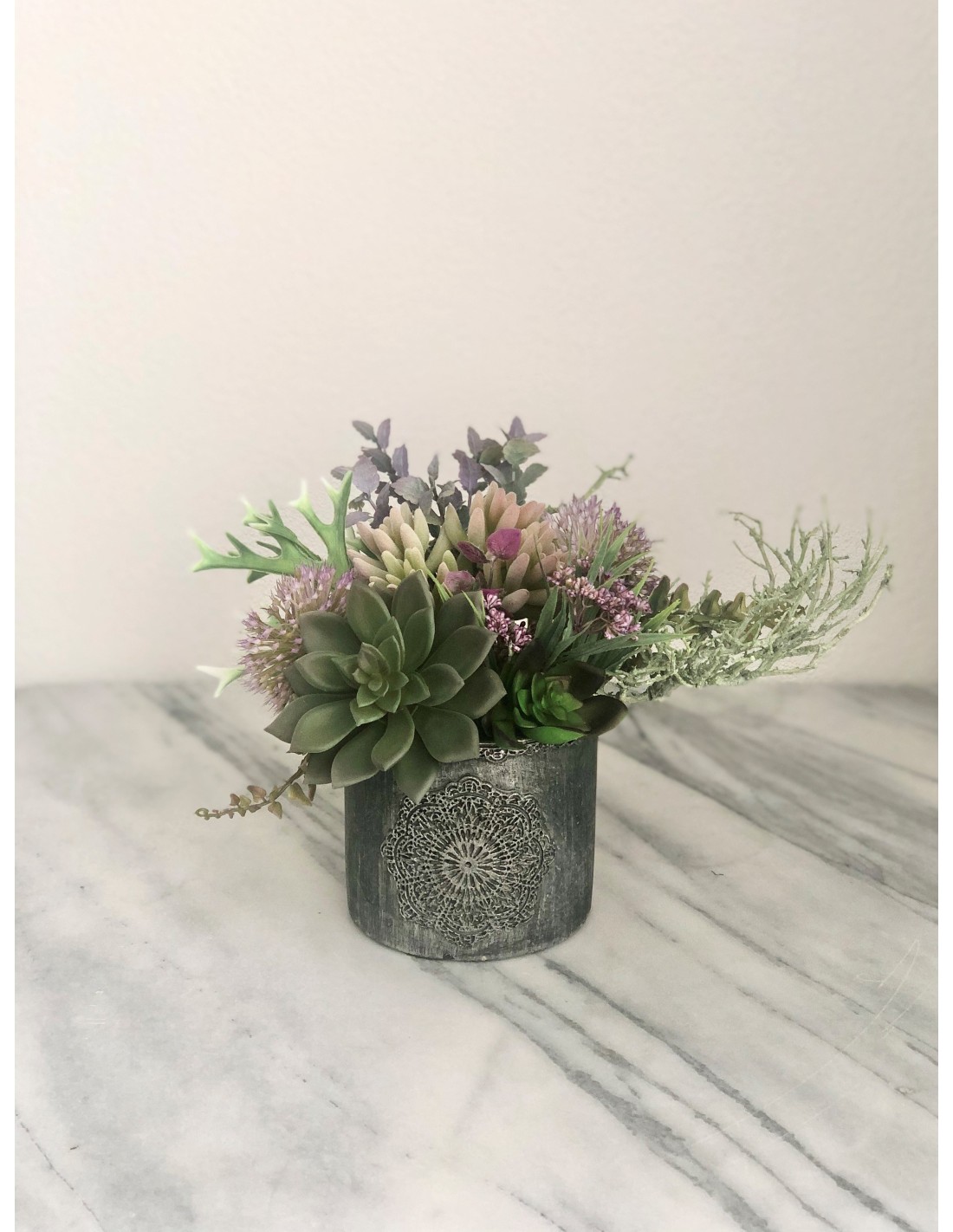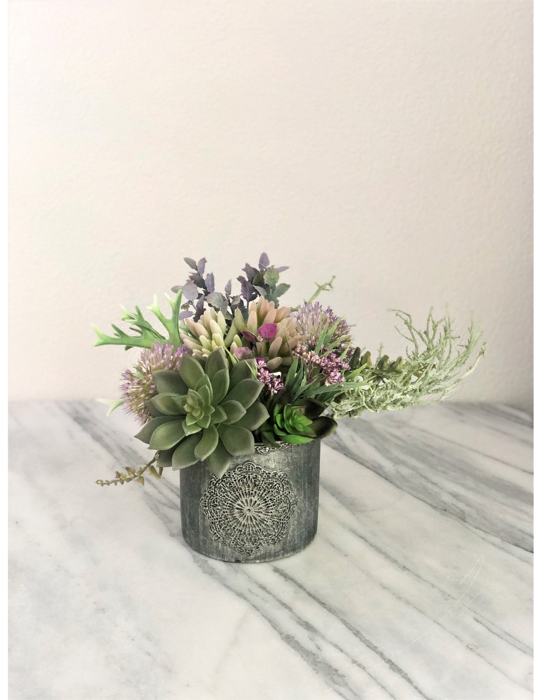 Diese wunderschöne künstliche Sukkulenten in einer Vase eignet sich hervorragend zur Dekoration auf Tischen, in Regalen oder auf Ablagen. Das Arrangement hat eine Höhe von ca. 21 cm., Breite von ca. 31 cm., Tiefe von ca. 25 cm.