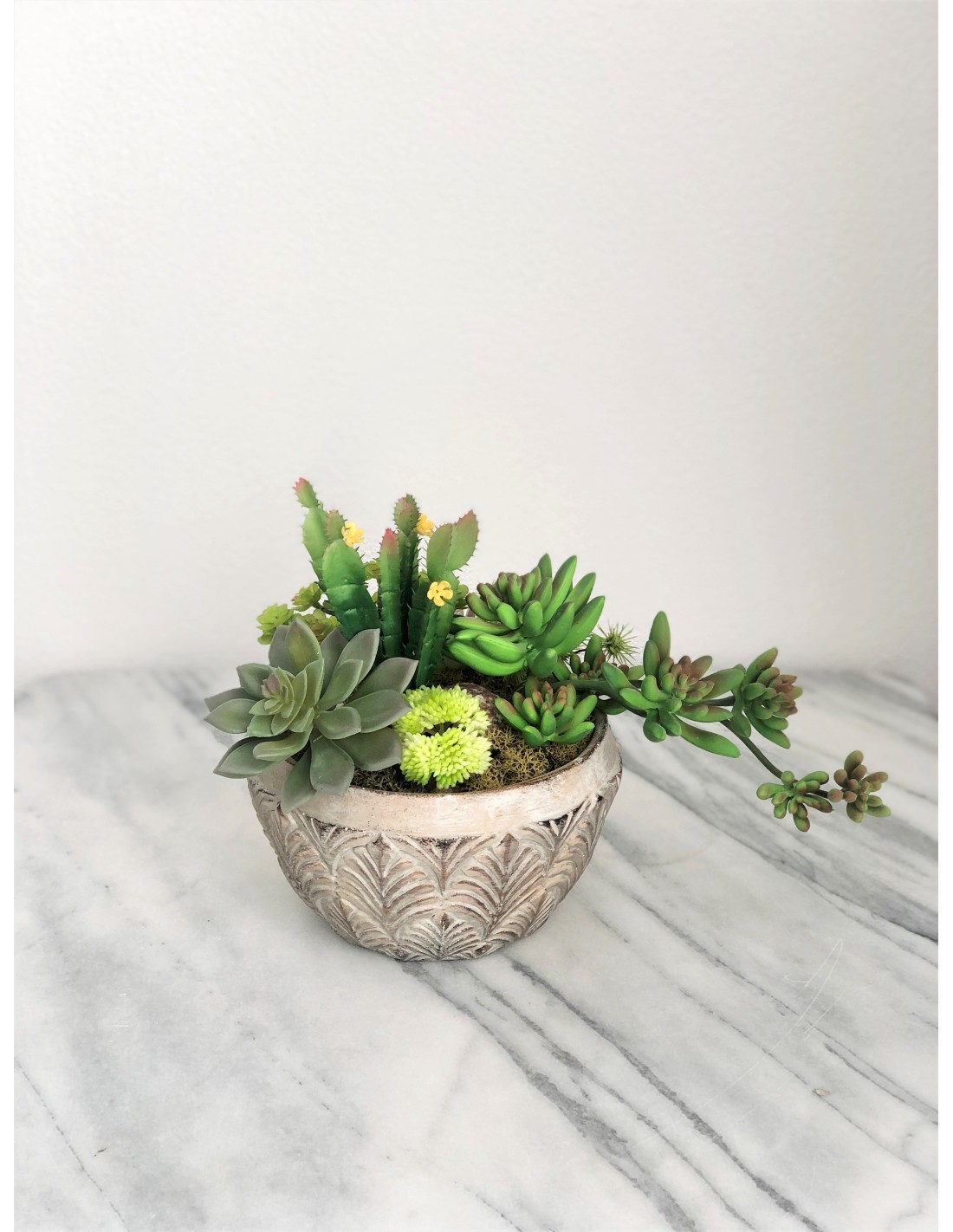 Diese wunderschöne künstliche Sukkulenten in einer Vase (aus Beton) eignet sich zur Dekoration auf Tischen, in Regalen oder auf Ablagen. Da die Sukkulente mit einer Vase arrangiert ist, ist diese Zusammenstellung ein Unikat.
