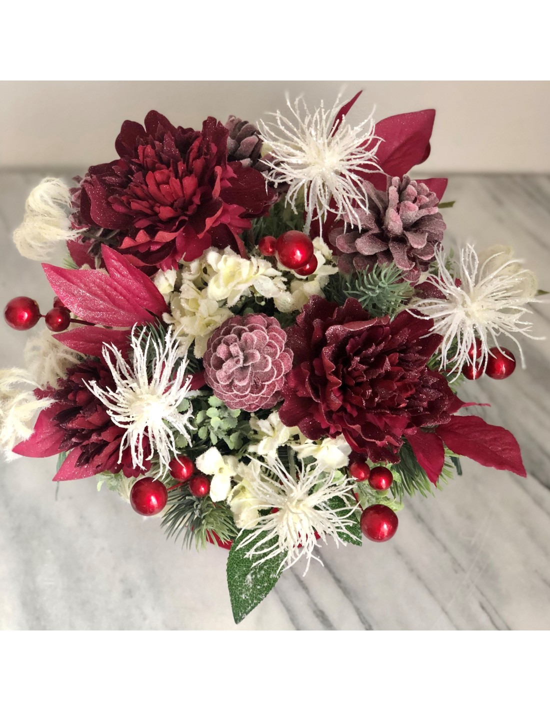 Das Arrangement hat eine Höhe von ca. 33 cm, Gesamtdurchmesser von ca. 33 cm.Dieses Weihnachtsarrangement mit seinen verschiedenen Weihnachtsmaterialien zaubert jedem großen Fest eine besondere Atmosphäre. Das Arrangement besteht aus Kunstmaterialien und ist mit dekorativen Kugeln, Zweigen, Rosenblüten sowie mit Tannenzapfen geschmückt.