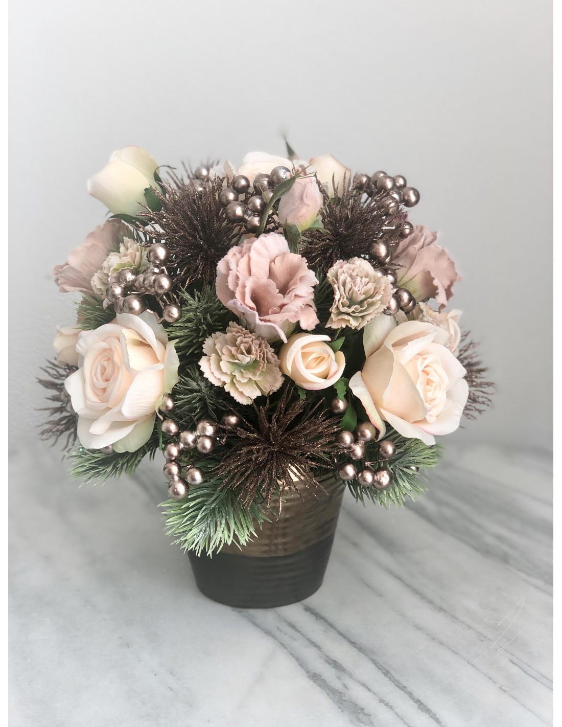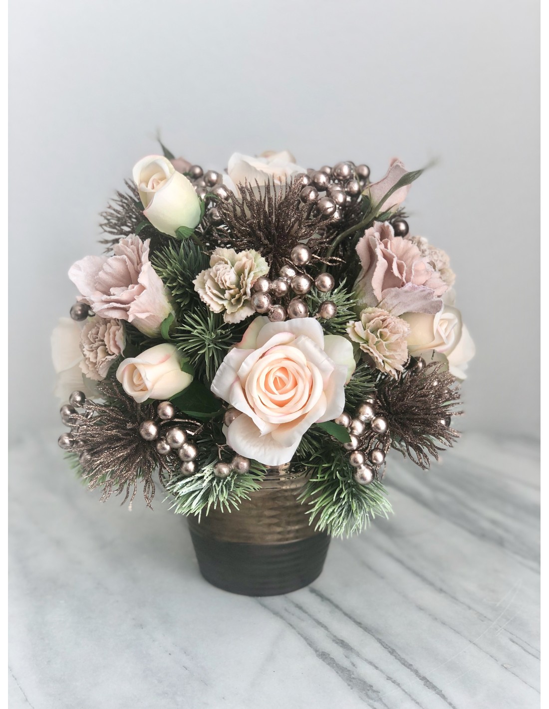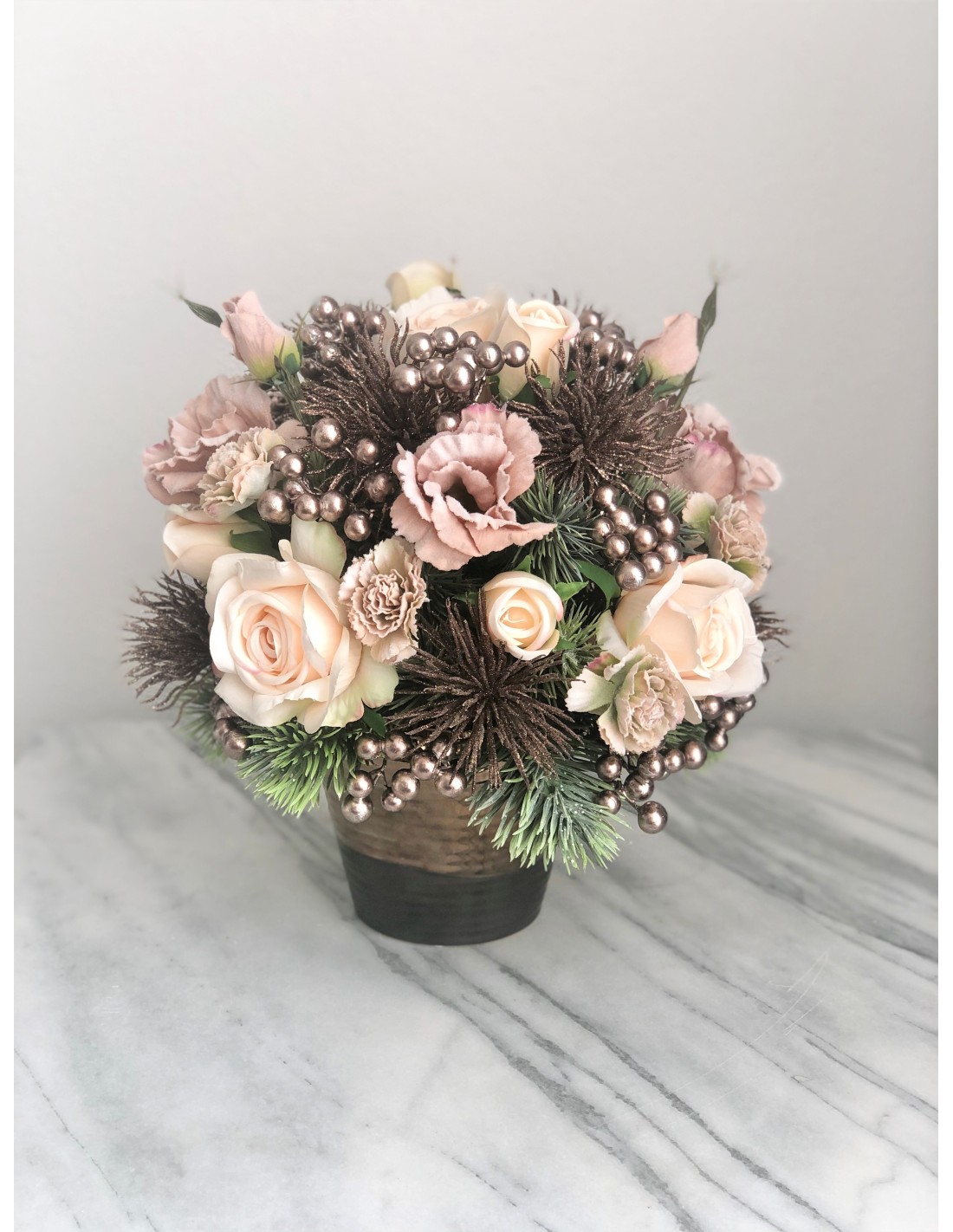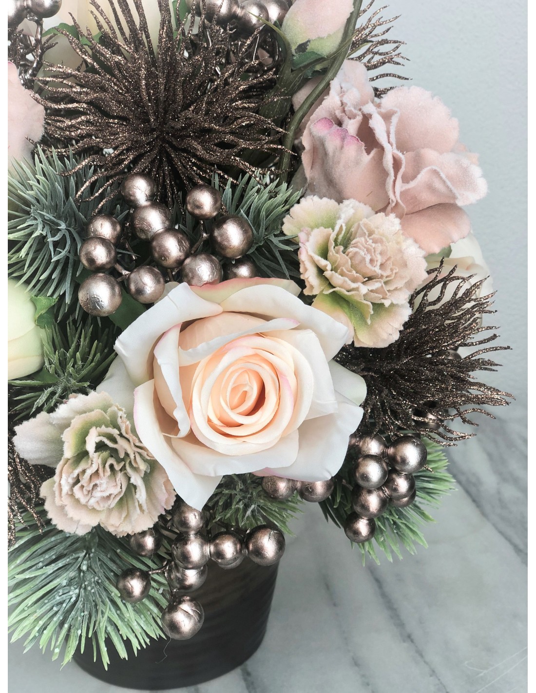 Das Arrangement hat eine Höhe von ca. 33 cm, Gesamtdurchmesser von ca. 32 cm.Dieses Weihnachtsarrangement mit seinen verschiedenen Weihnachtsmaterialien zaubert jedem großen Fest eine besondere Atmosphäre. Das Arrangement besteht aus Kunstmaterialien und ist mit dekorativen Kugeln, Zweigen, Beeren, Rosen sowie mit Tannenzapfen geschmückt.