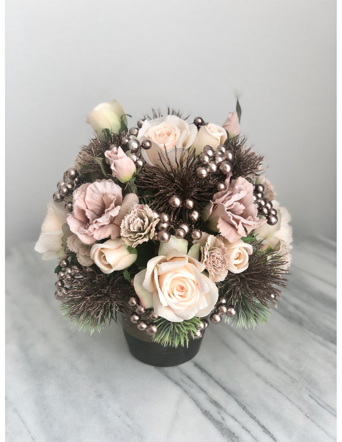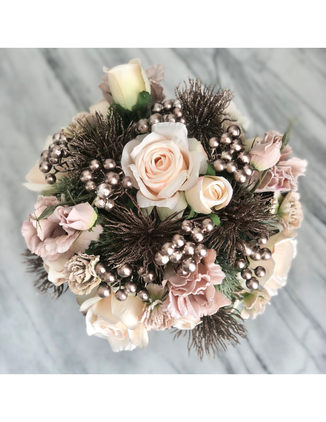 Das Arrangement hat eine Höhe von ca. 33 cm, Gesamtdurchmesser von ca. 32 cm.