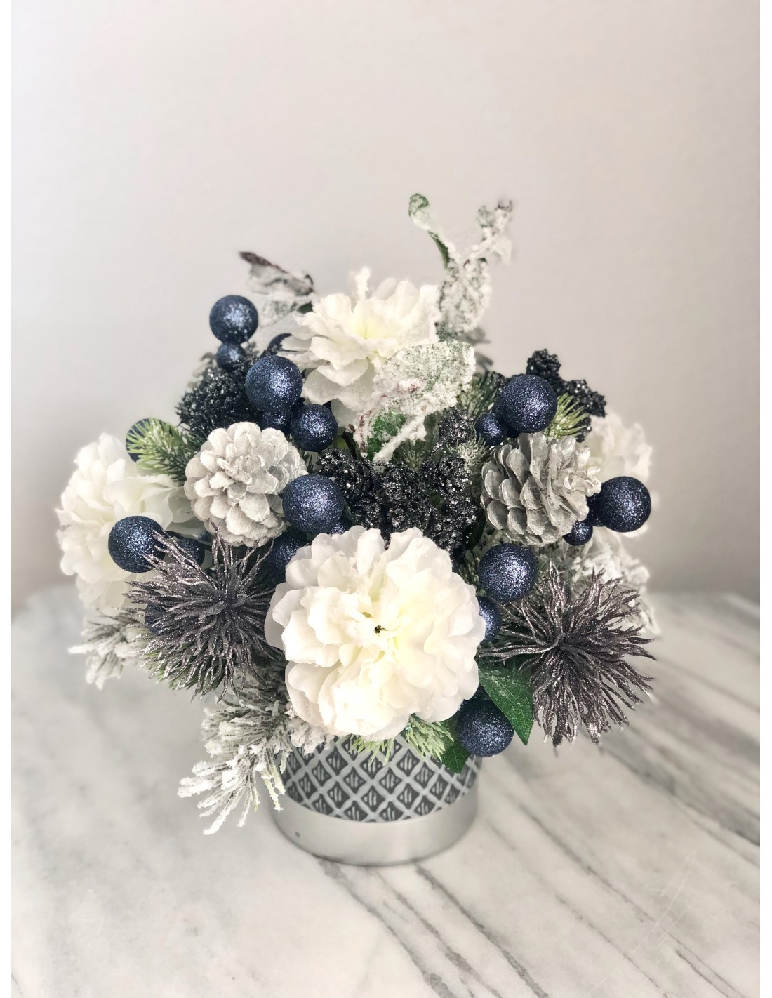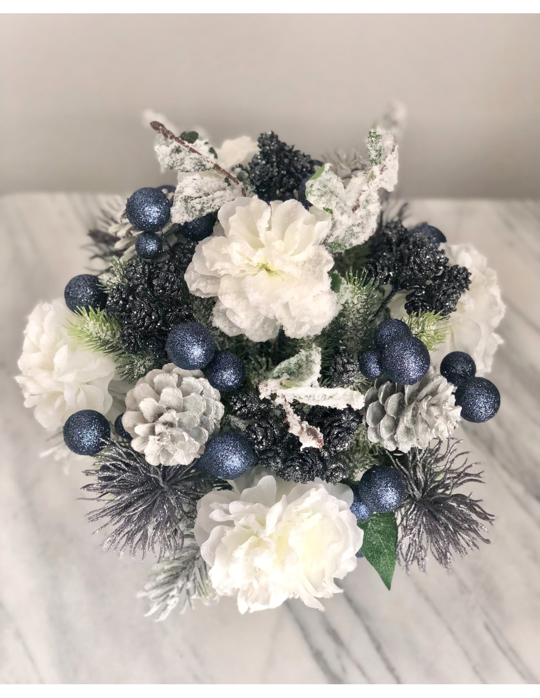 Das Arrangement hat eine Höhe von ca. 35 cm, Gesamtdurchmesser von ca. 36 cm.Dieses Weihnachtsarrangement mit seinen verschiedenen Weihnachtsmaterialien zaubert jedem großen Fest eine besondere Atmosphäre. Das Arrangement besteht aus Kunstmaterialien und ist mit dekorativen Kugeln, Zweigen, Beeren, Rosen sowie mit Tannenzapfen geschmückt.