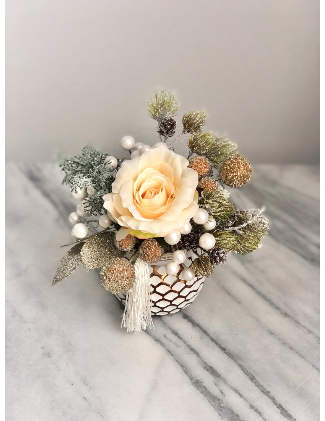 Dieses Weihnachtsarrangement mit seinen verschiedenen Weihnachtsmaterialien zaubert jedem großen Fest eine besondere Atmosphäre. Das Arrangement besteht aus Kunstmaterialien und ist mit dekorativen Kugeln, Zweigen, Beeren, Rose sowie mit Tannenzapfen geschmückt.