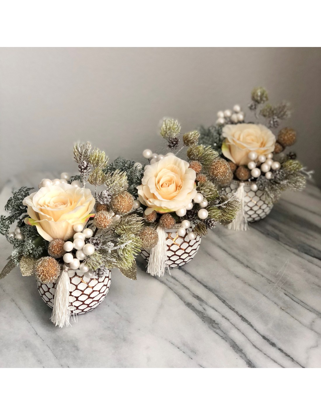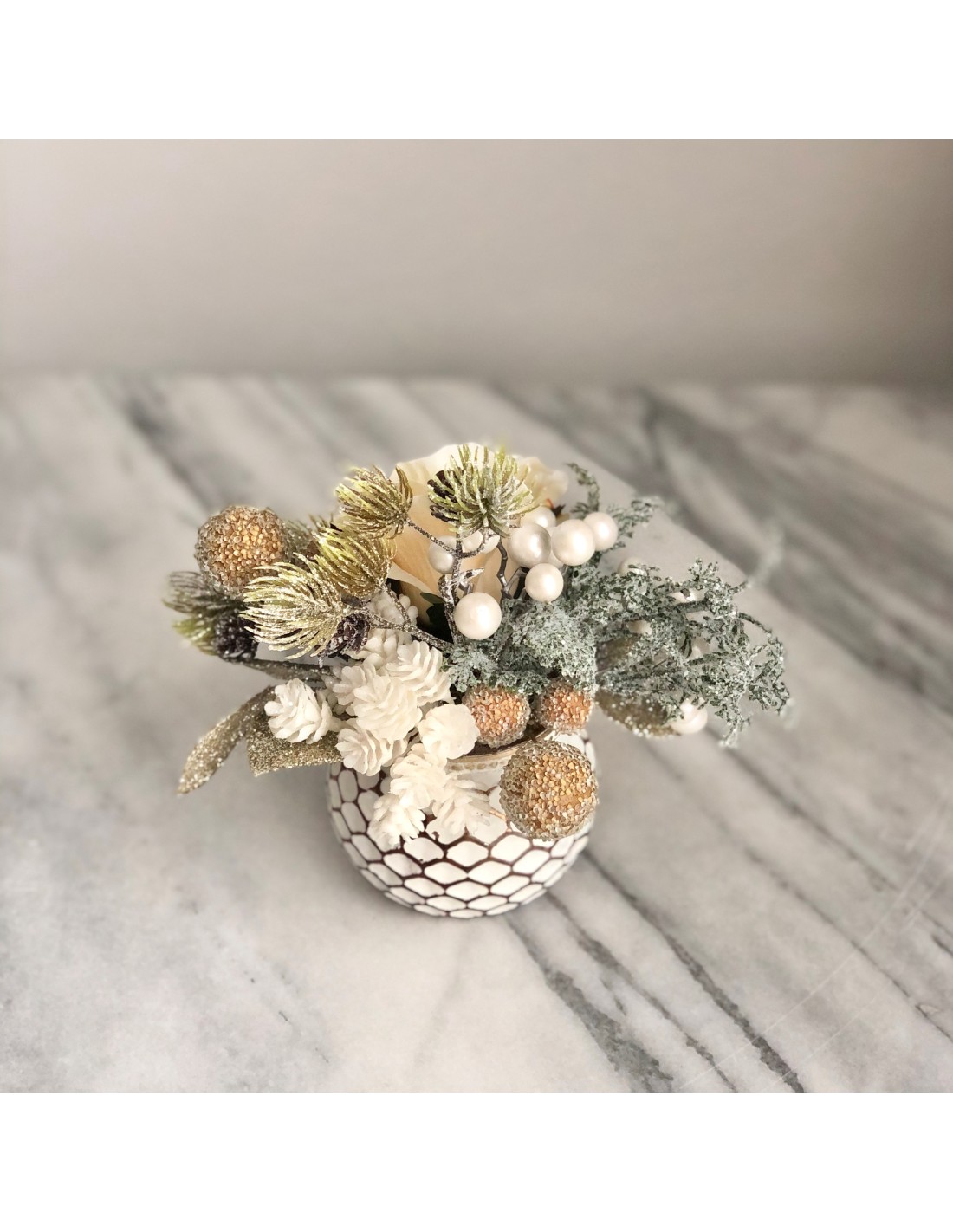 Das Arrangement hat eine Höhe von ca. 21 cm, Gesamtdurchmesser von ca. 18 cm.Dieses Weihnachtsarrangement mit seinen verschiedenen Weihnachtsmaterialien zaubert jedem großen Fest eine besondere Atmosphäre. Das Arrangement besteht aus Kunstmaterialien und ist mit dekorativen Kugeln, Zweigen, Beeren, Rose sowie mit Tannenzapfen geschmückt.
